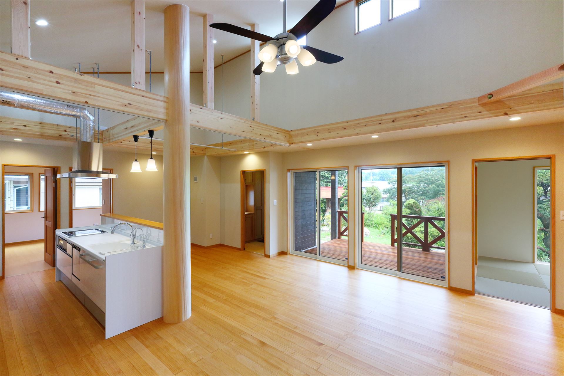 無垢の丸い大黒柱と大きな吹抜けのある空間になっているのが特徴です。