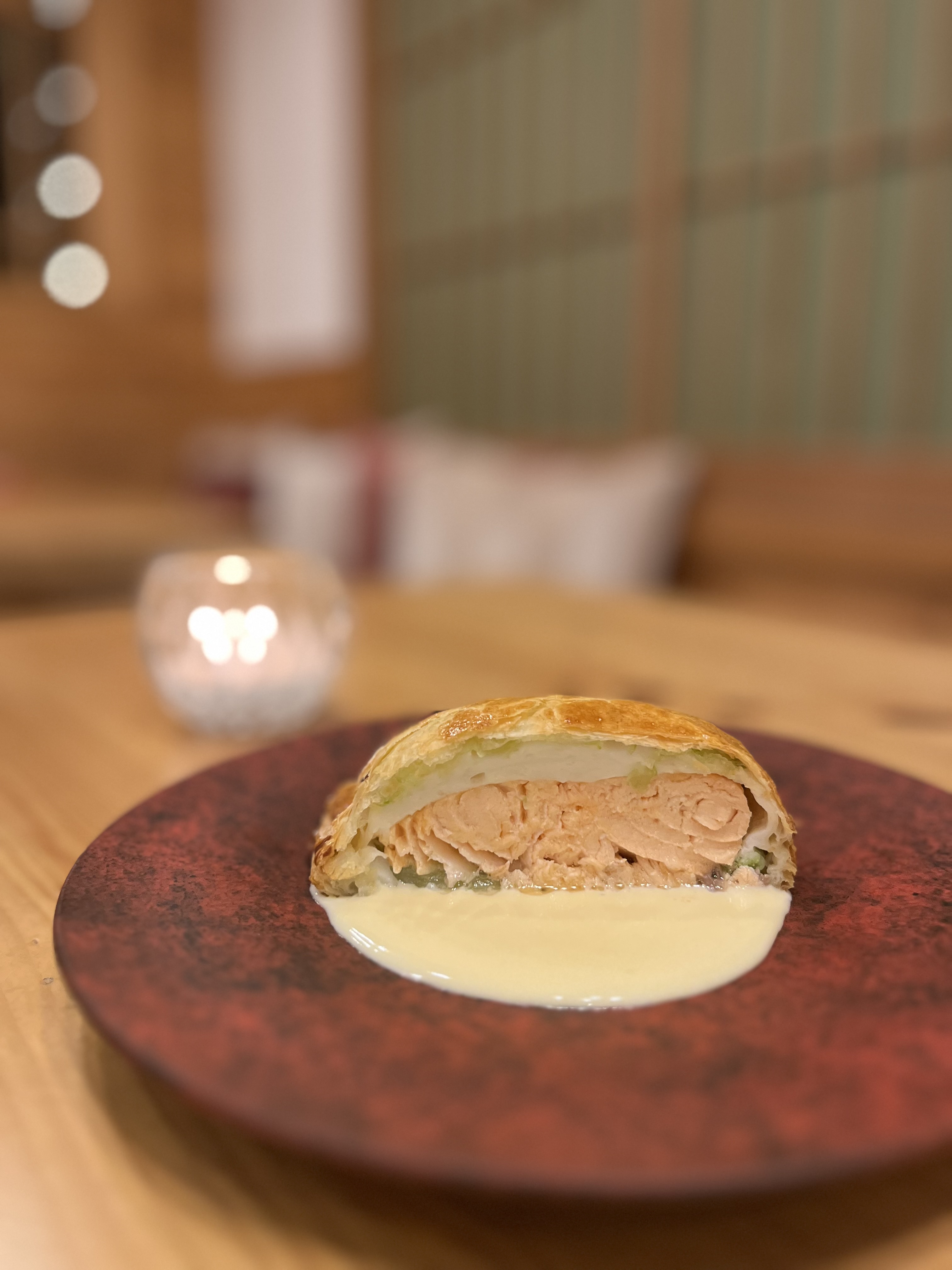 サーモンの上にイトヨリダイ(白身魚)のムースを乗せ、