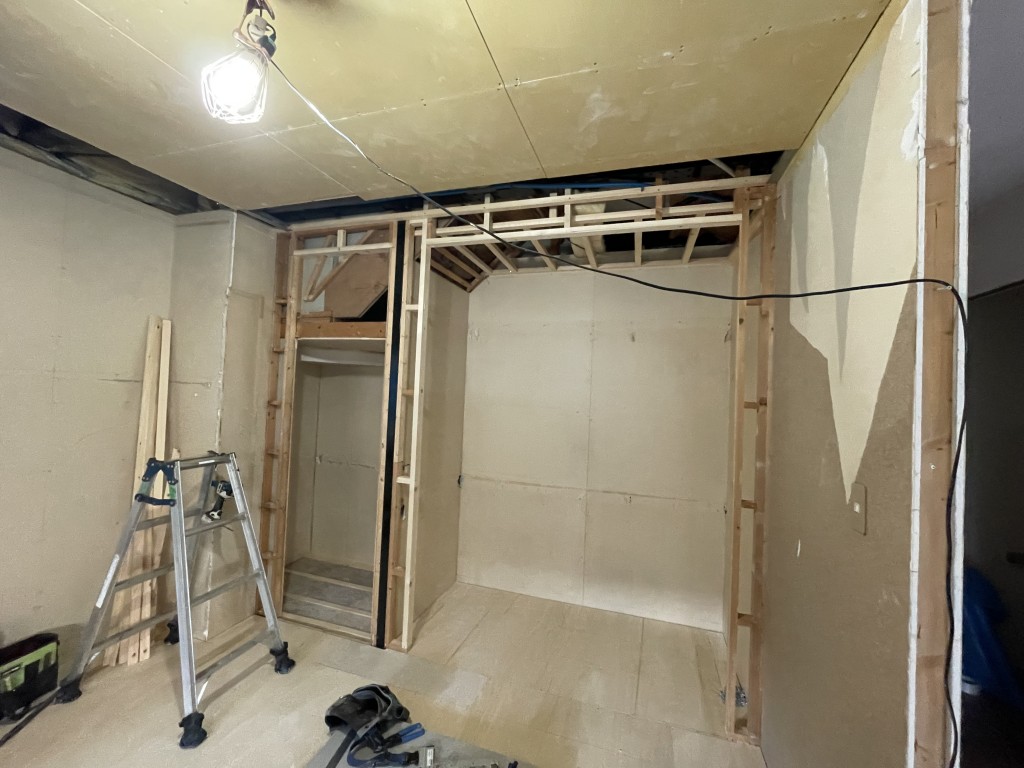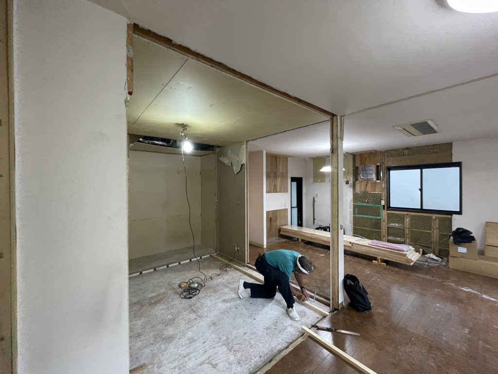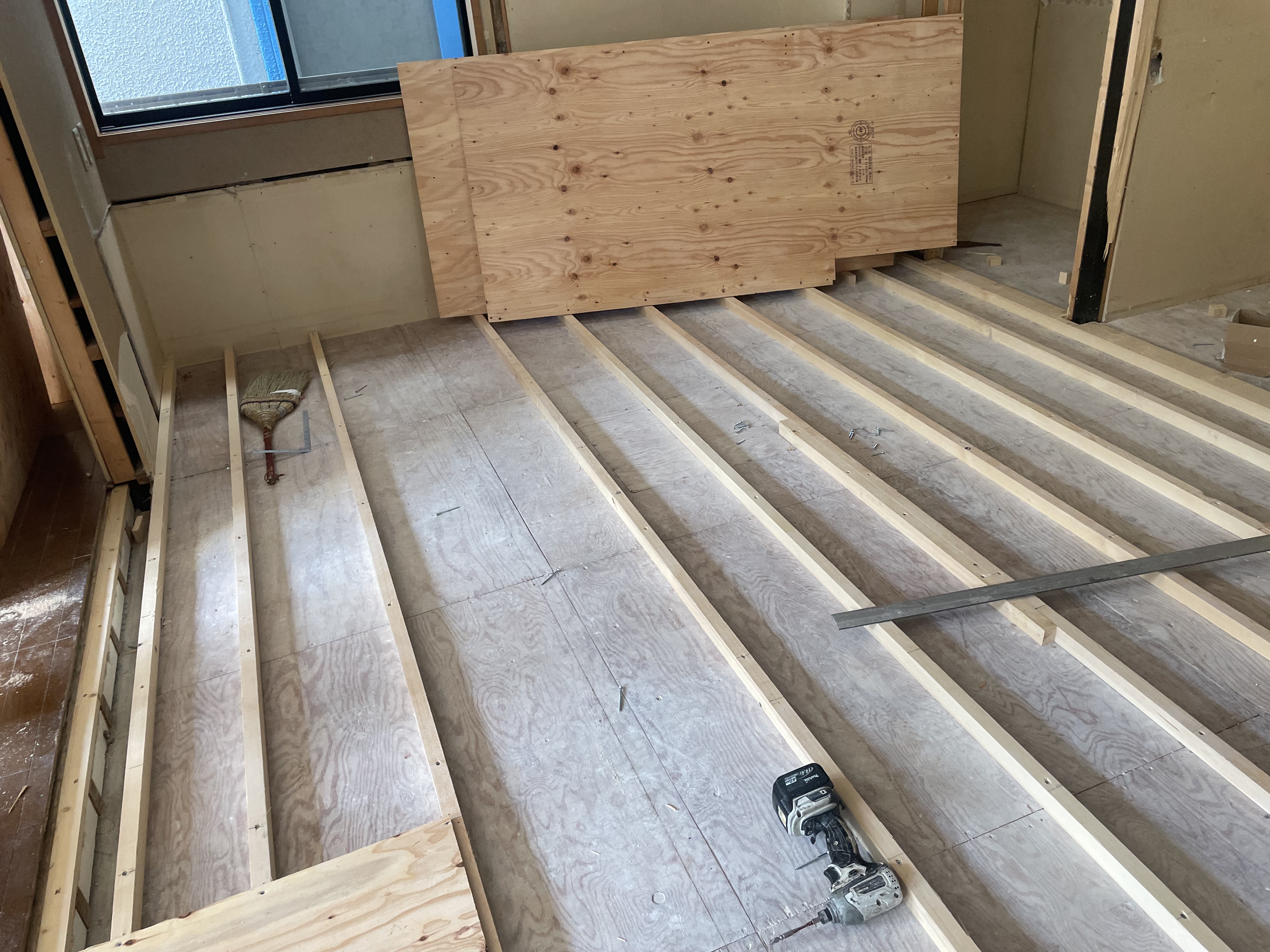旧和室の床下地(根太)を組み、構造用合板を下貼りしてリビングの床とバリアフリーにして行きます。