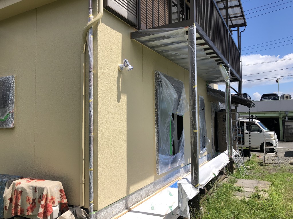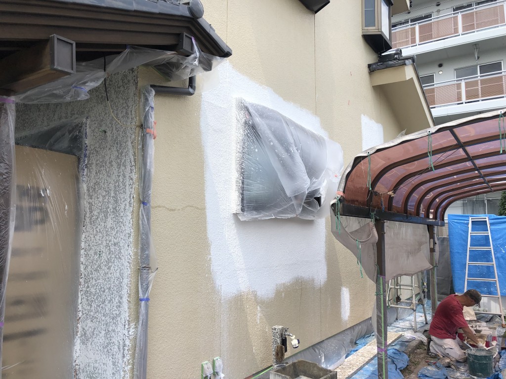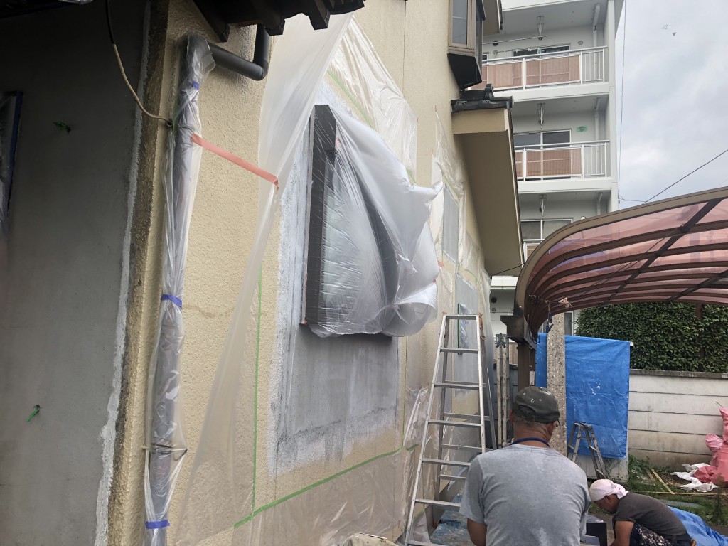 サッシを養生して塗装屋さんが吹付の準備をしています。