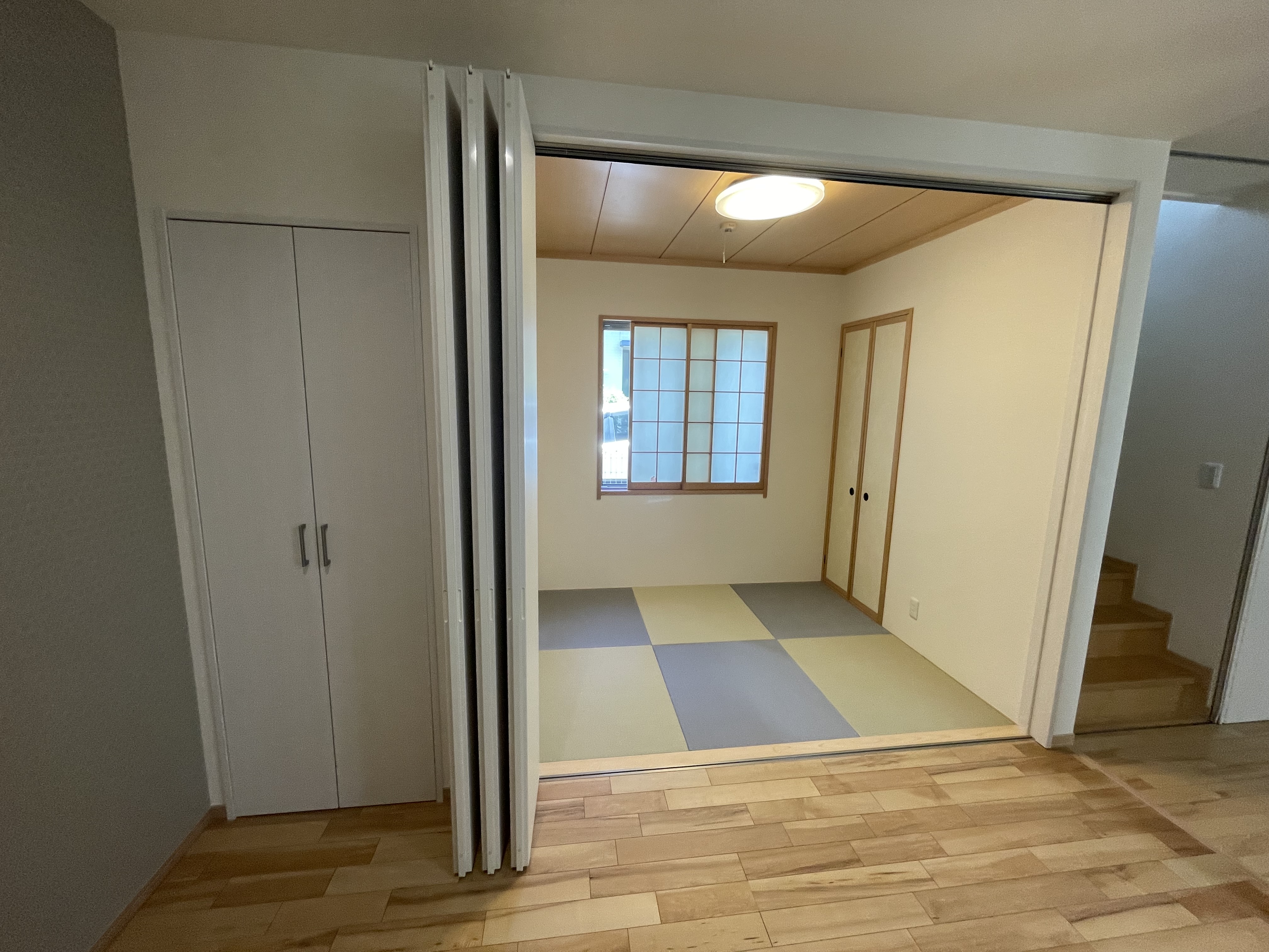 全開にできる「間仕切り開閉壁」や、半帖のへりなしカラー畳は当社で良く使うデザインです。