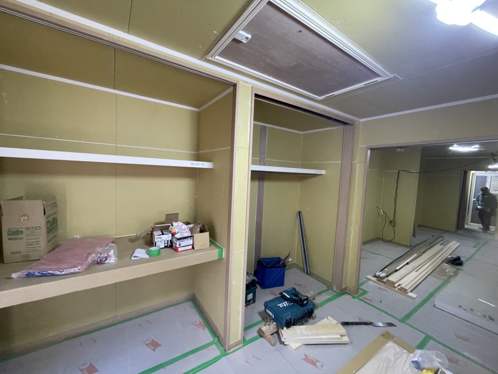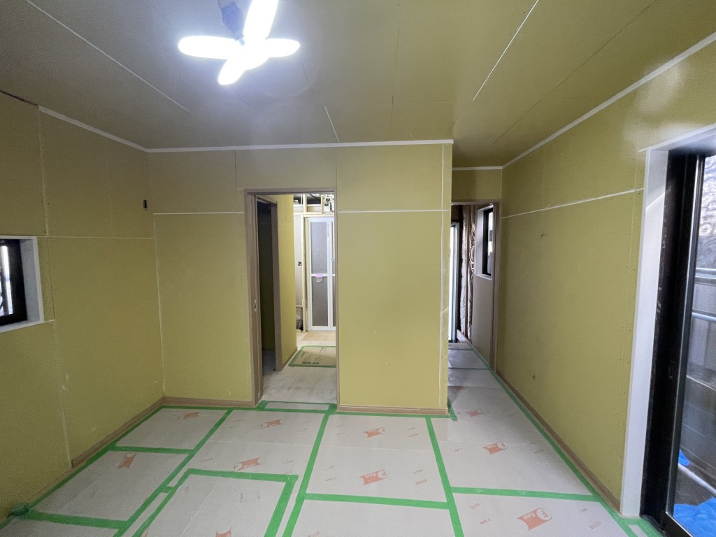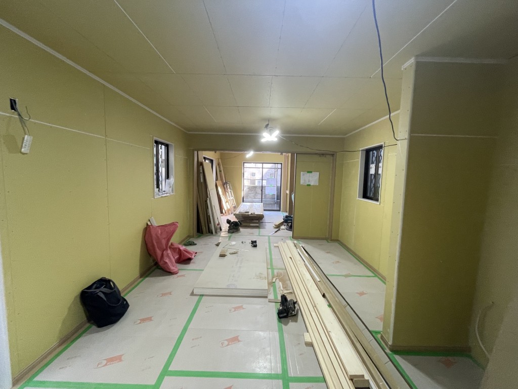 大工さんが耐震補強や断熱工事を行った後、壁と天井に石膏ボードを貼っています。