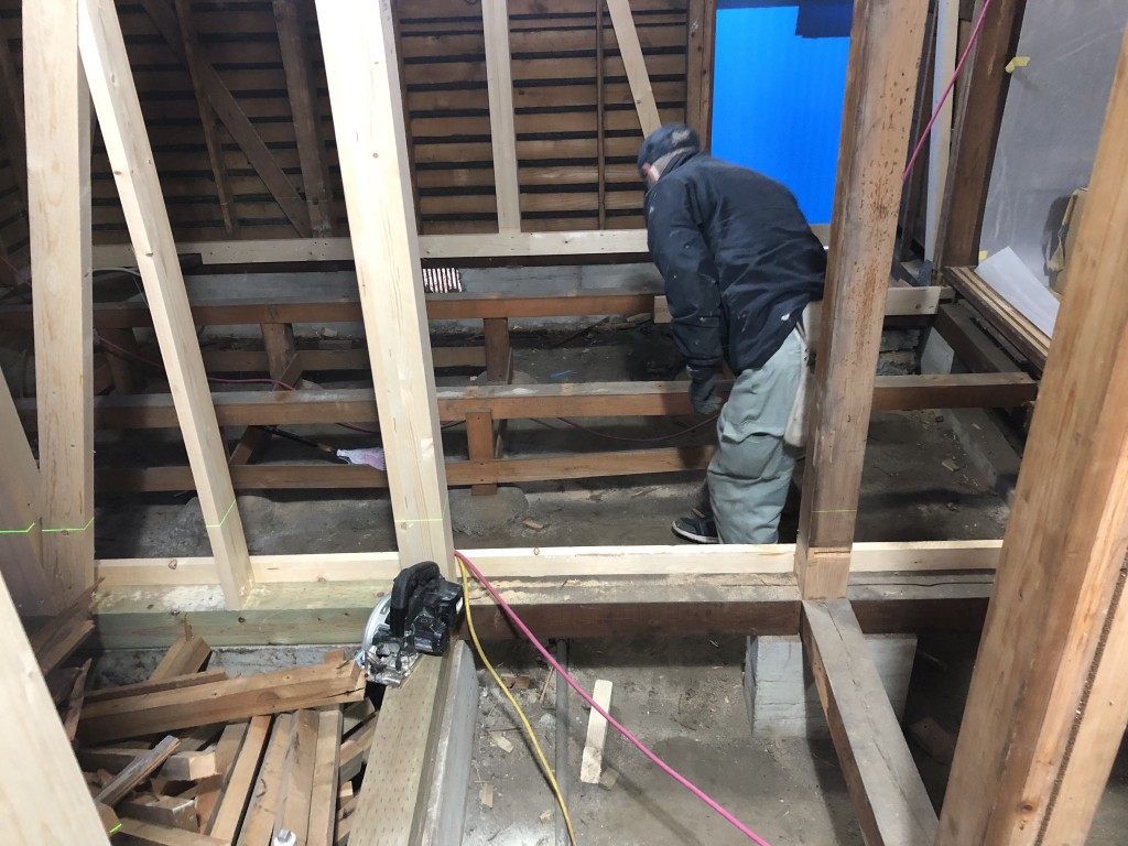 ベテランのS大工さんが躯体の補強工事を行っています。
