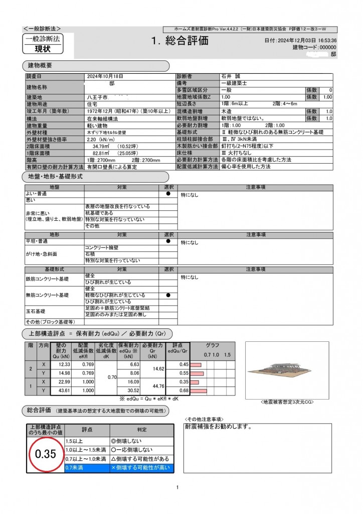 年末に耐震診断を行い耐震診断ソフトで計算したところ耐震の評価点(評点)はわずか0.35で、