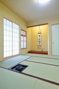 縁側付きのゆったりとした8帖間に炉を切り、を念願の茶室に。