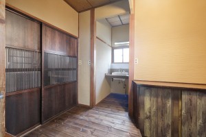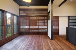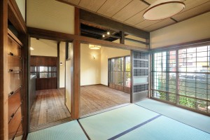 LDKと隣接する和室の境には、時代箪笥・建具の専門店「古福庵」の古建具を調整・加工して設置。