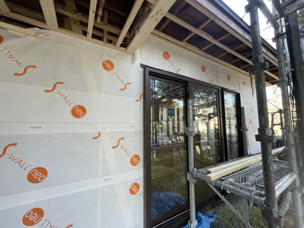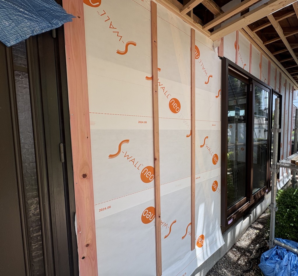 防水シートが貼り終わりサイディングを貼るために必要な胴縁を設置![]()