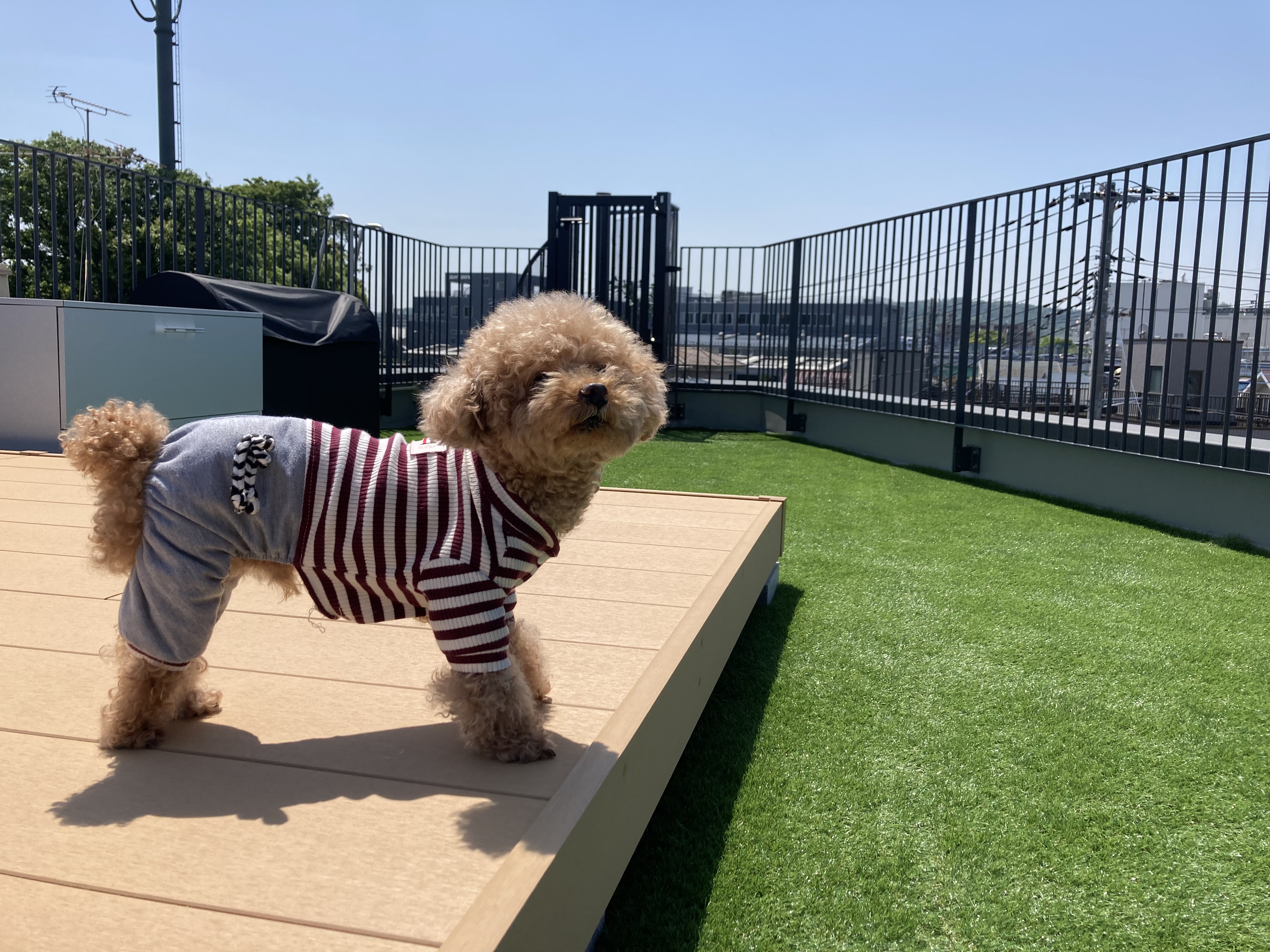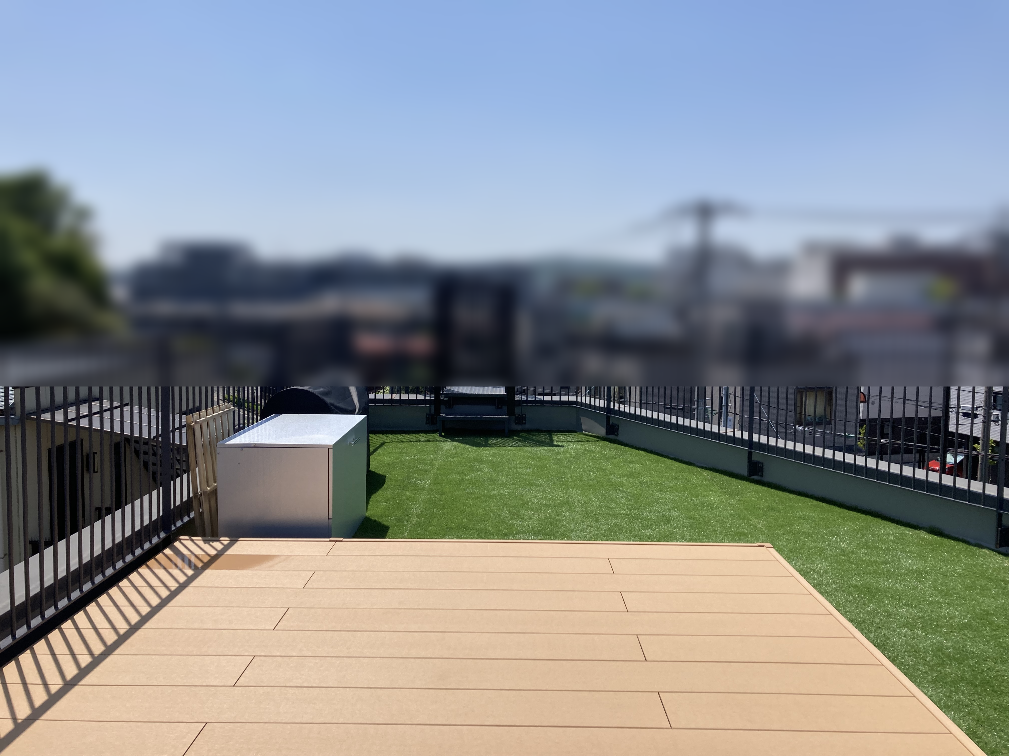屋上は全面人工芝敷き・人工木デッキも設置しました![]()