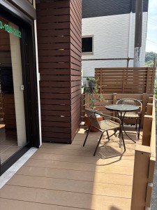 昼間は日当たりが良すぎるウッドデッキですが、早朝や夕方は気持ちよく過ごせます。