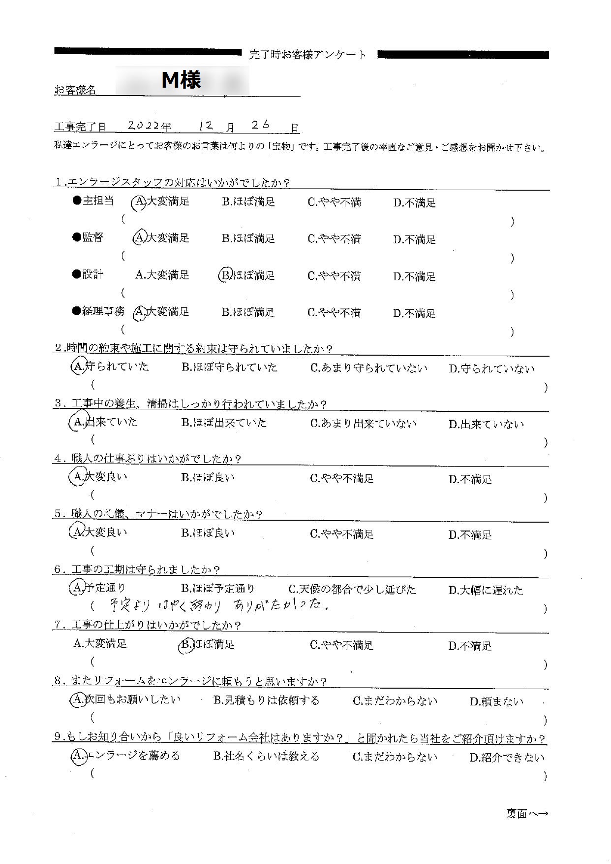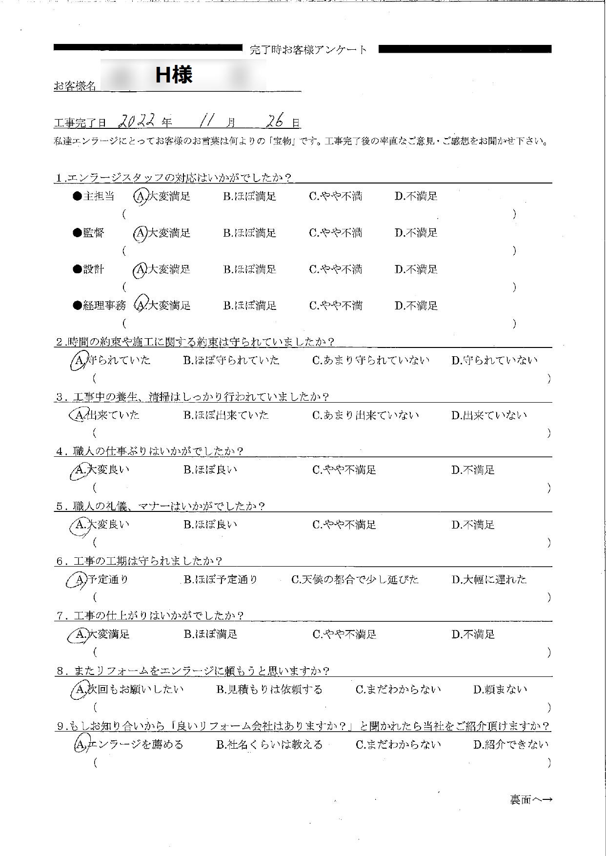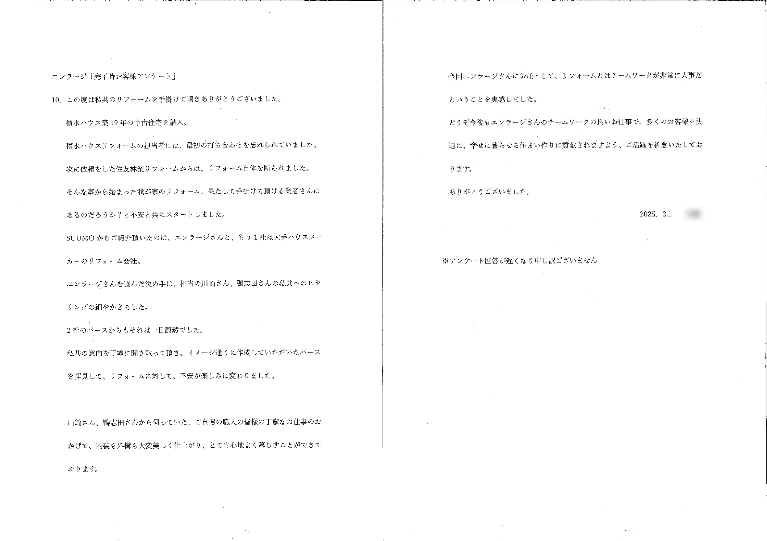 H様 この度は大切なお住まいのリフォームを弊社にお任せいただき、誠にありがとうございました。私が担当させていただくのは今回が初めてでしたが、奥様と出身校が同じというご縁もあり、お打合せから完工まで楽しく進めさせていただきました。ご希望のタイルに合わせて、浴室のカラーや洗面室の設備・内装をご提案させていただき、完成後にお喜びいただけたことを大変嬉しく思っております。今後、LDKのリフォームをご検討の際には、ぜひまたお力になれれば幸いです。これからも末永いお付き合いをどうぞよろしくお願いいたします。 プランナー 松村