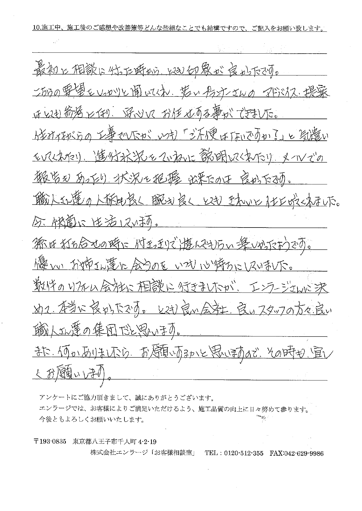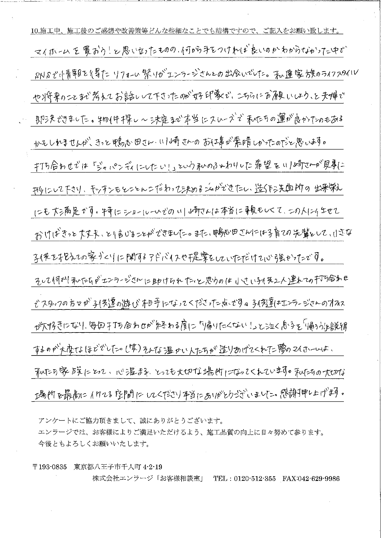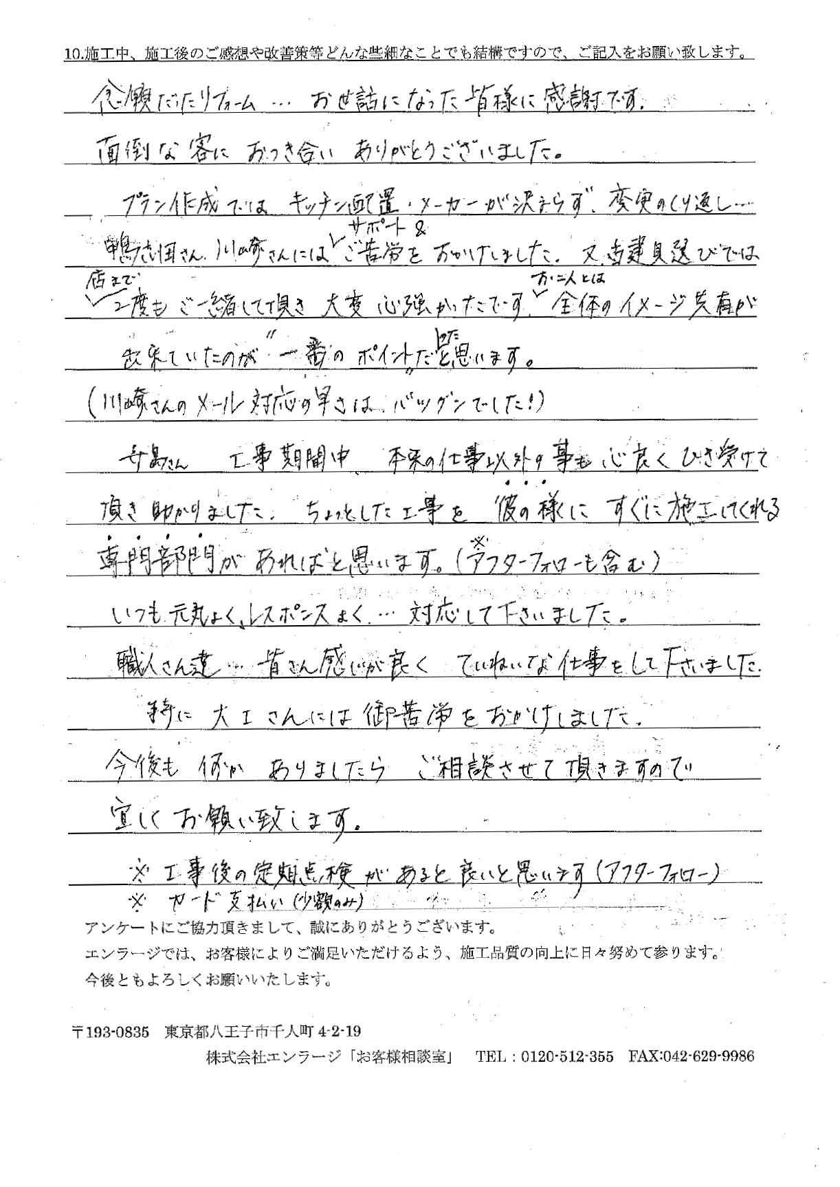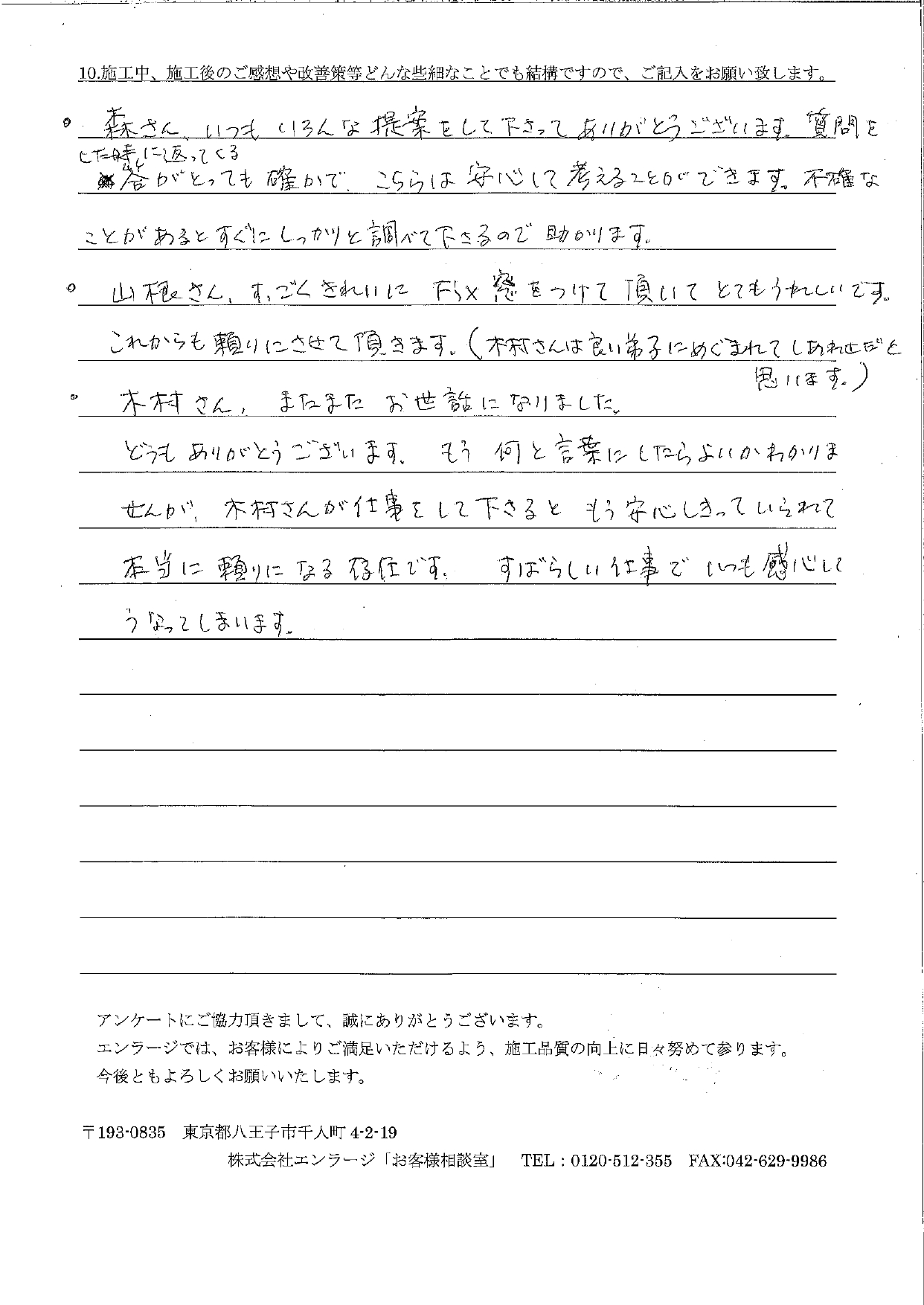 N様 この度は大切なお住まいのリフォームをお任せいただき、誠にありがとうございました。N様とは弊社主催のイベント「八王子市民リフォーム祭」で初めてお会いし、その際からご提案をとても喜んでいただけたことを今でも印象深く覚えています。ぜひお力になりたい!という思いで、私自身も全力で取り組ませていただきました。