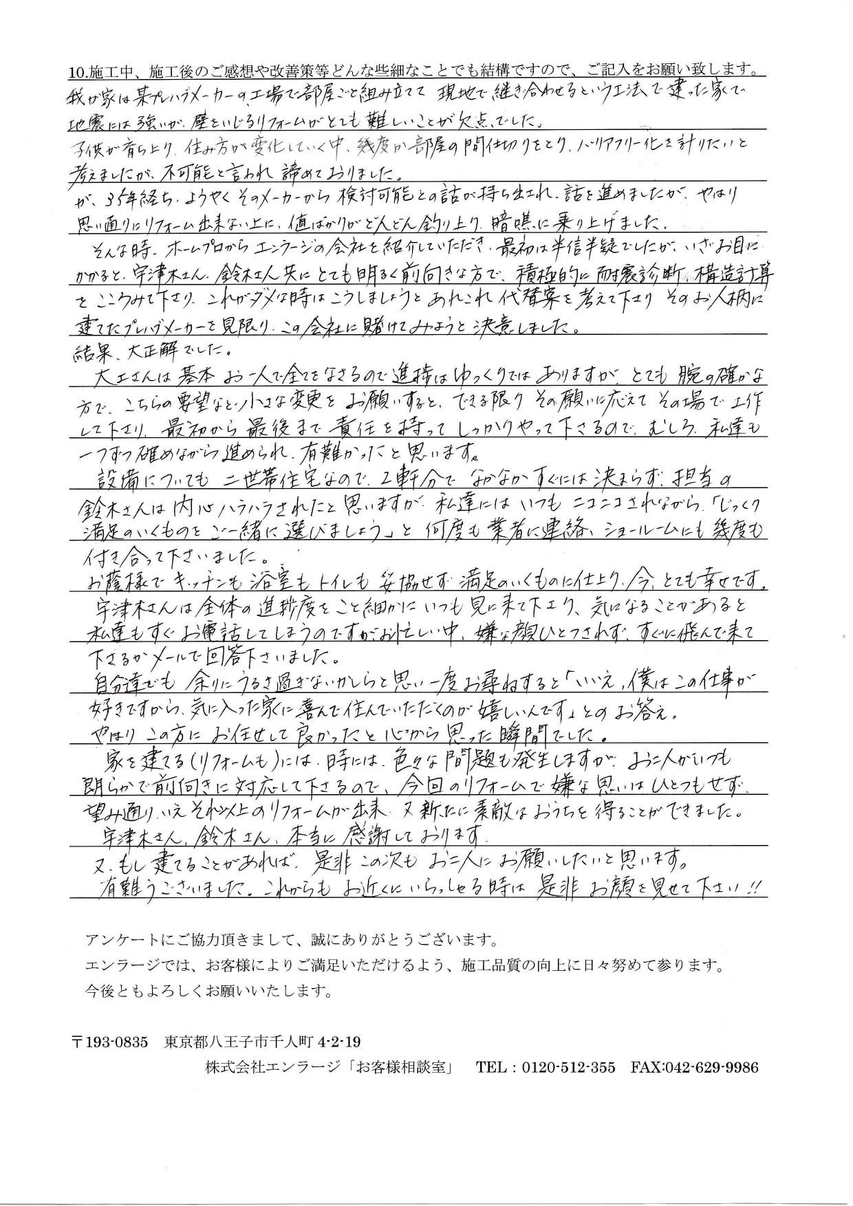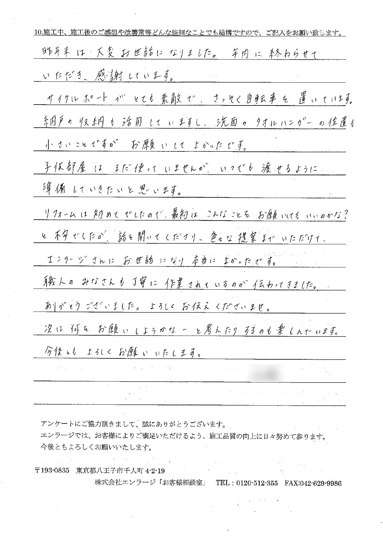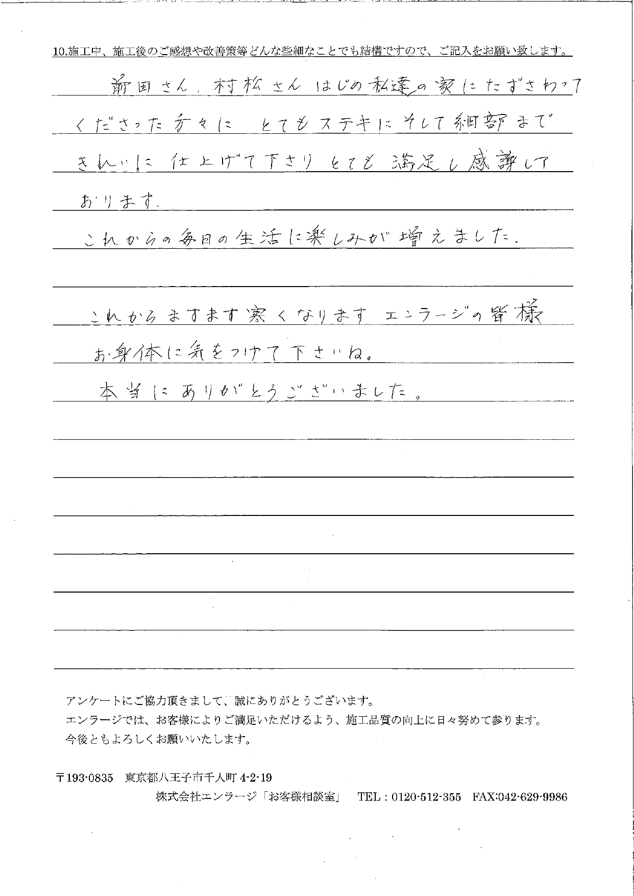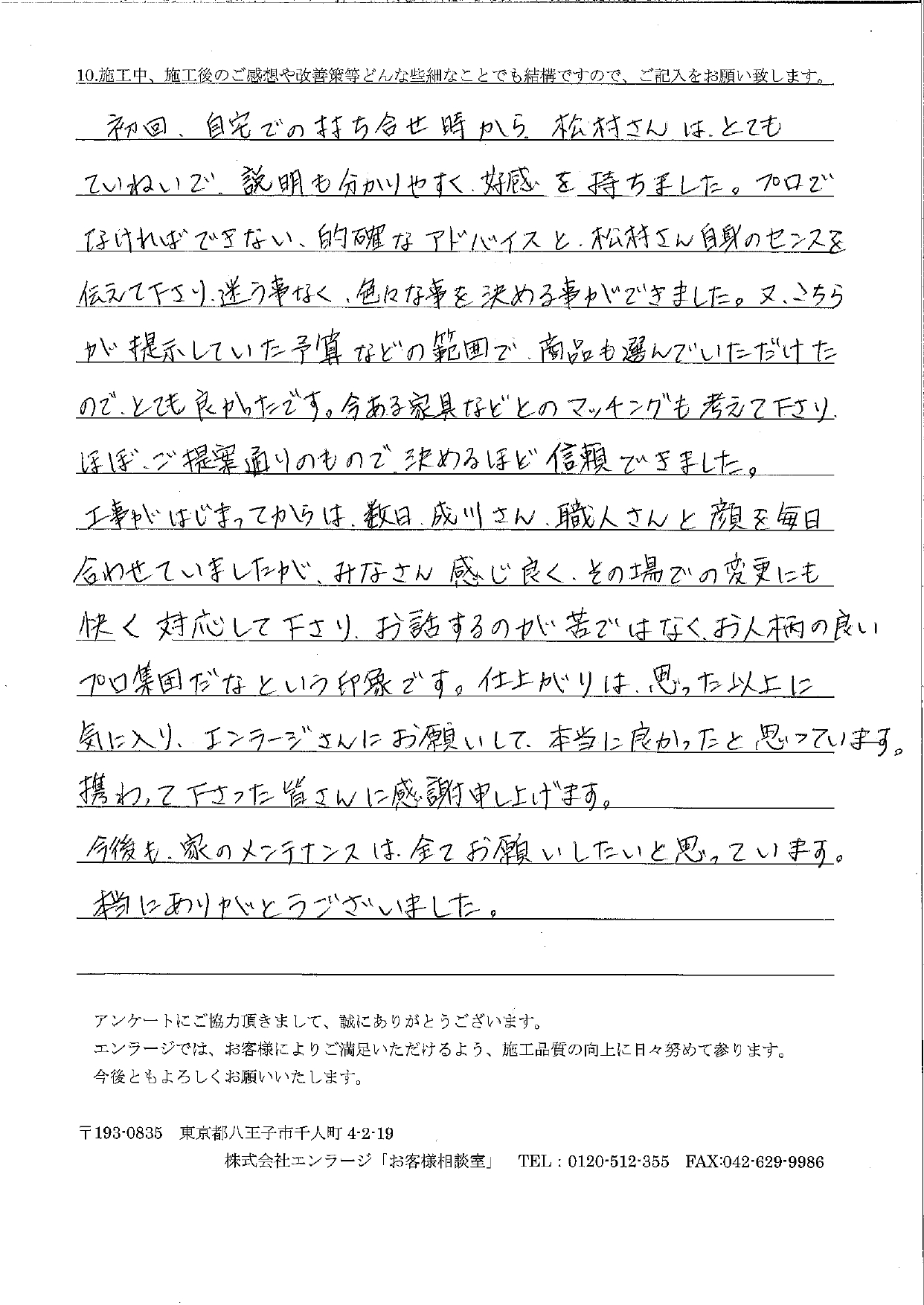 N様 この度は大切なお住まいのリフォームをお任せいただき、誠にありがとうございました。N様とは弊社主催のイベント「八王子市民リフォーム祭」で初めてお会いし、その際からご提案をとても喜んでいただけたことを今でも印象深く覚えています。ぜひお力になりたい!という思いで、私自身も全力で取り組ませていただきました。