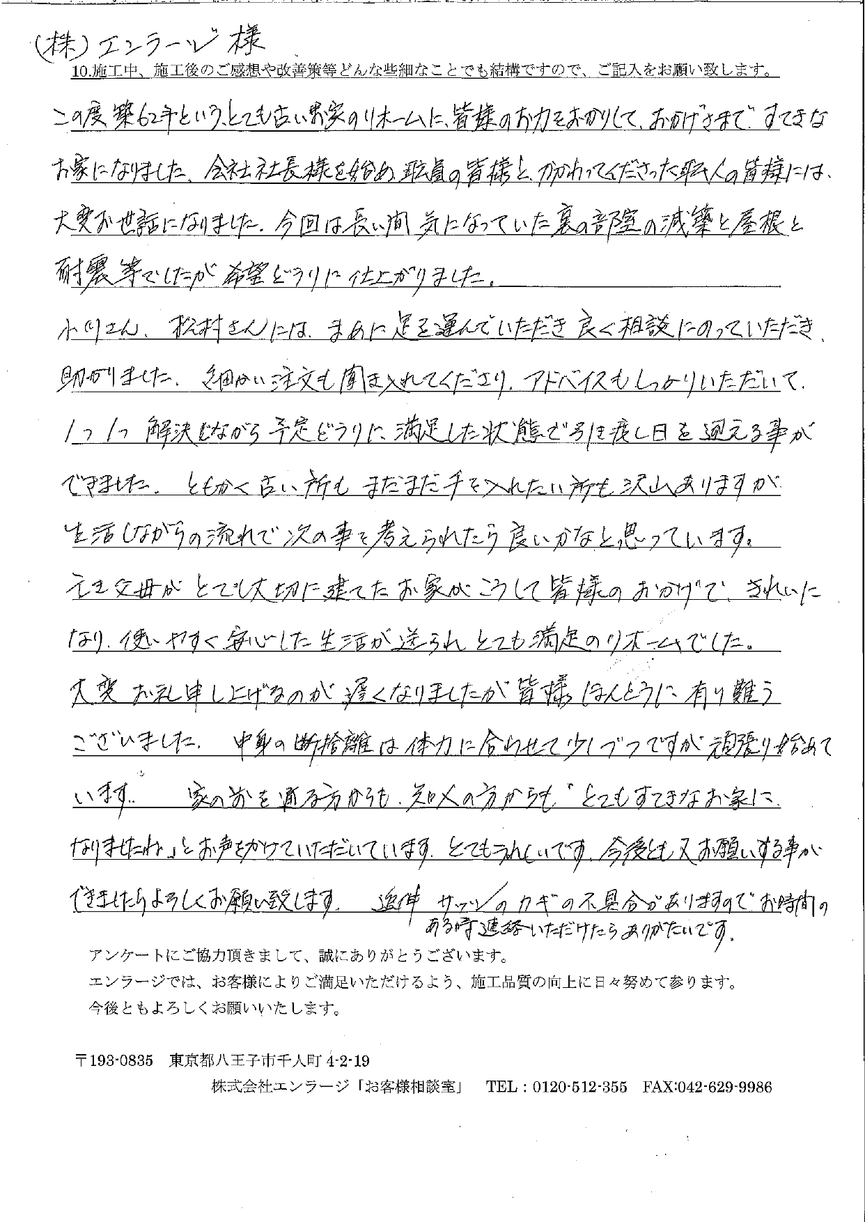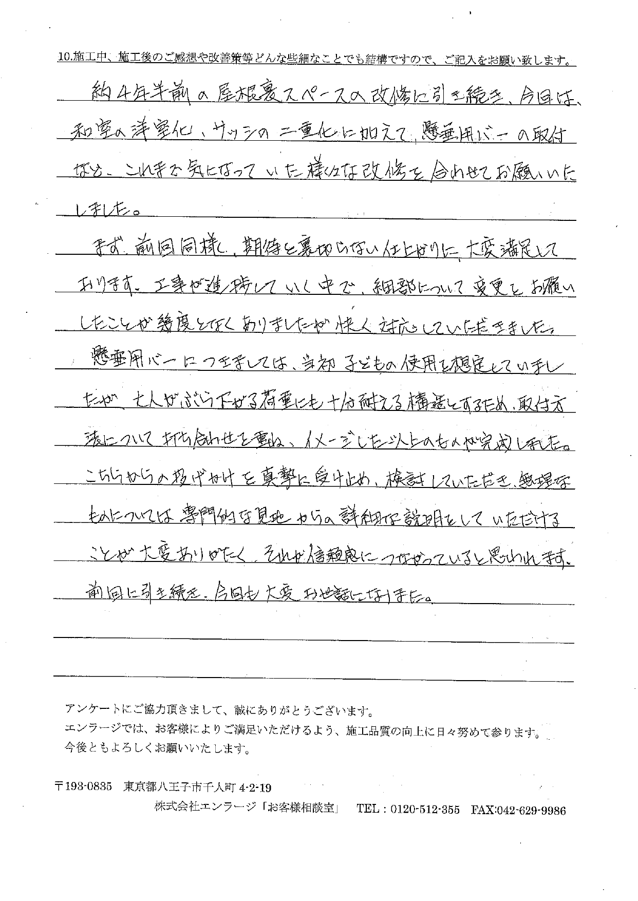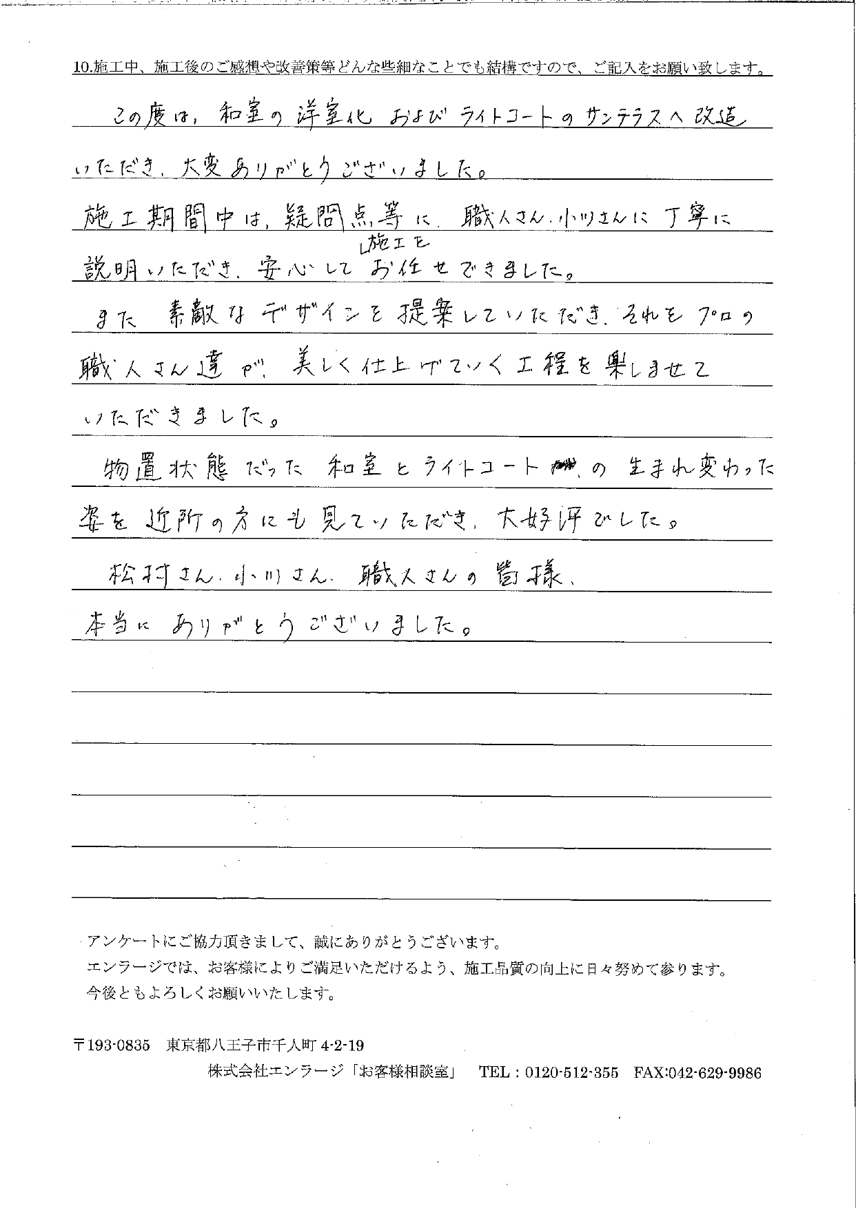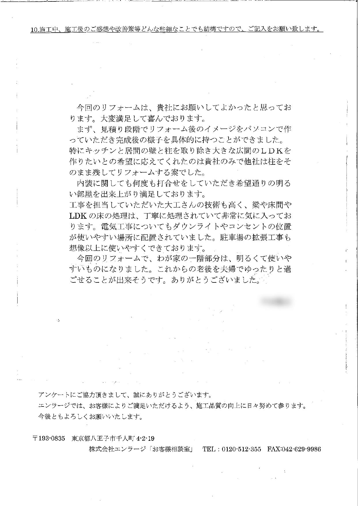 N様 この度は大切なお住まいのリフォームをお任せいただき、誠にありがとうございました。N様とは弊社主催のイベント「八王子市民リフォーム祭」で初めてお会いし、その際からご提案をとても喜んでいただけたことを今でも印象深く覚えています。ぜひお力になりたい!という思いで、私自身も全力で取り組ませていただきました。