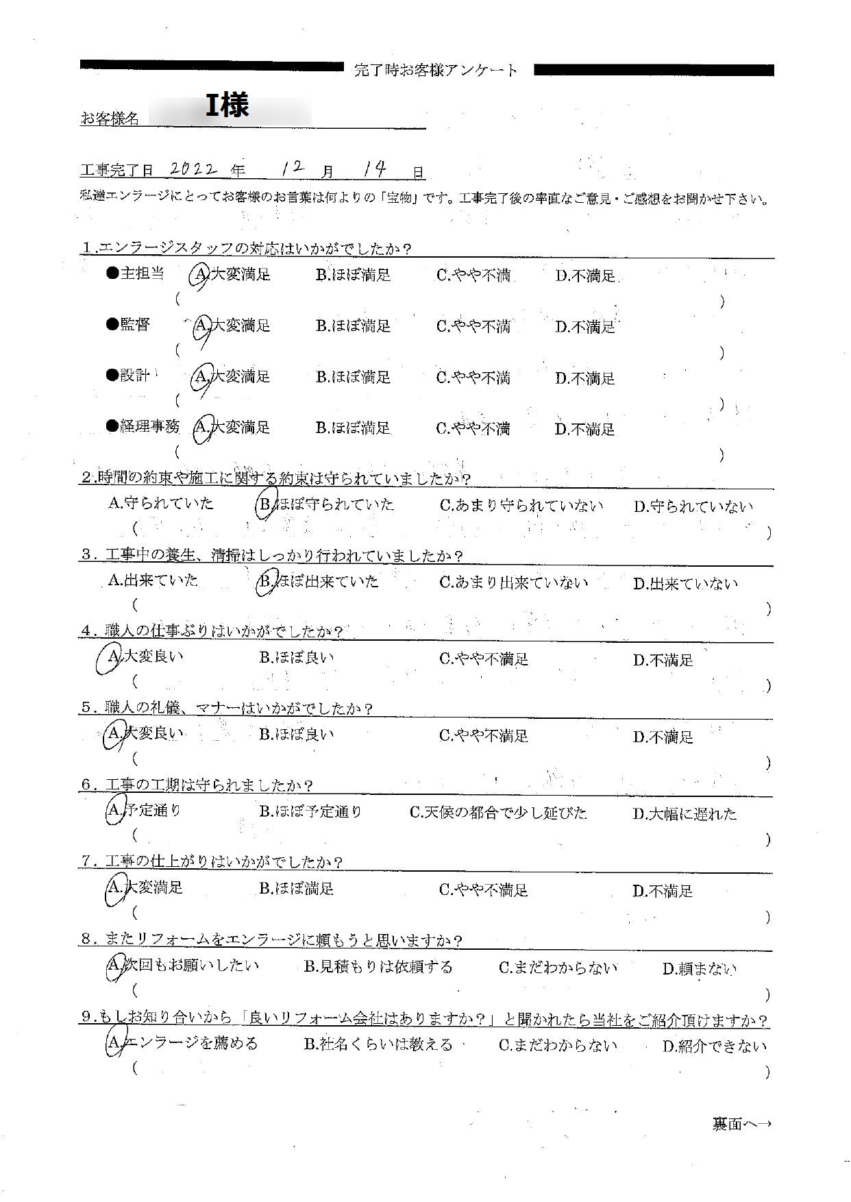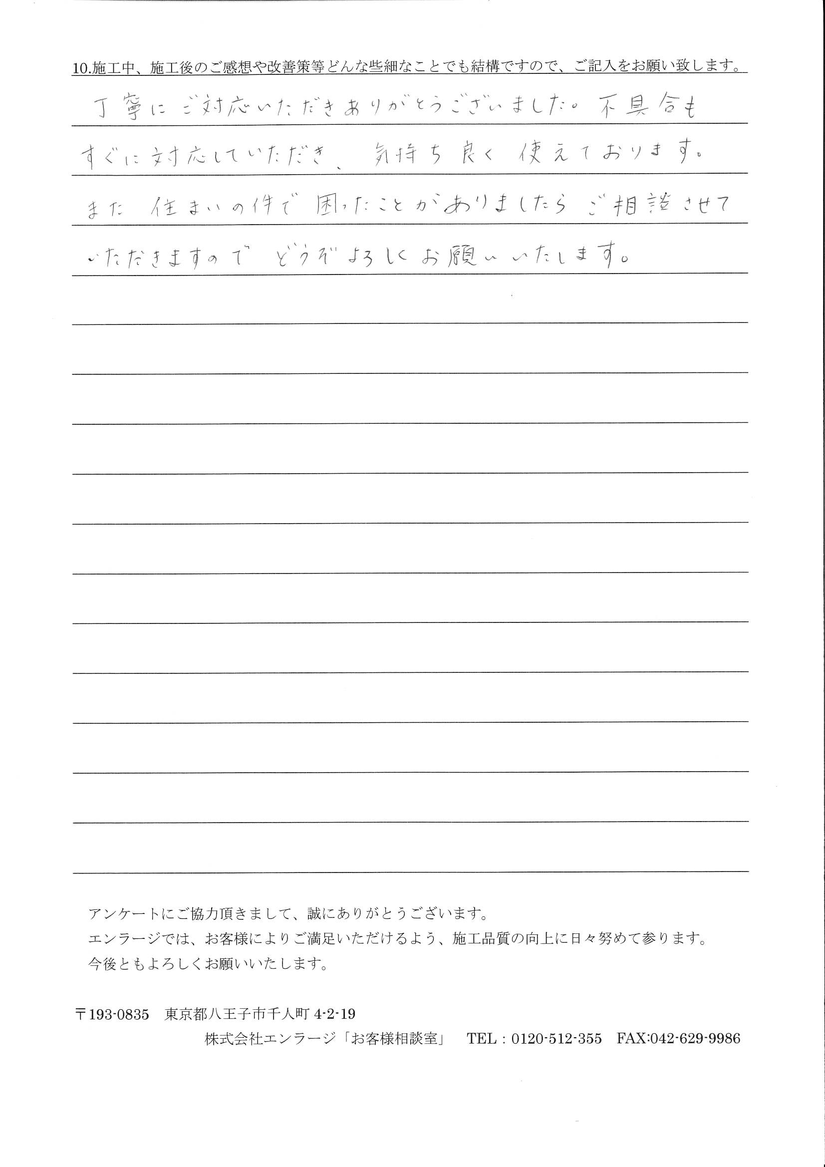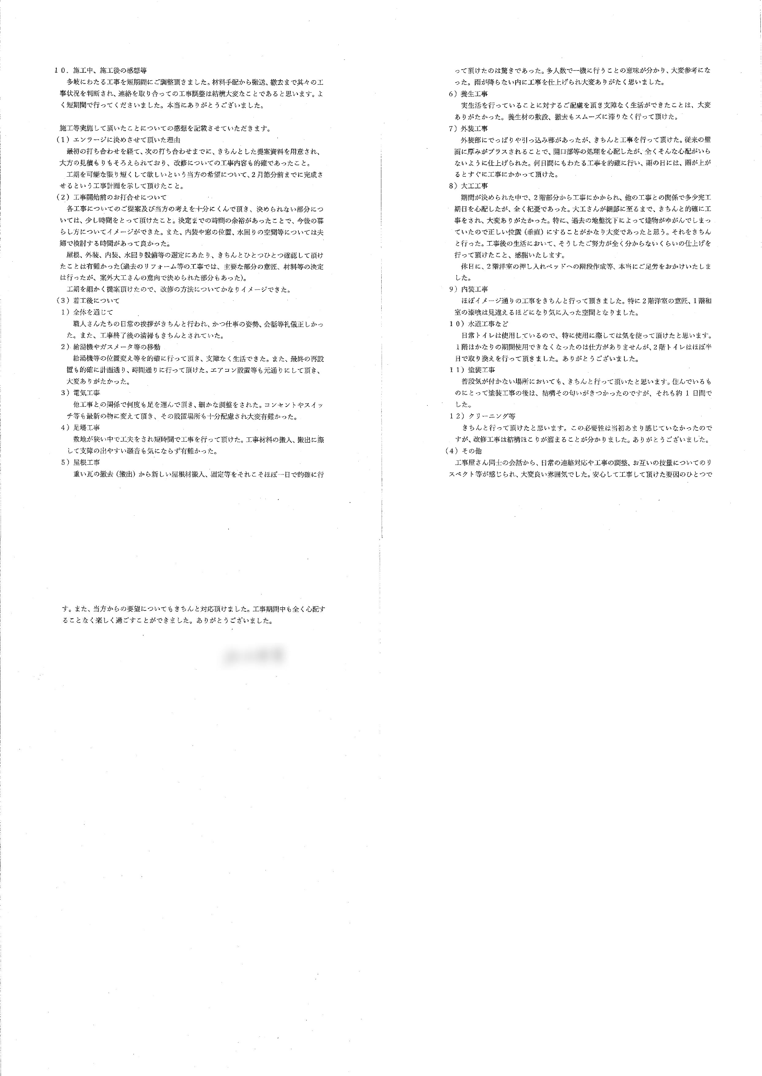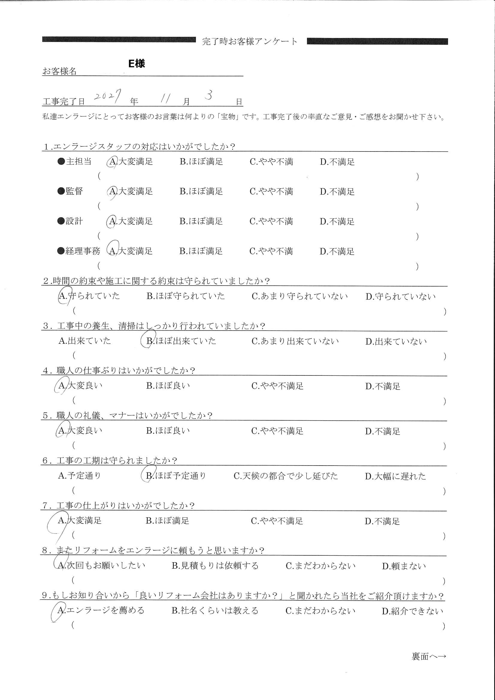 E様 この度はリフォーム工事を当社にお任せいただき、誠にありがとうございました。また、リフォーム後のご感想をお送りいただき大変うれしく思います。今後も何かお困りごとなどございましたらいつでもご連絡くださいね。今後ともどうぞよろしくお願いいたします。