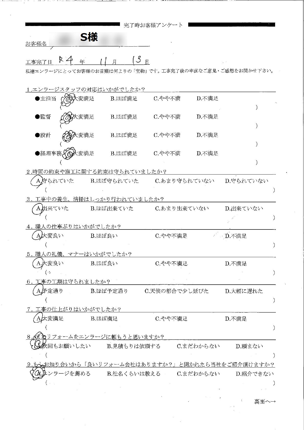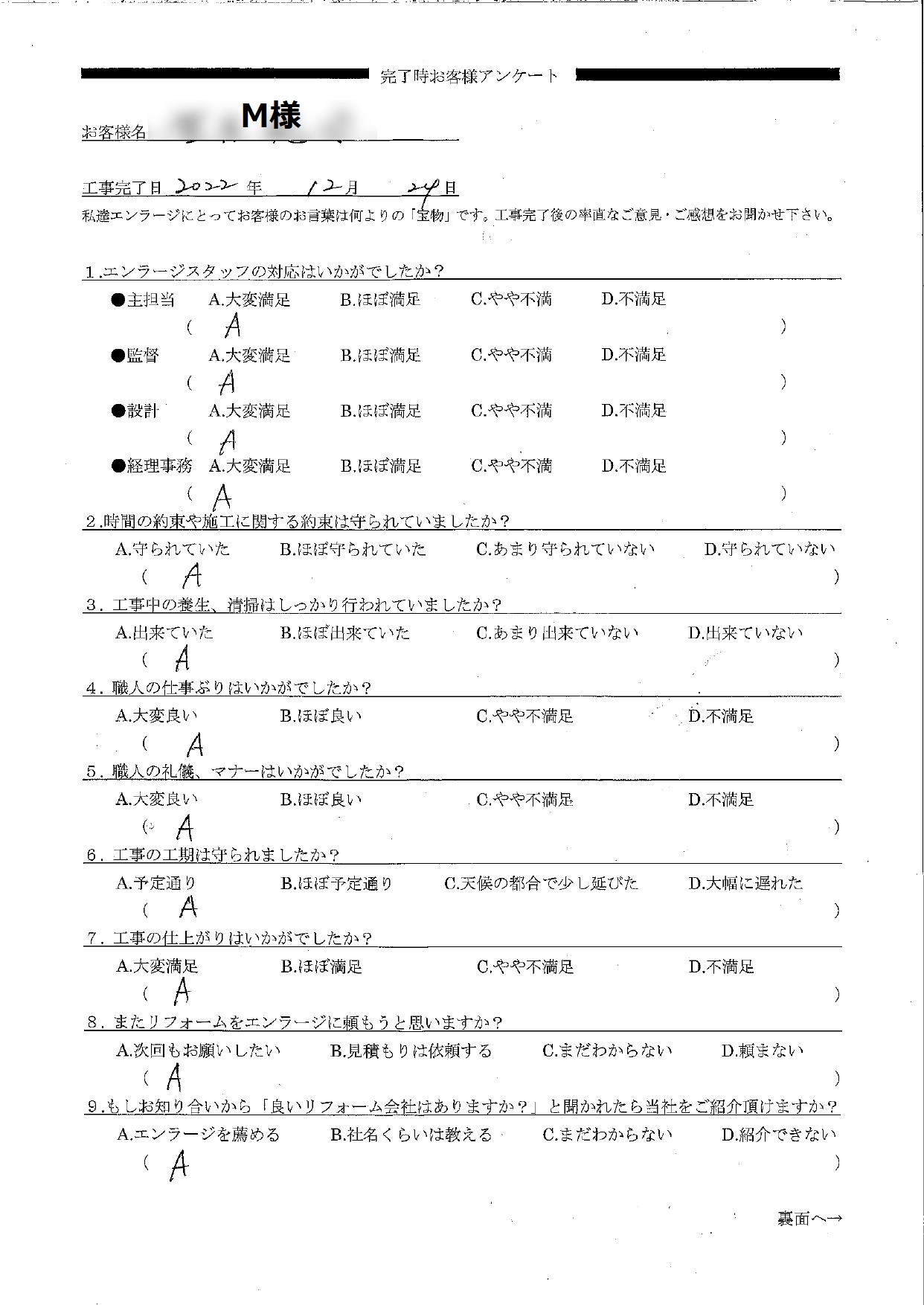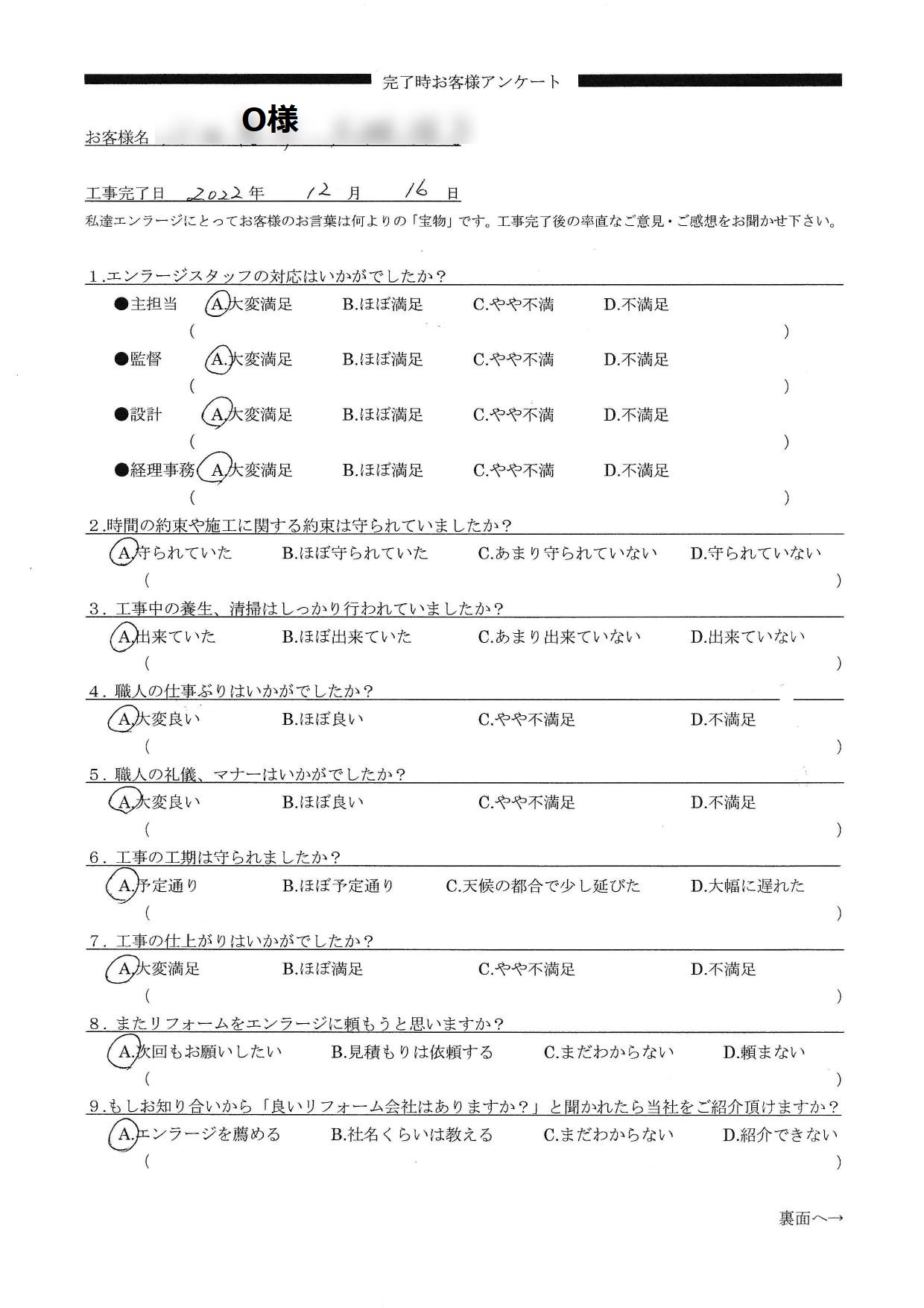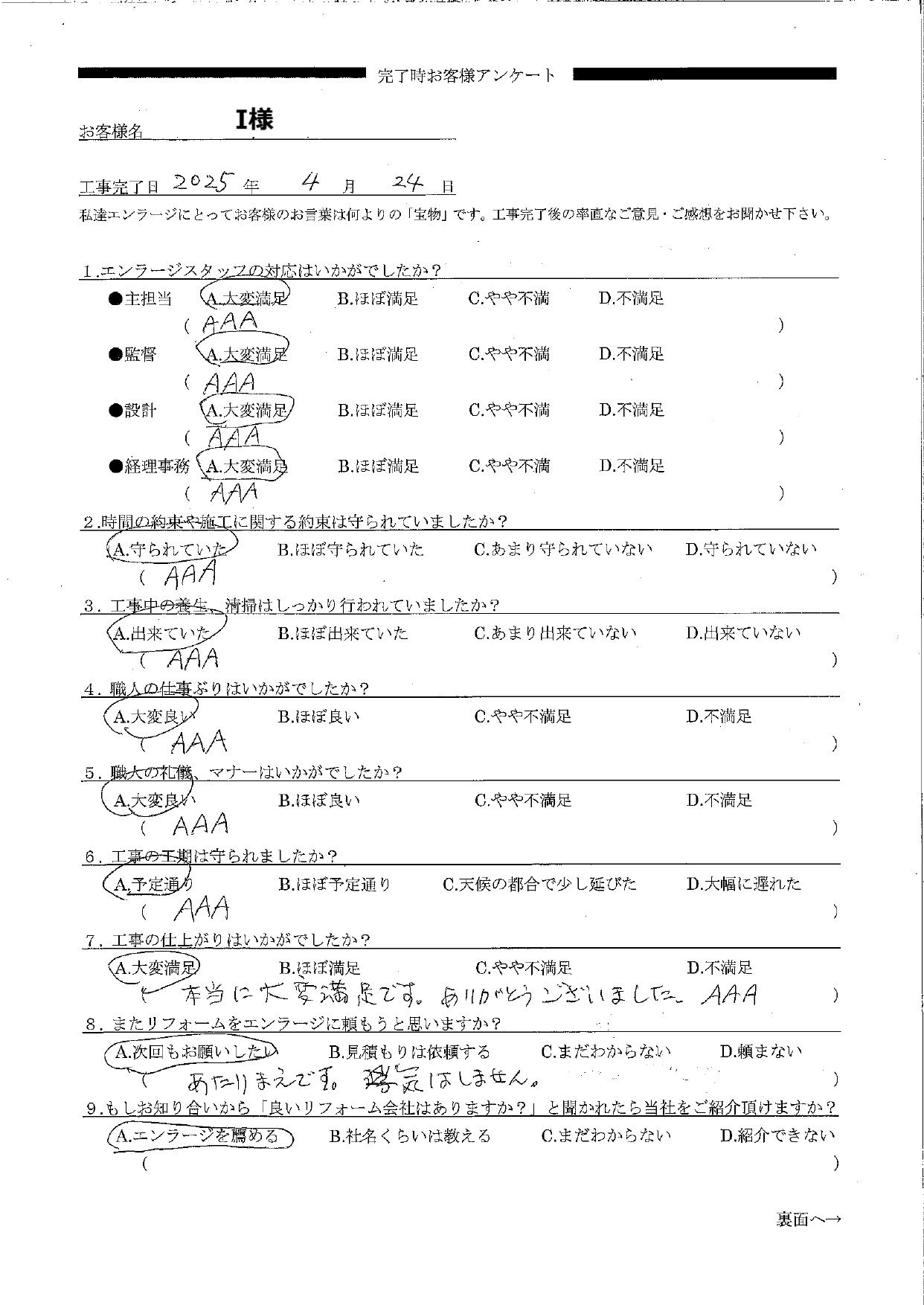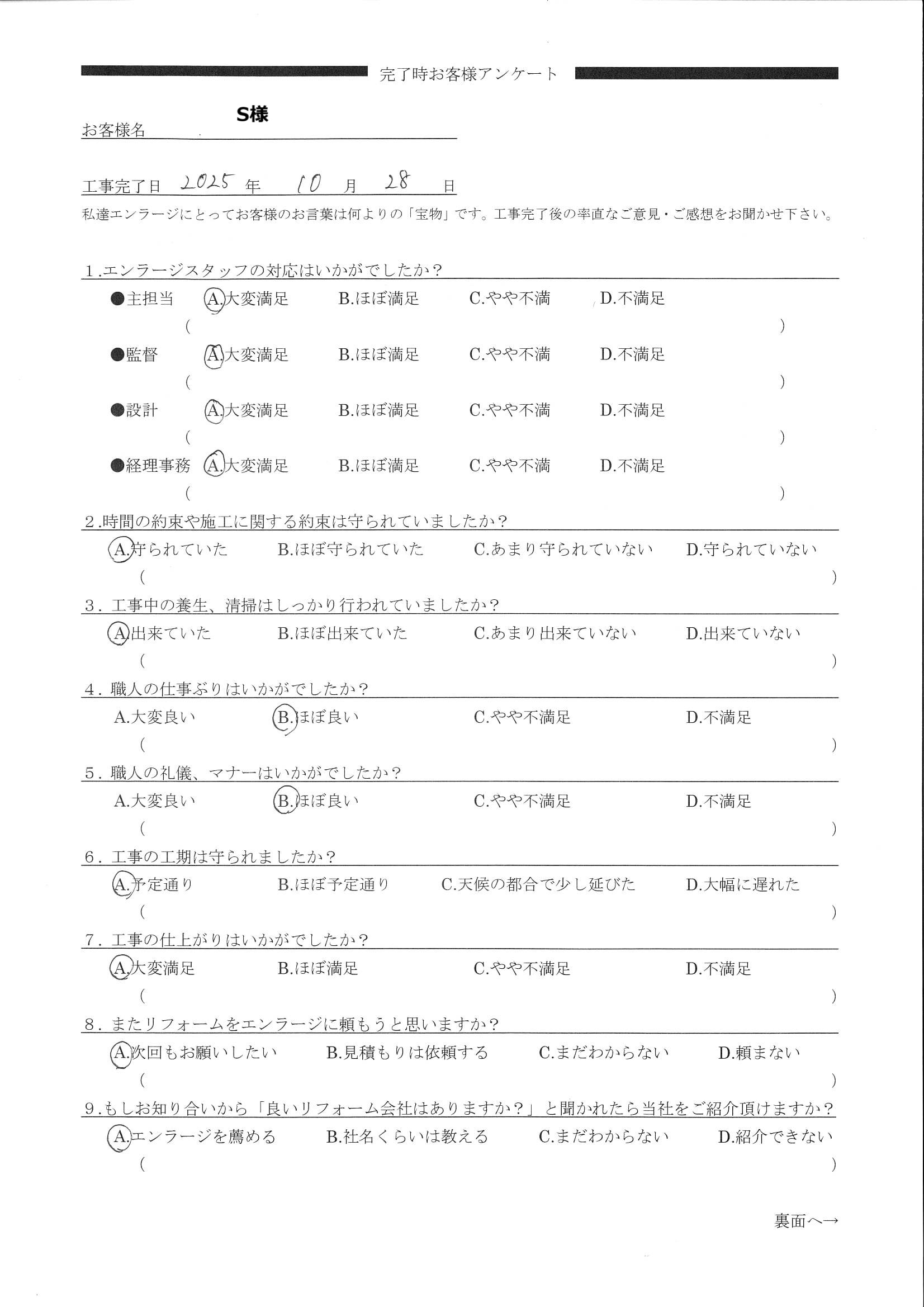 E様 この度はリフォーム工事を当社にお任せいただき、誠にありがとうございました。また、リフォーム後のご感想をお送りいただき大変うれしく思います。今後も何かお困りごとなどございましたらいつでもご連絡くださいね。今後ともどうぞよろしくお願いいたします。