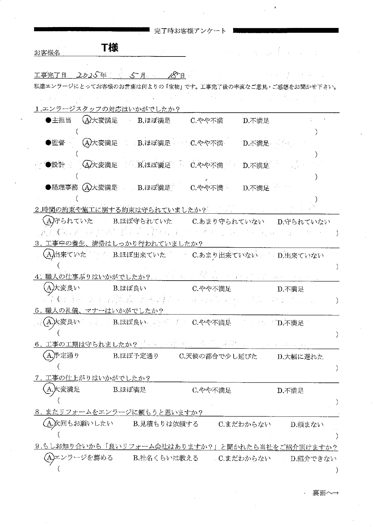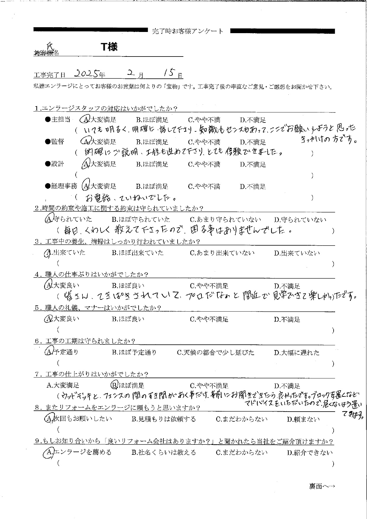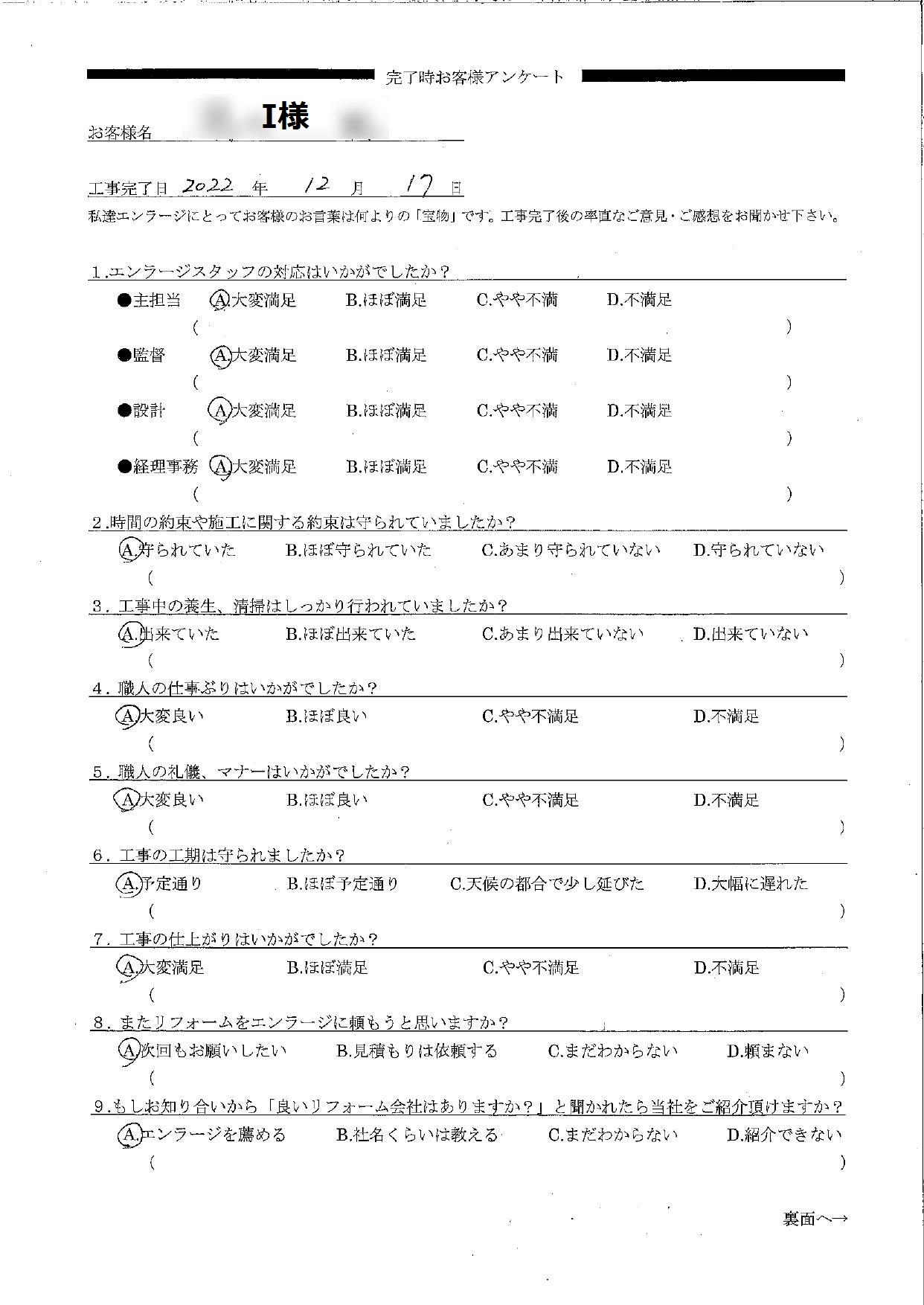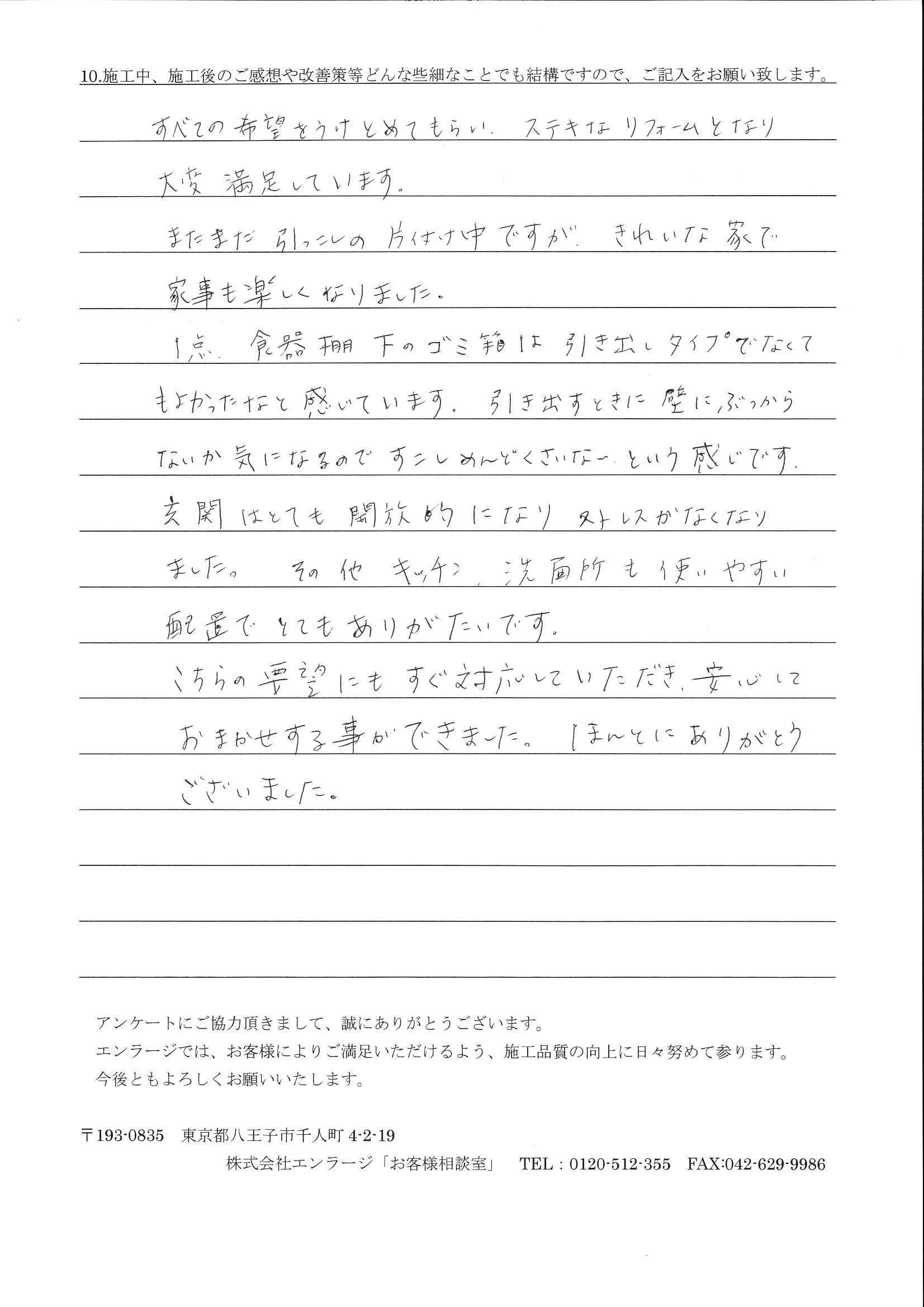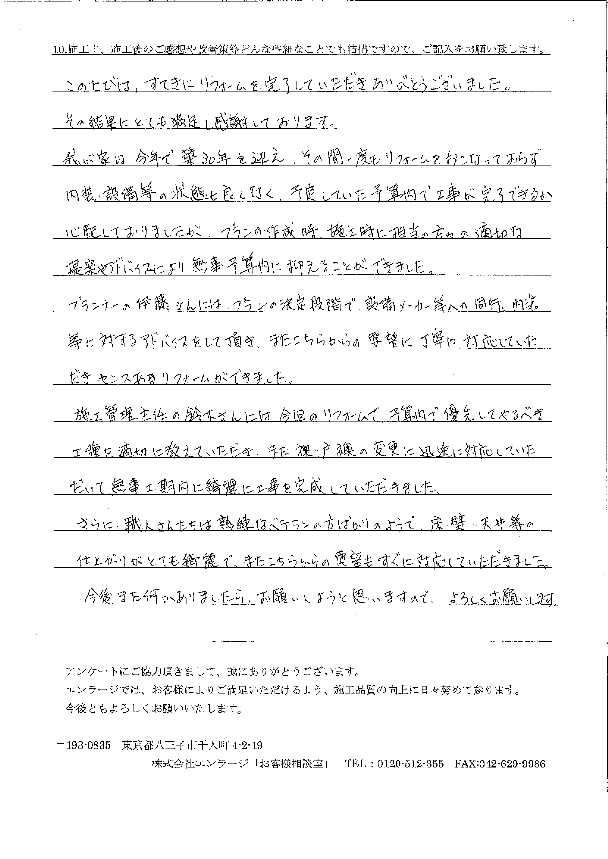 T様 この度は数あるリフォーム会社の中から弊社に工事をお任せいただき、誠にありがとうございました。今回はご主人様のワークスペースでもある和室の洋室化とWICの新設、LDKはキッチン交換とお持ちの家具に合わせて温かみのある内装にしたいとのご希望でしたね。ショールームで実物を見ながら検討したり、サンプルも各種取り寄せてお打合せを重ねた分、各所インテリアや仕様・使い勝手なども気に入ってくださっているようで一安心です。ご自宅からもお近くですので何かあった際は気兼ねなくご相談くださいませ。今後とも、末永いお付き合いのほどよろしくお願いいたします。 プランナー 伊藤
