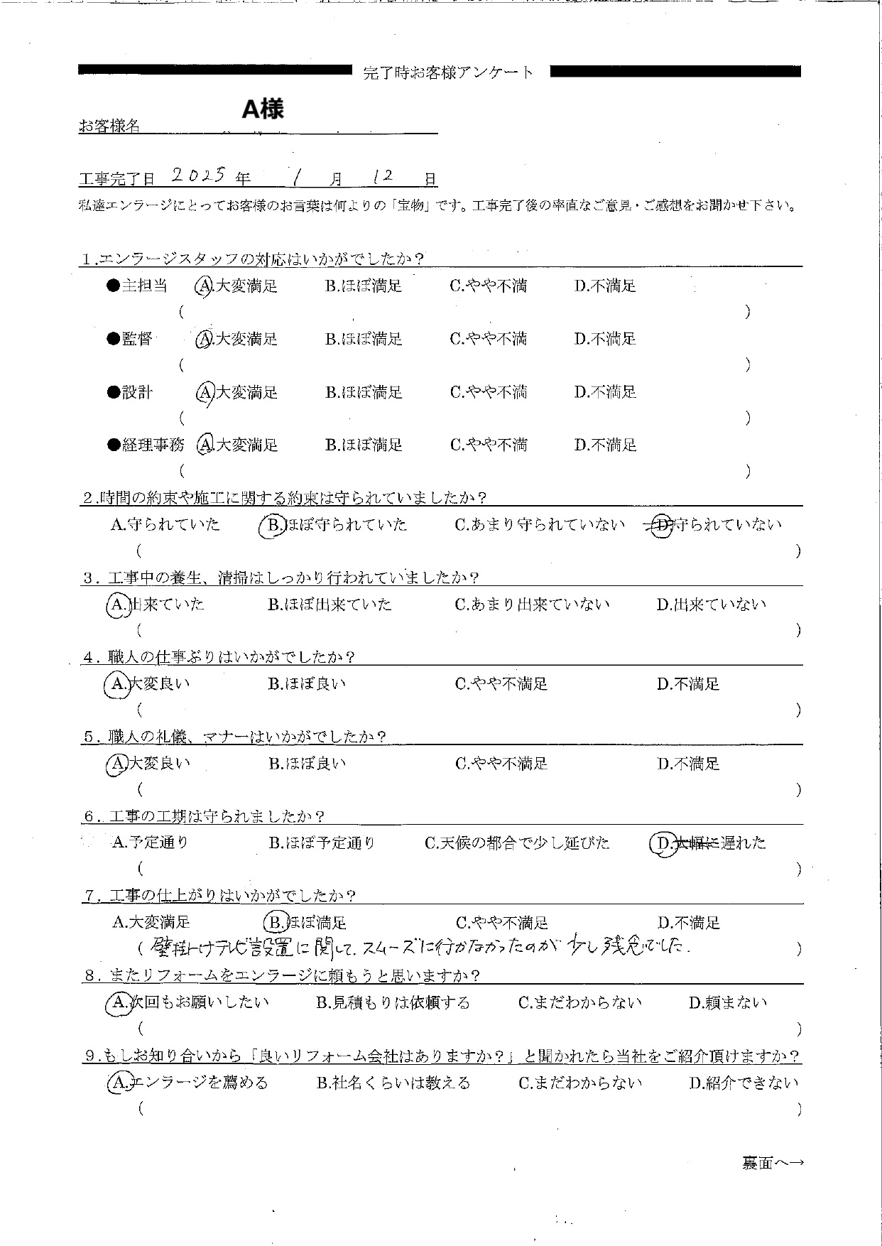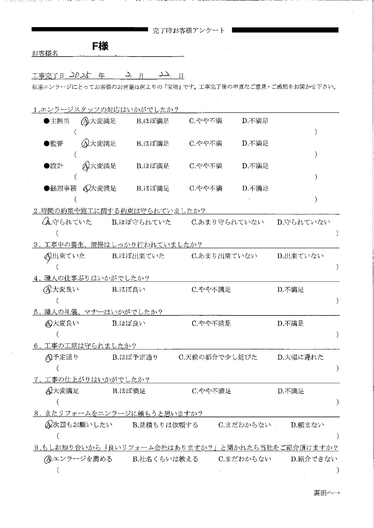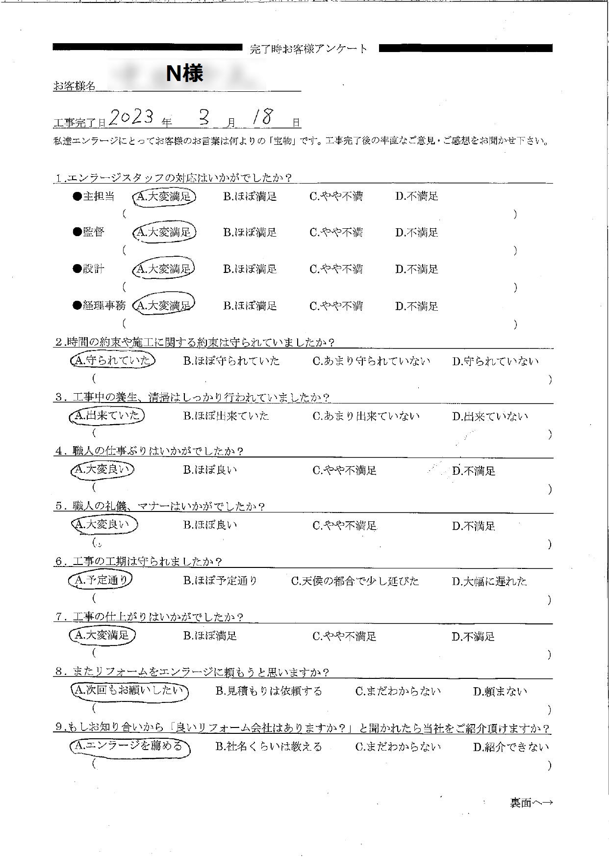 N様 この度は、間取り変更と水廻りのリフォームを当社にお任せいただき誠にありがとうございました。完成後もご満足頂けているようで大変嬉しく思います。今後も何かお困りごとなどございましたら、お気軽にご連絡くださいませ。今後ともどうぞよろしくお願い申し上げます。施工管理 宇津木