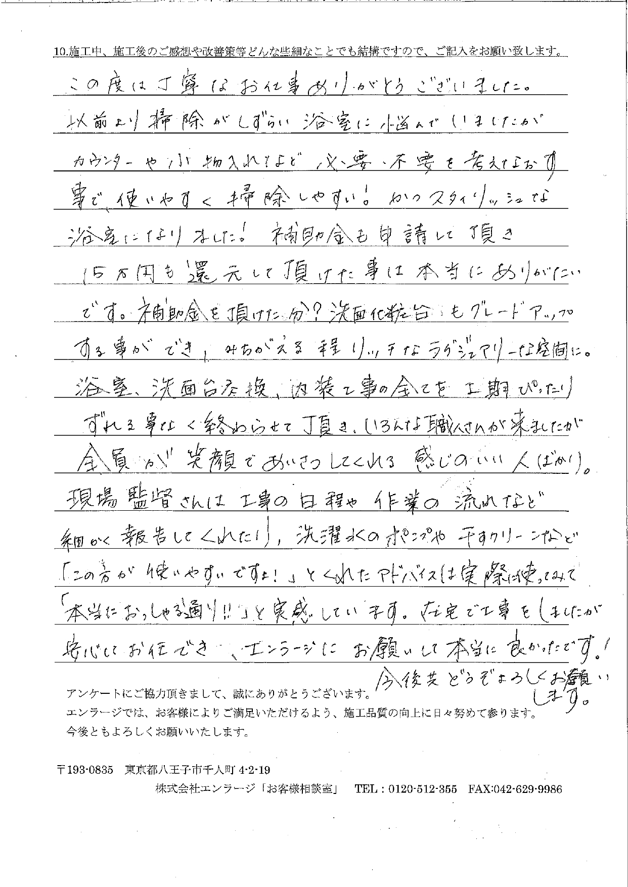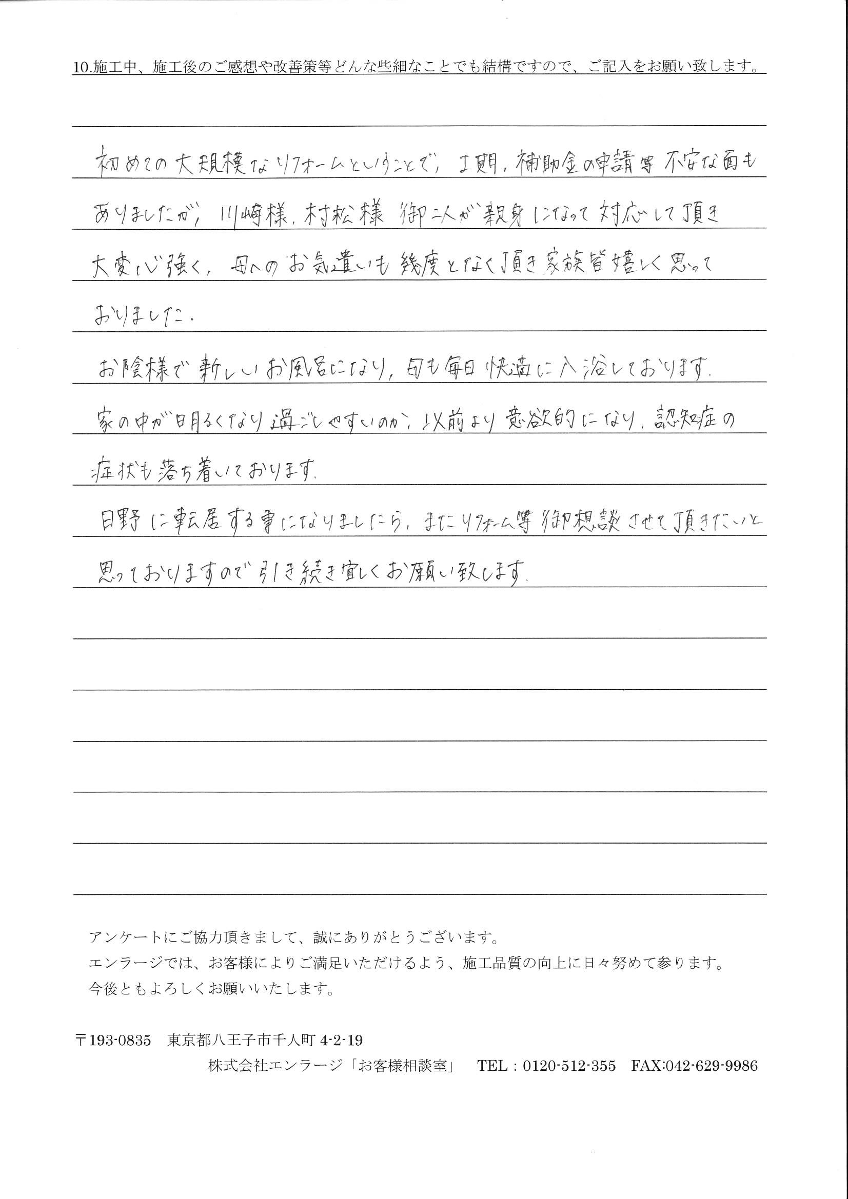 S様・H様 この度は浴室交換・床張り替え・外構工事をお任せ頂き、誠にありがとうございます。リフォーム工事を決断されたご事情やお気持ちをお伺いした際に「是非お力になりたい」と思い、私と村松監督で現地調査からプランのご提案・工事・日野市の補助金申請まで精一杯努めてまいりました。施工後はどのように過ごされているか心配しておりましたが、快適に過ごされ、お母様の認知症の症状も落ち着いているとのことでホッと安心いたしました。またお力になれることがございましたら、お気兼ねなくいつでもご連絡くださいませ。今後ともよろしくお願いいたします。 プランナー 川崎
