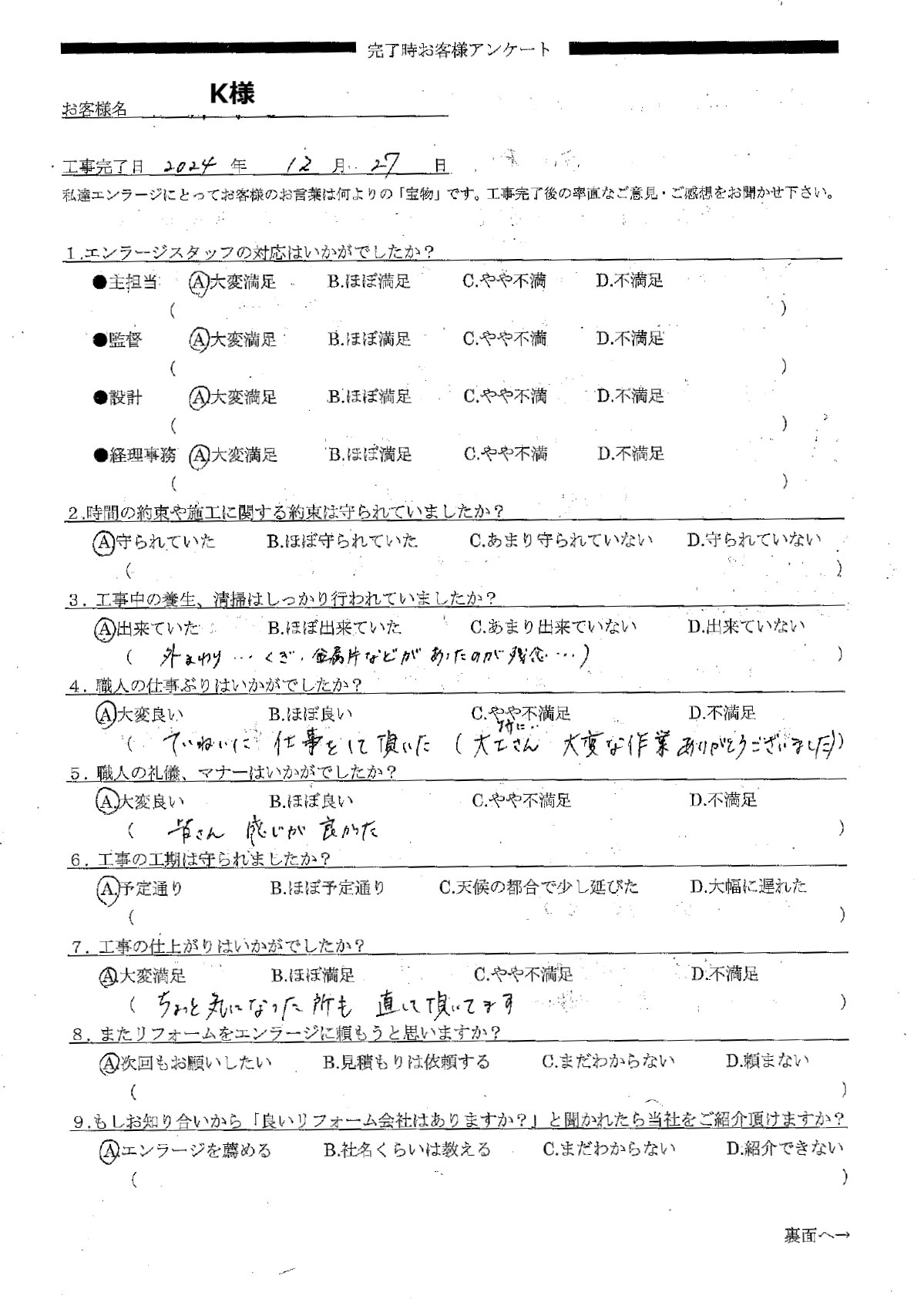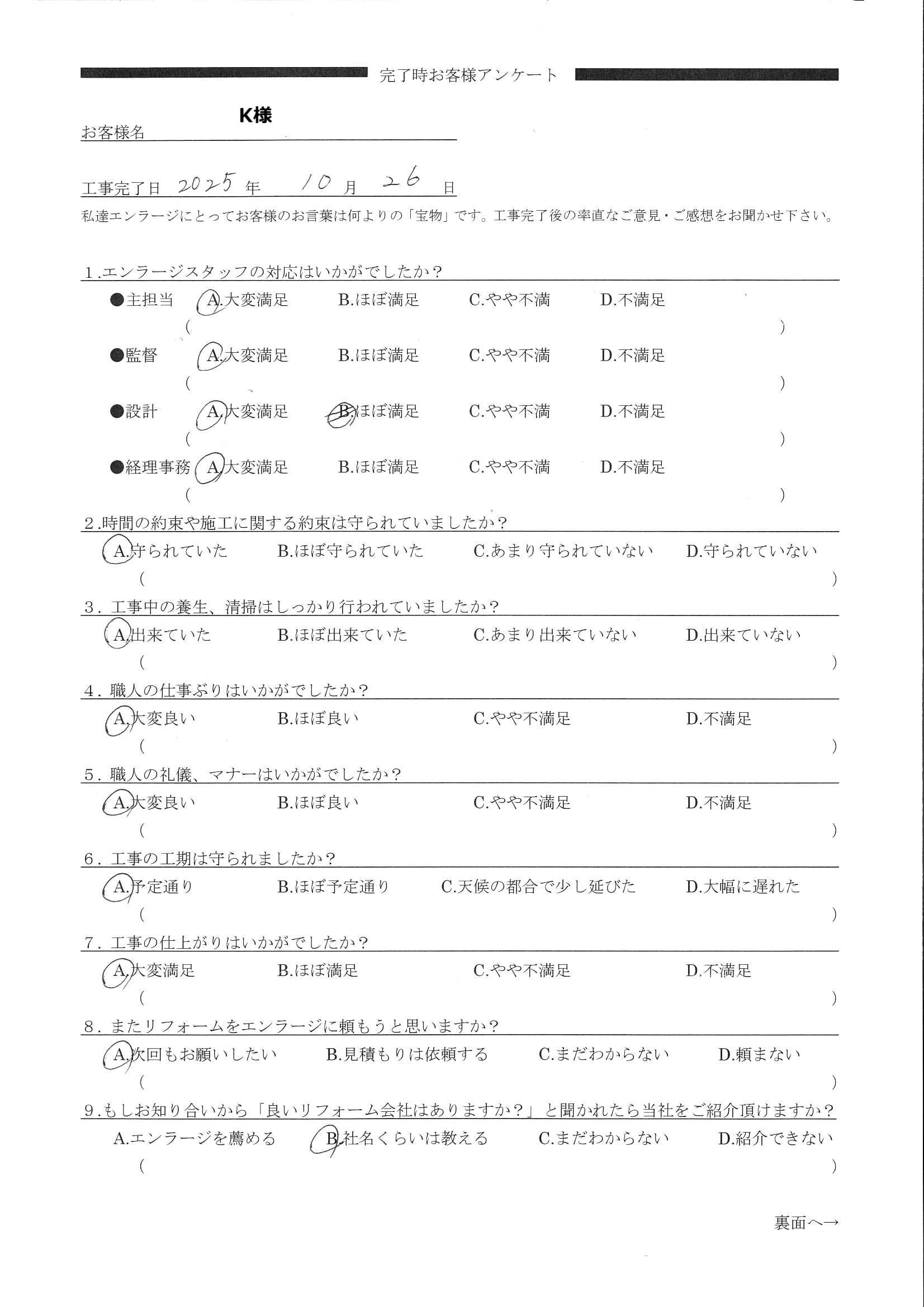K様 この度は1・2階全面工事をお任せくださり、誠にありがとうございます。初めてご訪問した際、お住まいに対して感じていた長年のお悩みや困りごと、不安に感じていることをお伺いし、建物の状況について確認をしたうえで、K様にとって快適な空間になるよう、設計担当者の鴨志田とプランを考えご提案させて頂きました。プランご提案時に「こんなに広いLDKにできるの?」と、プランやイメージパースを気に入って頂けてとても嬉しかったです。完成したご自宅は開放的になり、以前にも増して素敵な雰囲気になりましたね。新しくなったご自宅でご家族やご友人方と素敵なお時間をお過ごし頂けますと幸いです。今後ともよろしくお願いいたします。プランナー 川崎