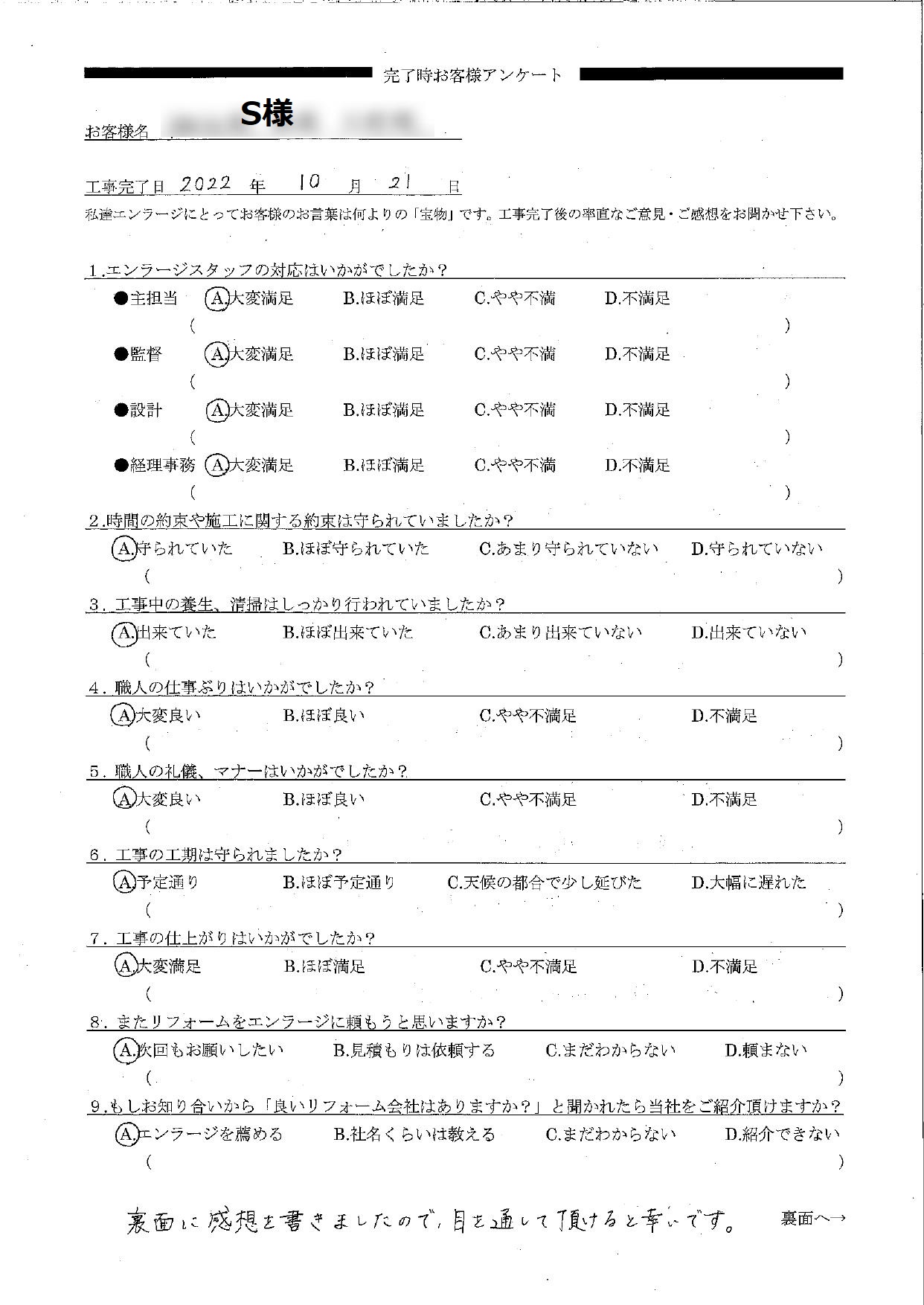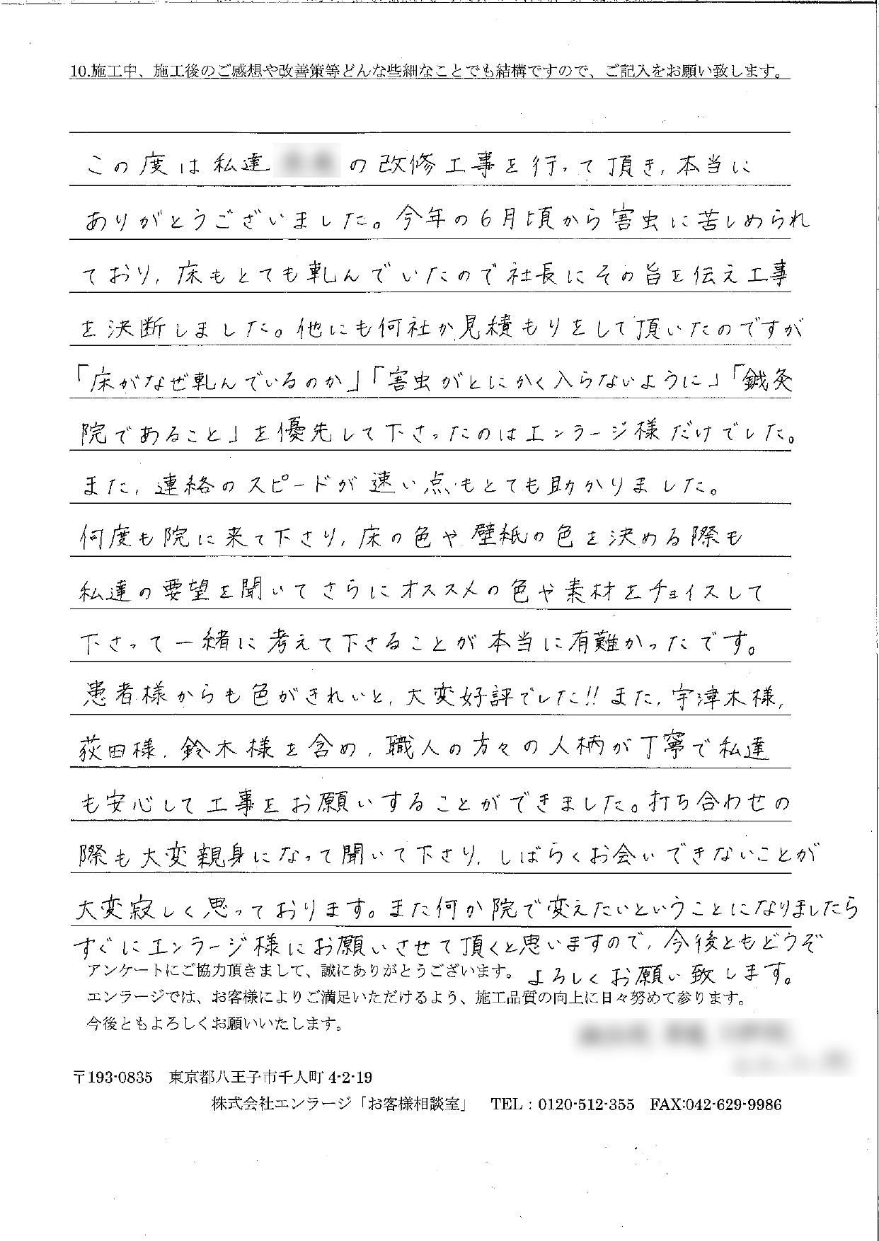 鍼灸院Sの皆様へ。床の老朽化と虫害にお悩みでご相談いただいた鍼灸院のS様。特に床の傷みは深刻で虫害とも密接に結びついていることが分かり早急に対応させていただきました。営業しながらの工事は難しく数日の間別の院での営業をお願いする形となり、限られた日数の中での工事でしたが職人とスタッフが連携することできっちりと工事を終える事ができ、私自身とてもホッとしました。お打ち合わせの際にはいつも明るく優しい皆さんの笑顔で迎えていただき、お伺いするのが私も宇津木も毎回楽しみでした。完工時には『しばらくお会いできないのは寂しいね。』と話してお別れをしましたが、鍼灸院の皆さんも同じように感じてくださっていた事をこのアンケートで知ることができ、温かい気持ちになりました。こちらこそ本当にありがとうございます。また何かお困りの際はいつでもお声掛け下さいませ。今後共、末永いお付き合いさせていただけると幸いです。チーフプランナー鈴木 千春