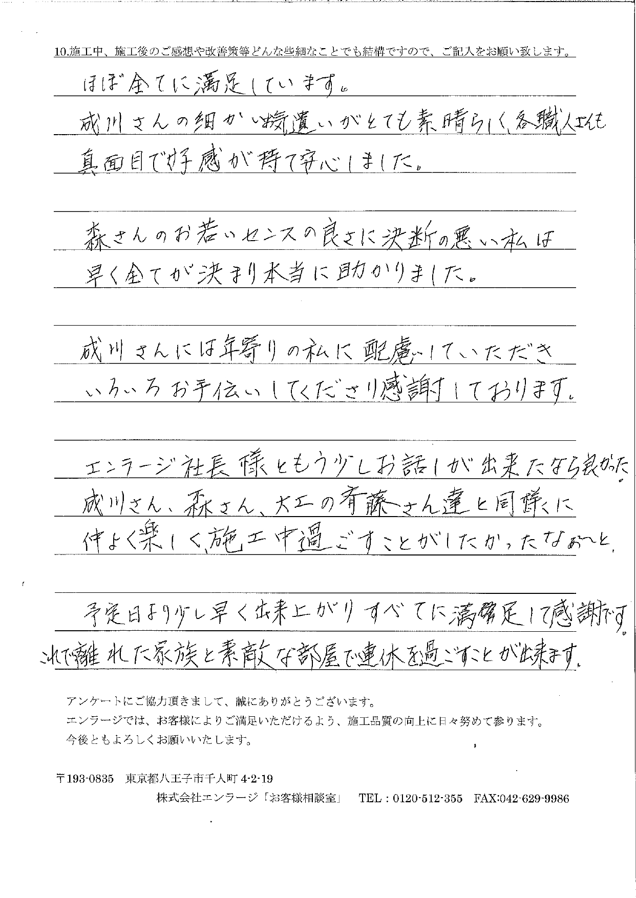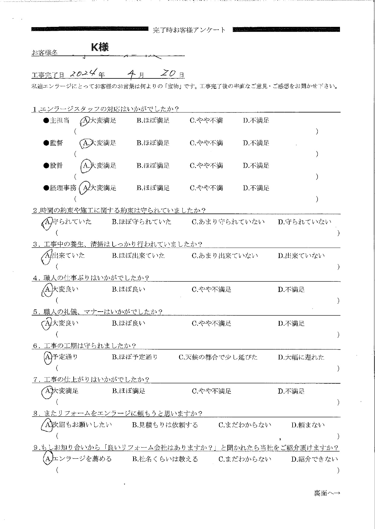 K様 この度は、キッチン交換・内装工事をお任せくださり誠にありがとうございました。キッチンはK様の憧れだった「トクラス」のキッチンを採用し、お色もダークブラウンから真っ白へと変更して、明るく高級感のあるキッチンに変わりましたね。また、元々和室だったお部屋の洋室化に伴なって収納の一部を解体してスペースを広げたことでご友人様や遠方にお住いの息子さん・お孫さん達を呼べるようになったとお喜びいただき私も嬉しく思います。なにかございましたらいつでもお声かけくださいませ。