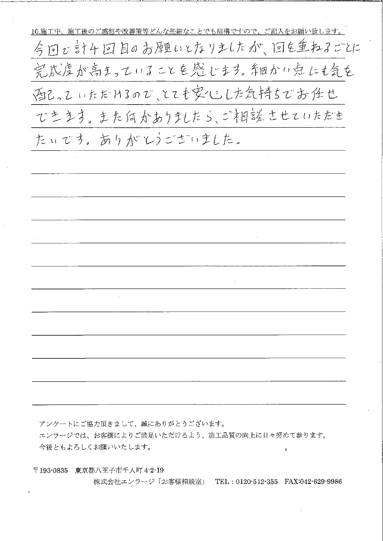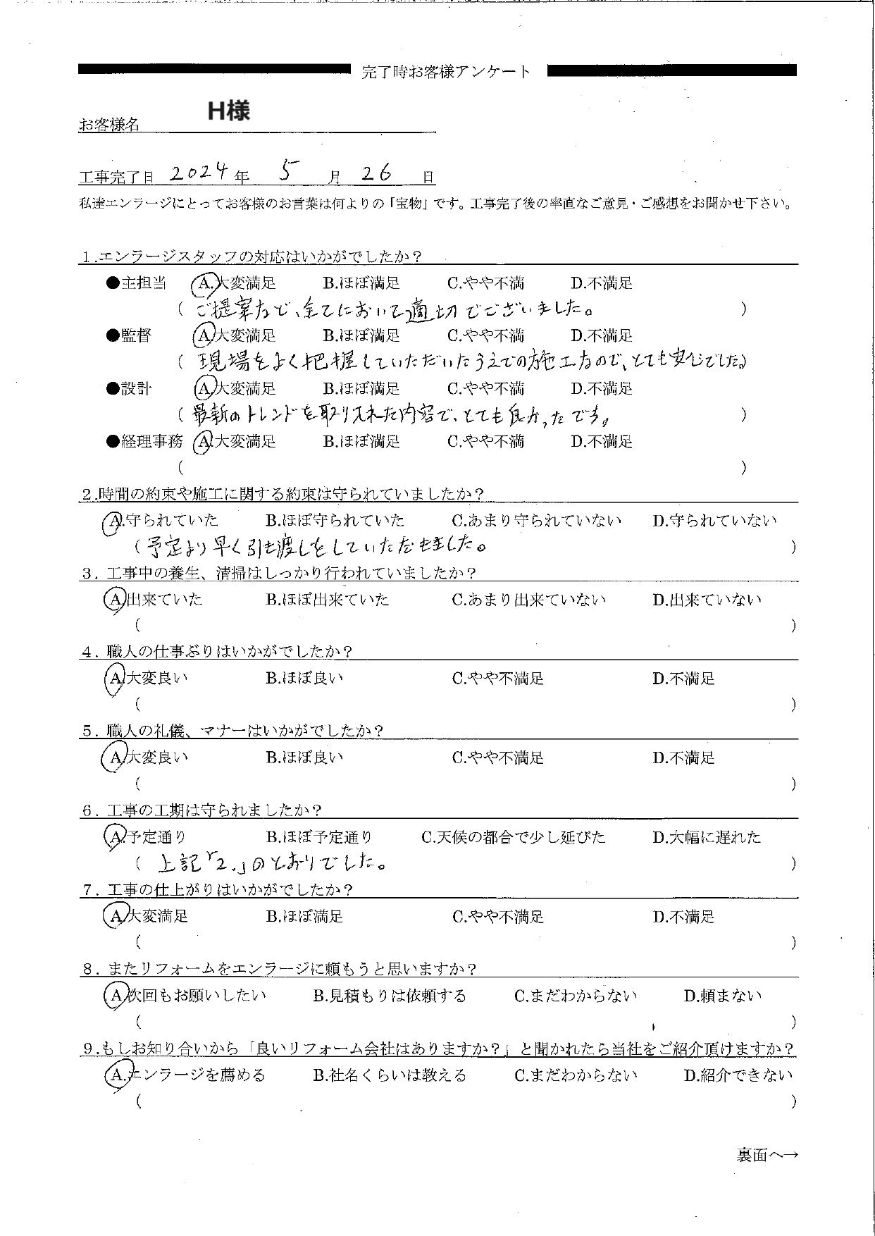 H様 4回目の賃貸改修工事、今回も私共にお任せ頂き誠にありがとうございます。4回目ということもあり、H様のご期待を上回るご提案・施工を目指して取り組ませて頂きました。ご提案面では今の世情を反映したデザインや設備、入居者の方が使いやすい間取りを意識し、また、施工面では前回工事も担当し構造のことをよく理解している職方とチームを組み、連携を取りながらスムーズ且つ丁寧な施工をして頂きました。その結果、今回もH様にご満足頂ける仕上がりになったのだと思います。またお力になれることがございましたら、是非お声がけくださいませ。今後ともどうぞよろしくお願いいたします。