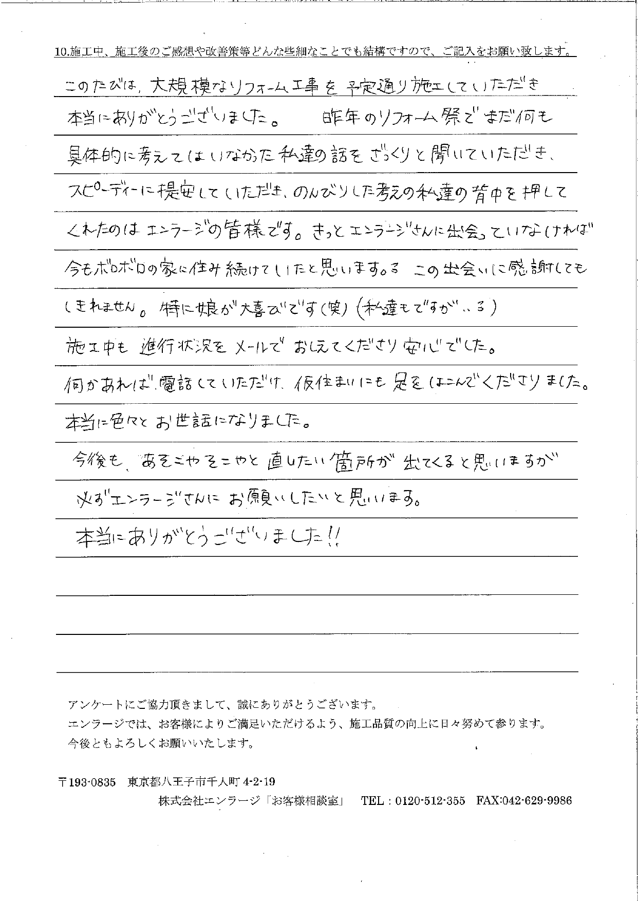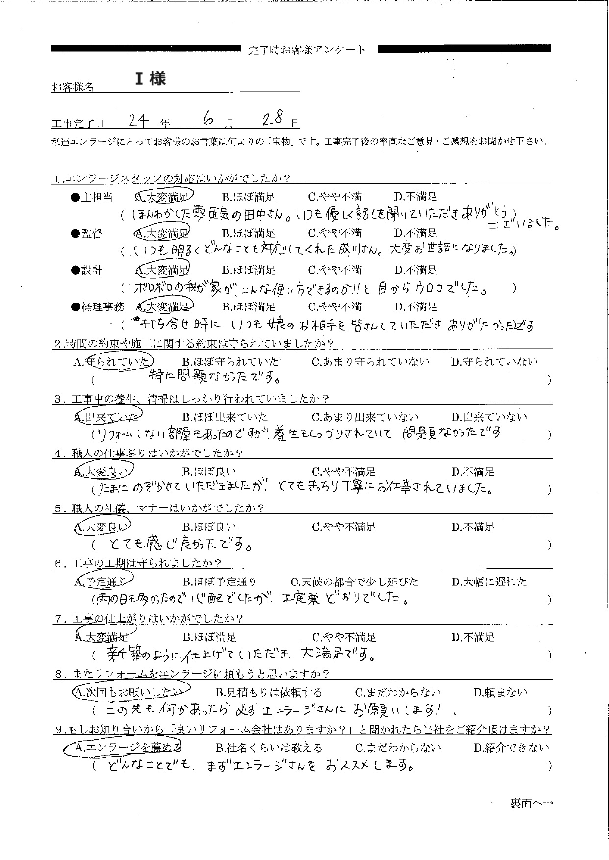 I様へ この度は全面リフォーム工事をお任せいただきありがとうございました。I様と初めてお会いしたのは当社主催のリフォーム祭でしたね。イベントがきっかけで当社に全面リフォームをお任せいただき、大満足ですとお喜びいただけて、とても嬉しく思います。お近くですので、いつでもご連絡くださいね。今後ともよろしくお願い申し上げます。 プランナー 田中