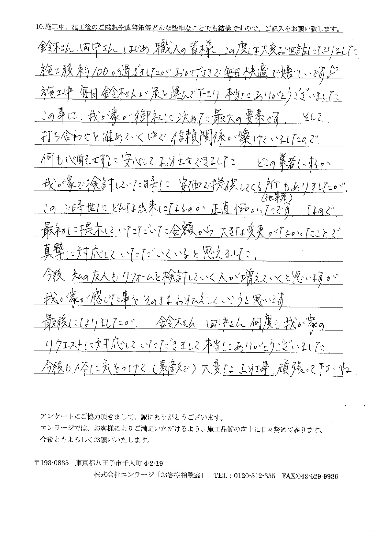 H様 この度は当社にリフォーム工事をお任せいただきありがとうございました。お引渡しから約2週間が経ち、実際にご使用になってみてのご感想をお送りいただけてとても嬉しいです。