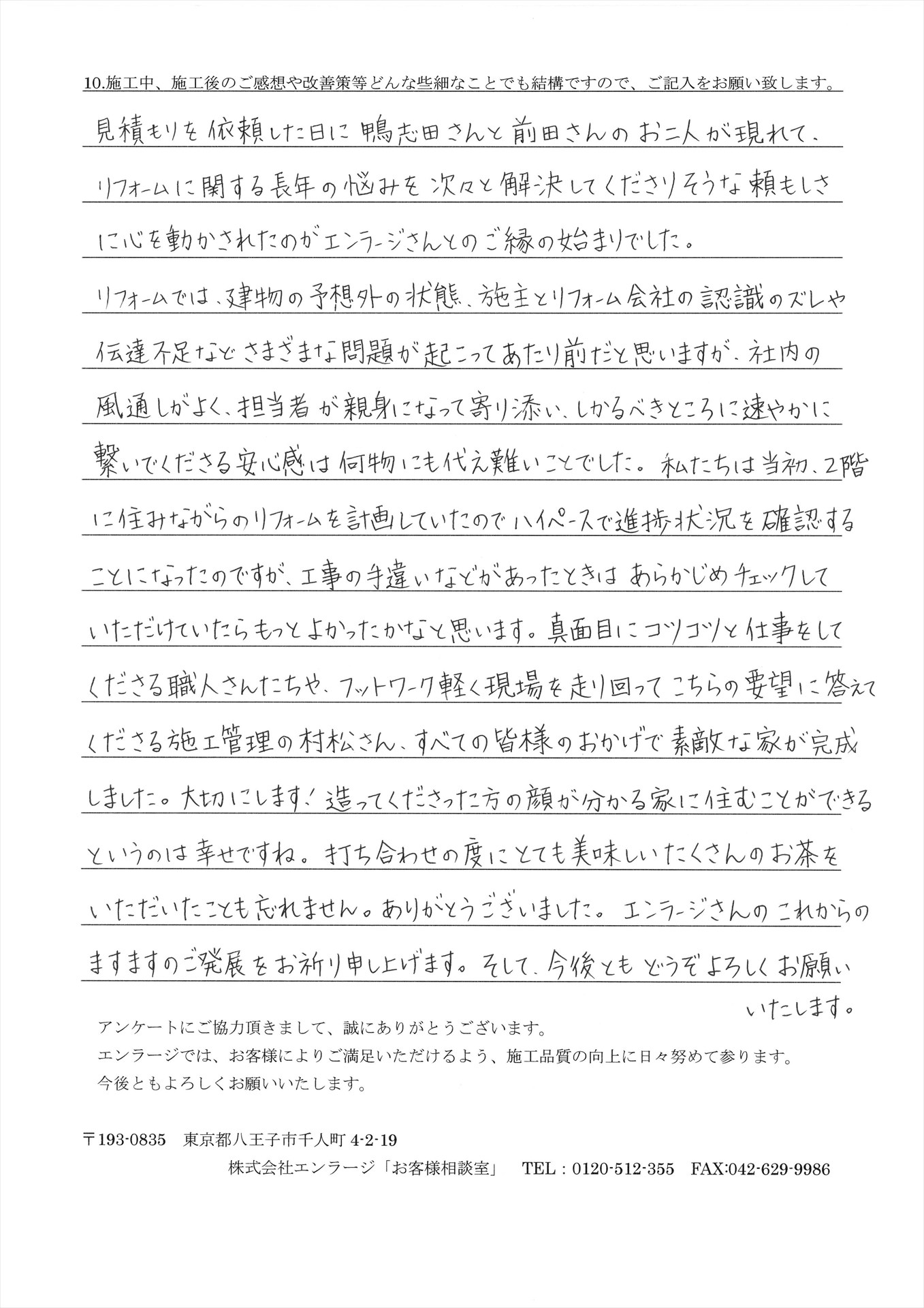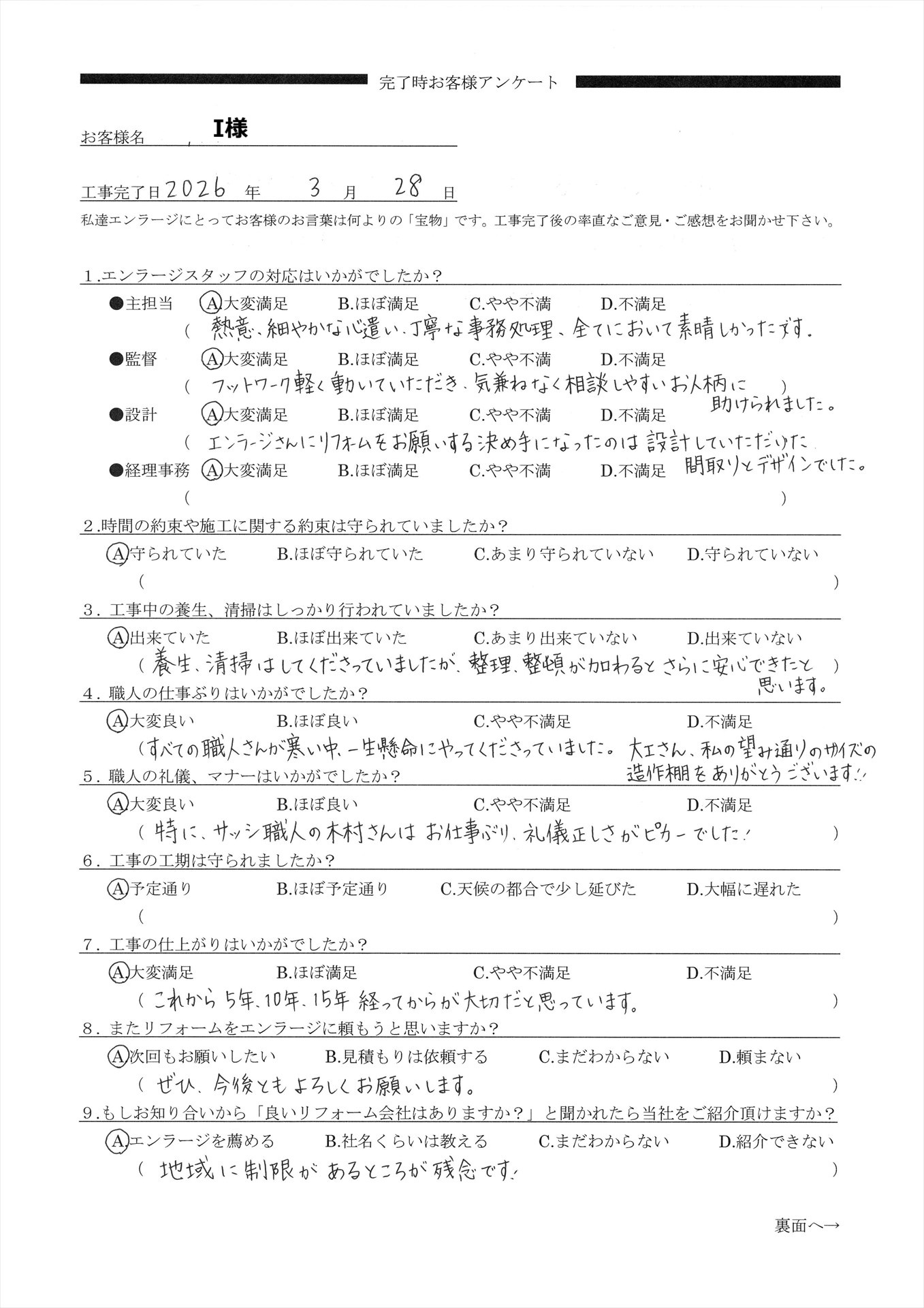この度は、弊社に工事をお任せいただき誠にありがとうございました。また、心のこもったアンケートをご記入いただき感謝申し上げます。どのスタッフに対しても温かいコメントをいただき大変嬉しく思います。初めてお会いした日から、素敵なI様ご夫婦のお力になりたいと強く思い、他社さんと迷われている時も『絶対に後悔させません!』と断言したことを、今でも覚えています。コメントの中で仰っていただいた改善点につきましても、より一層ご不安を取り除けるよう課題に取り組んでまいります。お子様も独立し、長年見て見ぬふりをしてきたと仰っていたお家の使い勝手が今回のリフォームでより豊かに、より快適にお過ごしいただけることを心からお祈り申し上げます。これからも、I様のホームドクターとして末永く宜しくお願いいたします。
