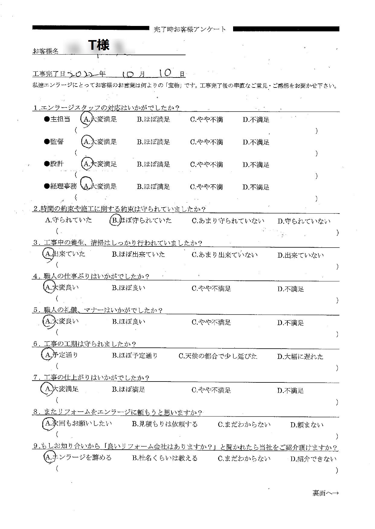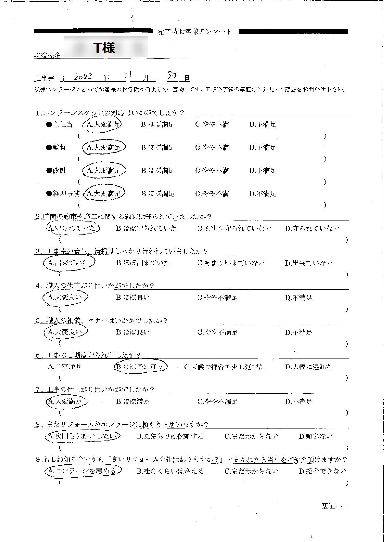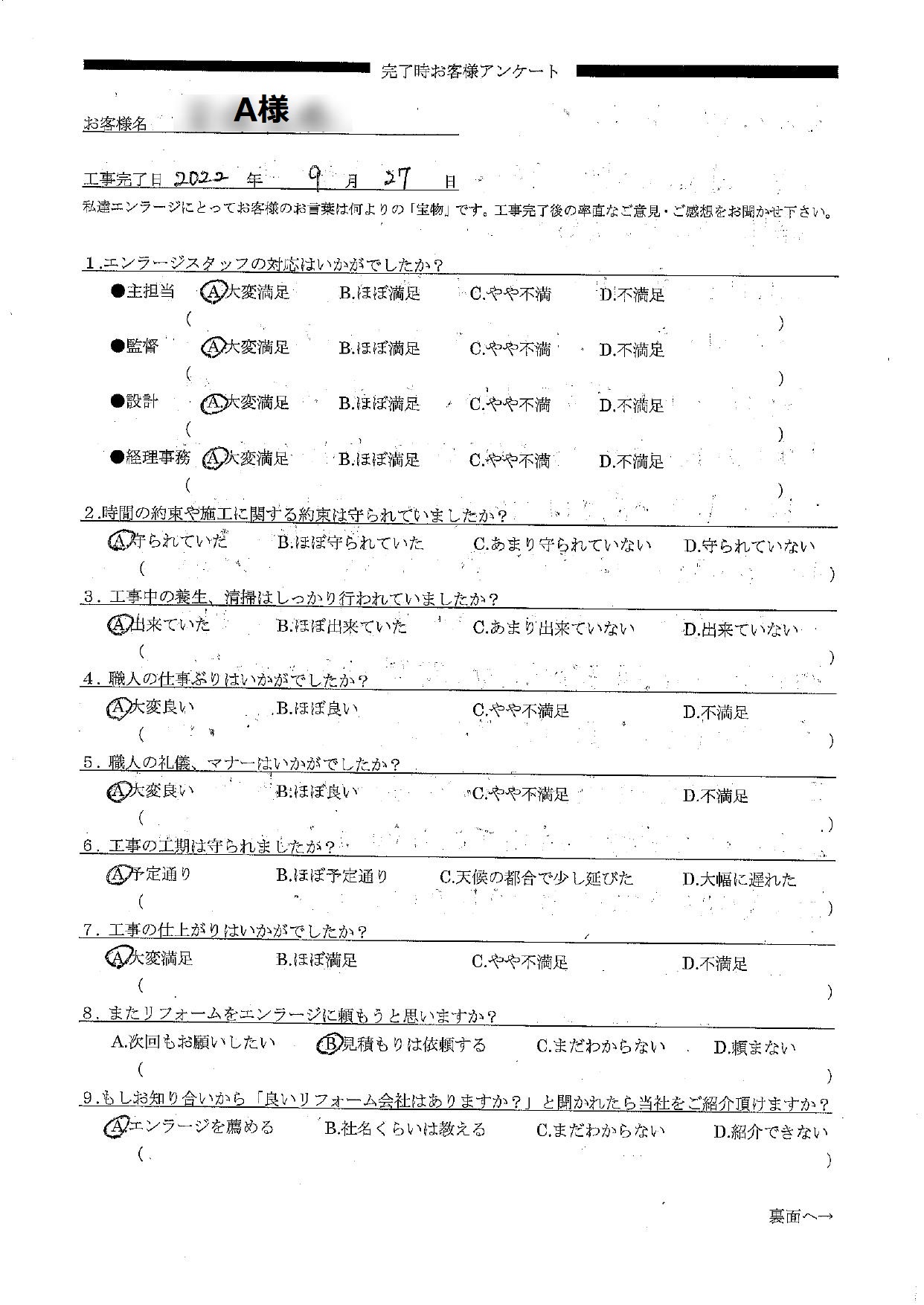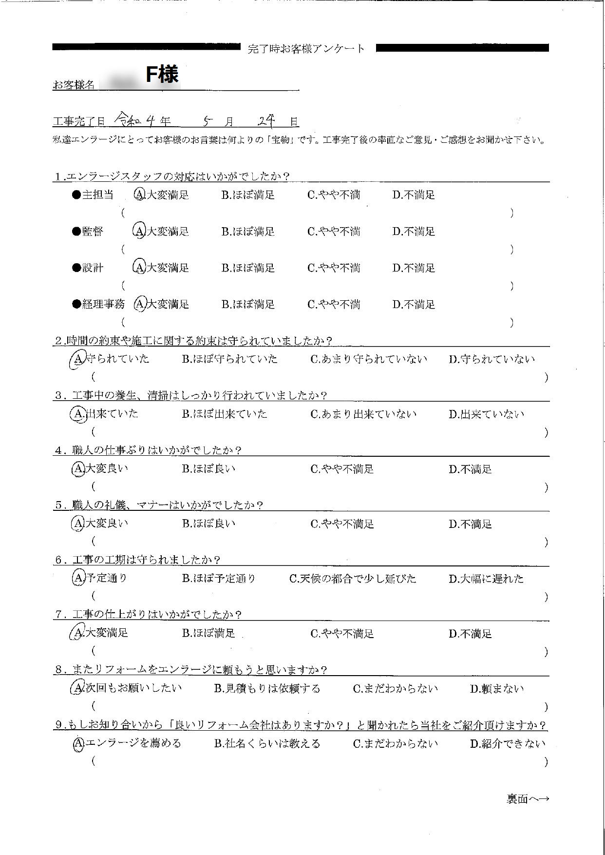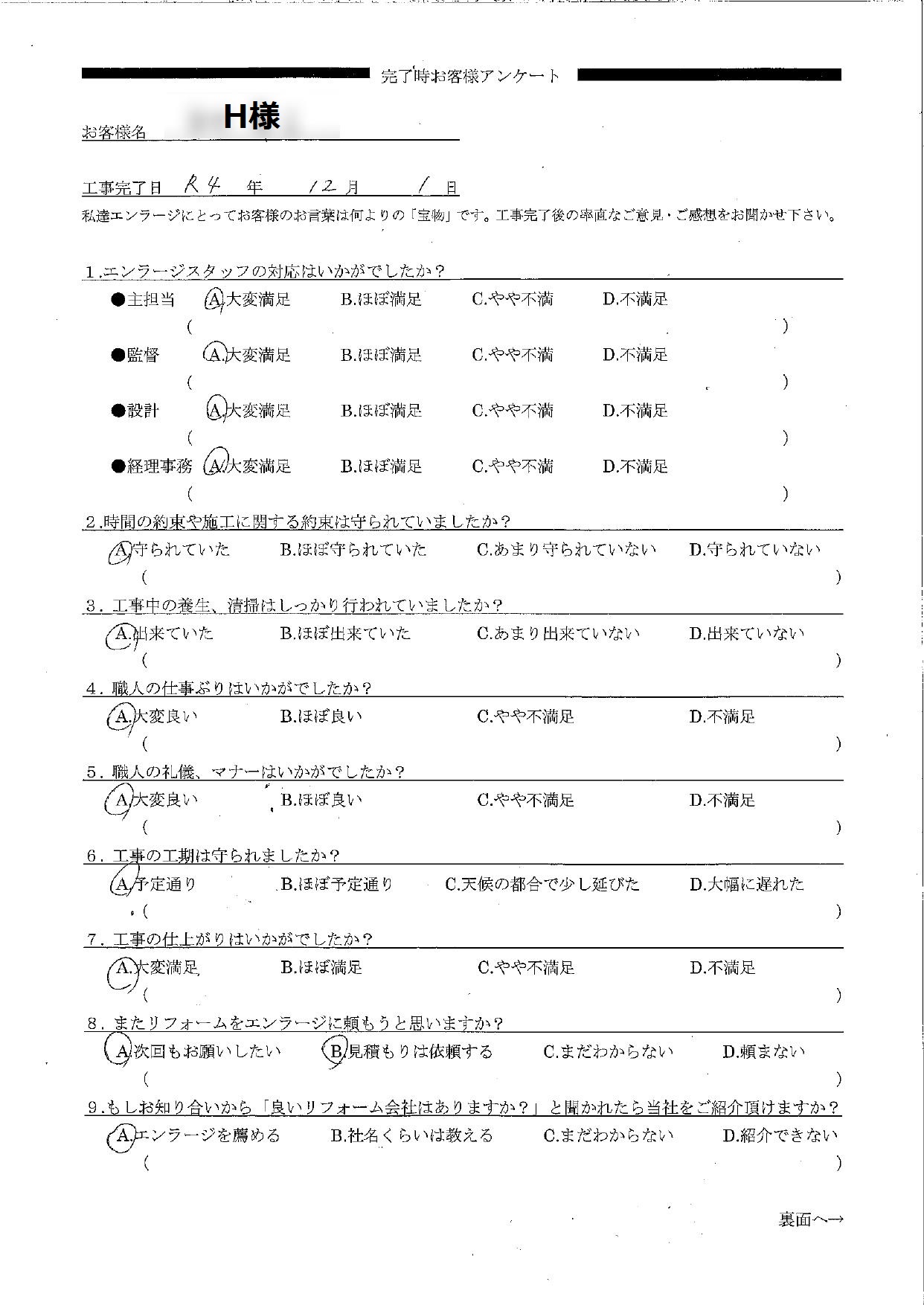 大切なH様へ この度は全面リフォームをお任せいただきありがとうございました。またオールAのご評価をいただけたこと大変嬉しいです!H様は耐震性・断熱、2階にトイレを新設したいなどのお悩みがあり、5年ほど前にリフォーム祭にお越し下さいましたね。今年から本格的にお話をさせていただくことになり、安心できるお住まいで幸せに暮らしていただきたい!という強い想いから一級建築士と共にご希望を盛り込んだプランをご提案させていただきました。工事中にはいつも職人や私たちに美味しいお菓子を持ってきてくださったりとお心遣いが嬉しかったです。そんな心温かい素敵なご夫婦にお喜びいただけるよう施工管理の村松や職人を含めチーム一同全力で尽くさせていただきました。新しく生まれ変わった明るいお家で、ねこちゃんと一緒に楽しみながらゆっくりとお過ごし下さい。本当にありがとうございました。プランナー前田