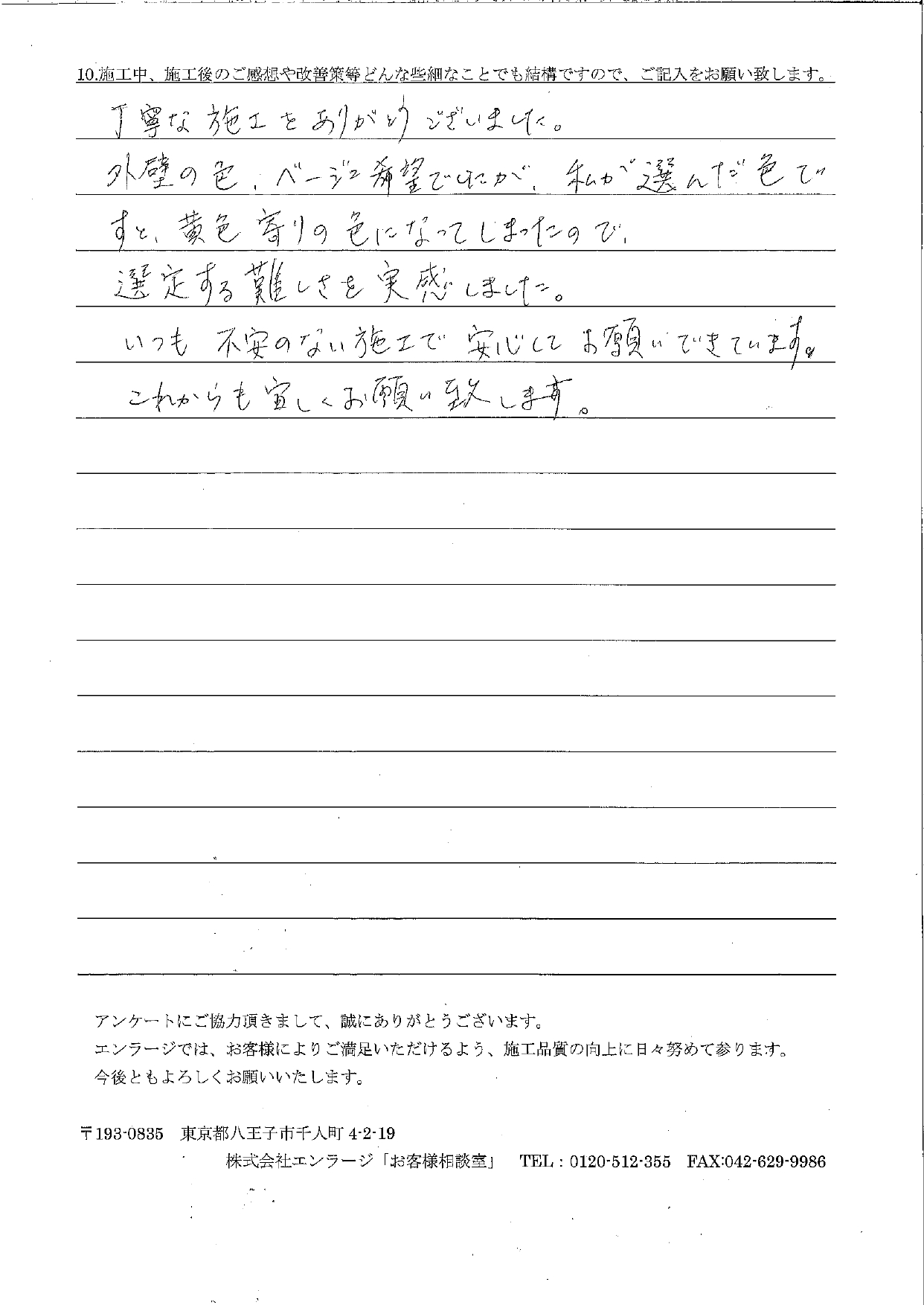 H様 この度は屋根と外壁の塗装工事をお任せ頂きありがとうございました。H様は以前サッシ交換の工事をお任せ頂いたOB様で、秋の八王子市民リフォーム祭にお越し頂き、屋根と外壁のご相談を頂きました。屋根の木下地が一部傷んでいたため、下地のやり替えや屋根の部分葺き替えを行いましたが、雨漏りも止まりご安心頂けと思います。「さすが村松さん!」と何度も褒めて頂いたのでとても嬉しかったです。お近くなので、これからも宜しくお願い致します。 施工管理 村松