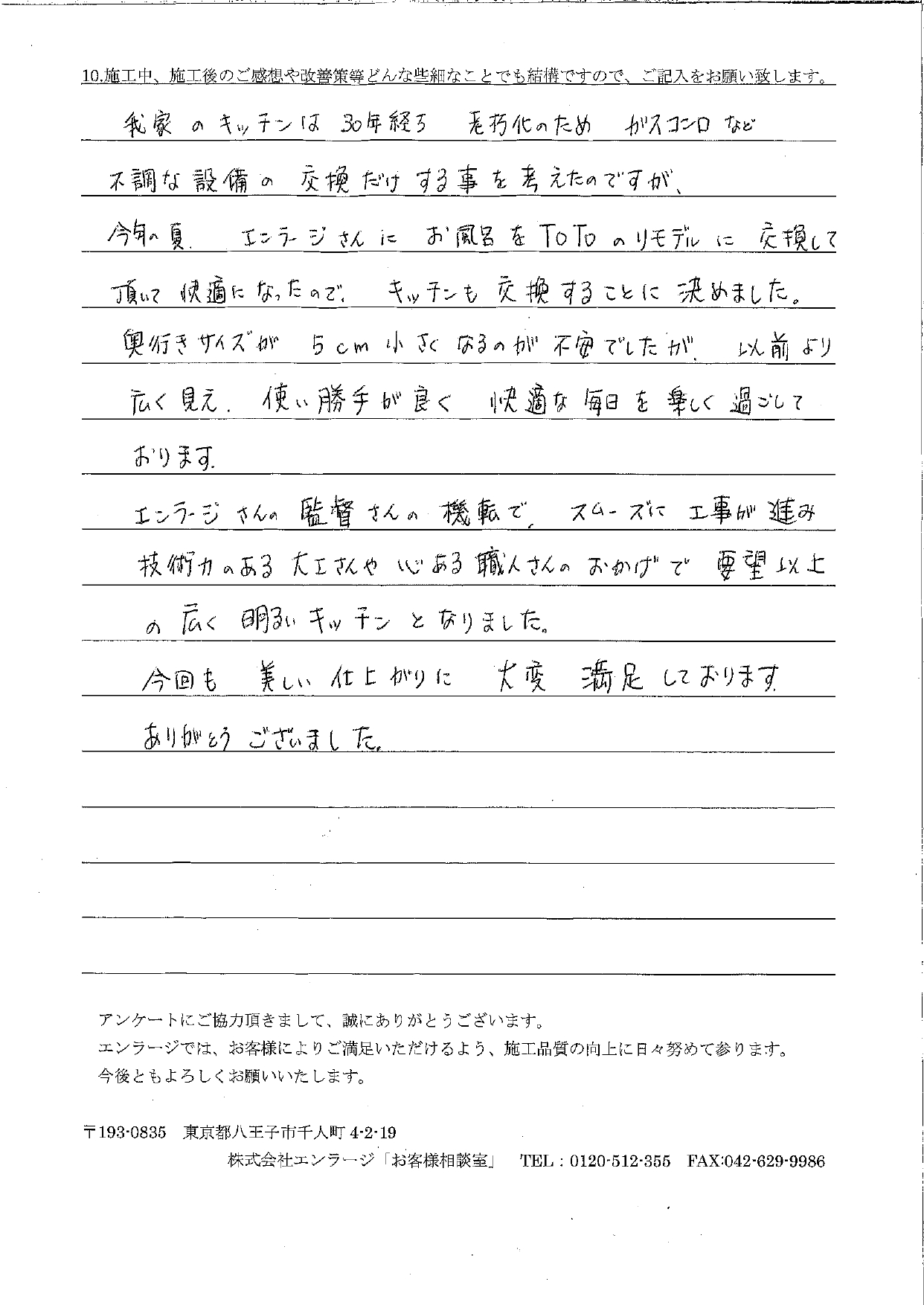 T様 お風呂と洗面室の工事に続き、今回はキッチンの工事をご依頼いただきまして誠にありがとうございました。TOTOショールームでのお打合せの際にシンプルで機能的なデザインと美しい石目調のクリスタルカウンターを気に入っていただき『ザ・クラッソ』をご採用いただきました。工事中は排気ダクトの形状が特殊だったことが分かり、急遽手配を変更するなどでお時間をいただきましたが、エンラージの対応力と工事の仕上がりをお喜びいただけたことは私も現場監督の成川もとても嬉しく、安心いたしました。完成後お伺いした際には『以前よりもキッチンが広く、明るくなったみたい!』と喜んでいただき、実際に『ぺルラホワイト』の扉も真珠のようにキラキラとしていてとても素敵でした♪