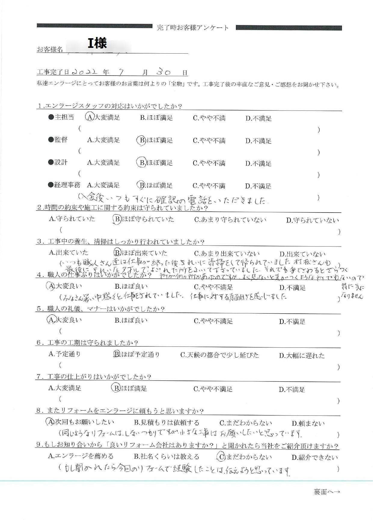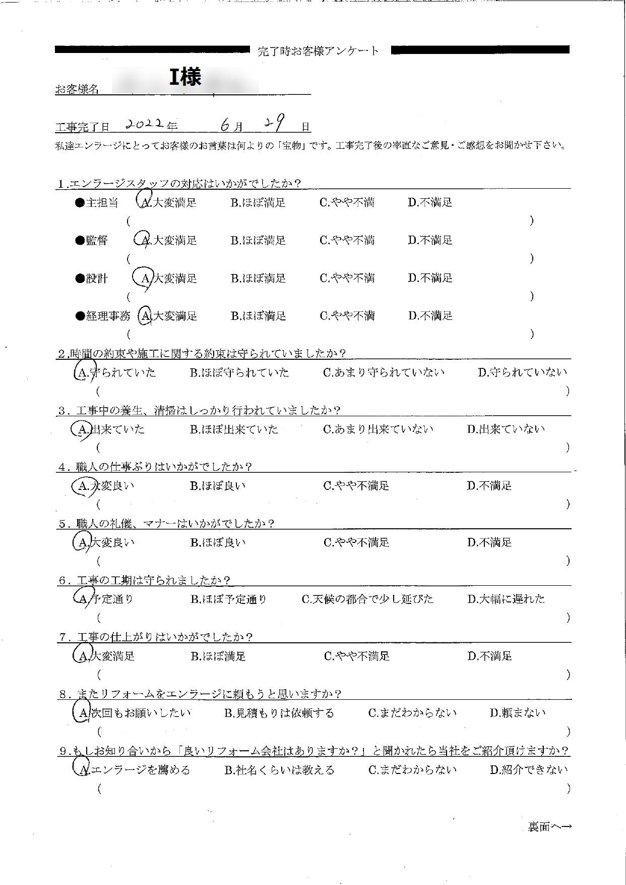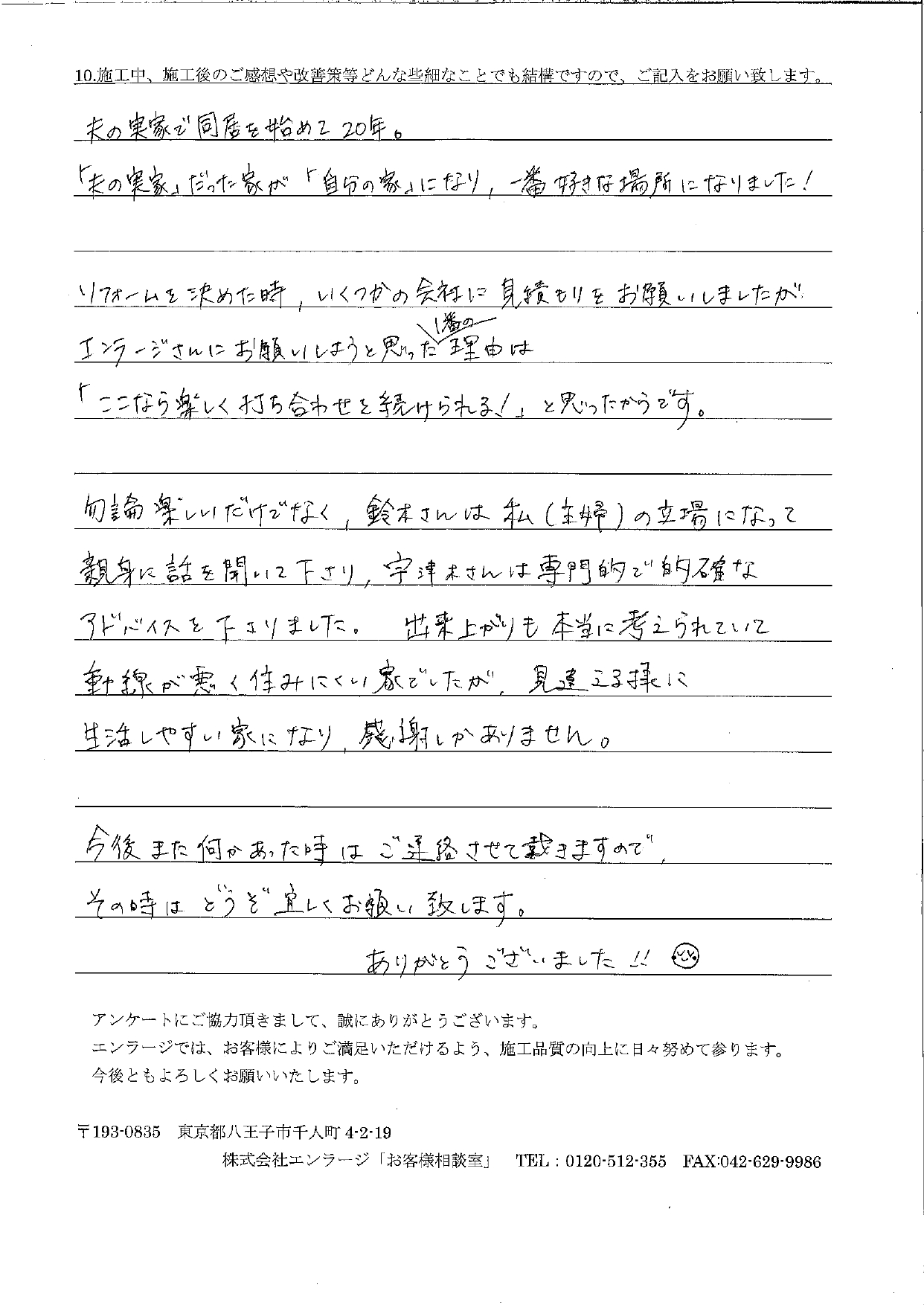 I様へ この度は水廻りの交換と内装工事をお任せ頂きありがとうございました。I様との出会いは春の「八王子市民リフォーム祭」でしたね。以前大規模にリフォームしたLDKをより使いやすくリフォームしたいというご相談でした。最初に接客した現場監督の村松と一緒に、プランナーの私もI様のこれからの暮らしをイメージしながらプランニングさせていただきました。気に入っていただけて本当に嬉しいです。ご丁寧なお手紙をいただきありがとうございました。私の宝物にさせていただきます。 プランナー 前田