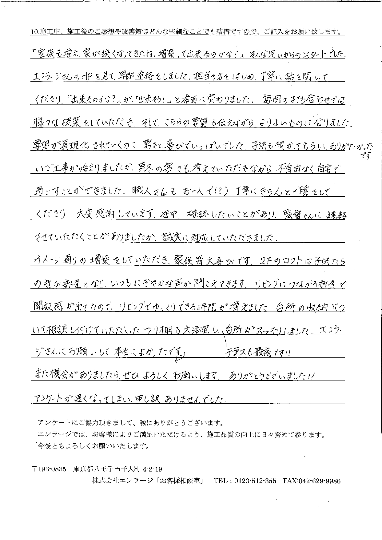 T様 この度は増築工事をお任せいただき誠にありがとうございました。また、このような満点評価をいただくことができて大変嬉しく思います!初めてお会いした際にT様のお悩みやご希望をお伺いし、ご家族が快適で幸せにお暮らしになるためにはどんなリフォームが最適かを考え、増築プランをご提案させていただきました。工事中は冬の時期で、お住まいになりながらでしたのでご不便をおかけしないよう監督の小川や職人と出来る限り配慮をさせていただきました。完了立ち合いでお伺いした際には、早速お子様たちが遊んでいる様子を拝見でき、とても嬉しい気持ちになりました。その時のお写真は今でも私の宝物です。また何かお困りの際はいつでもご連絡下さいね。お子様の成長、ご家族のご健康を心からお祈りしております。 プランナー 前田