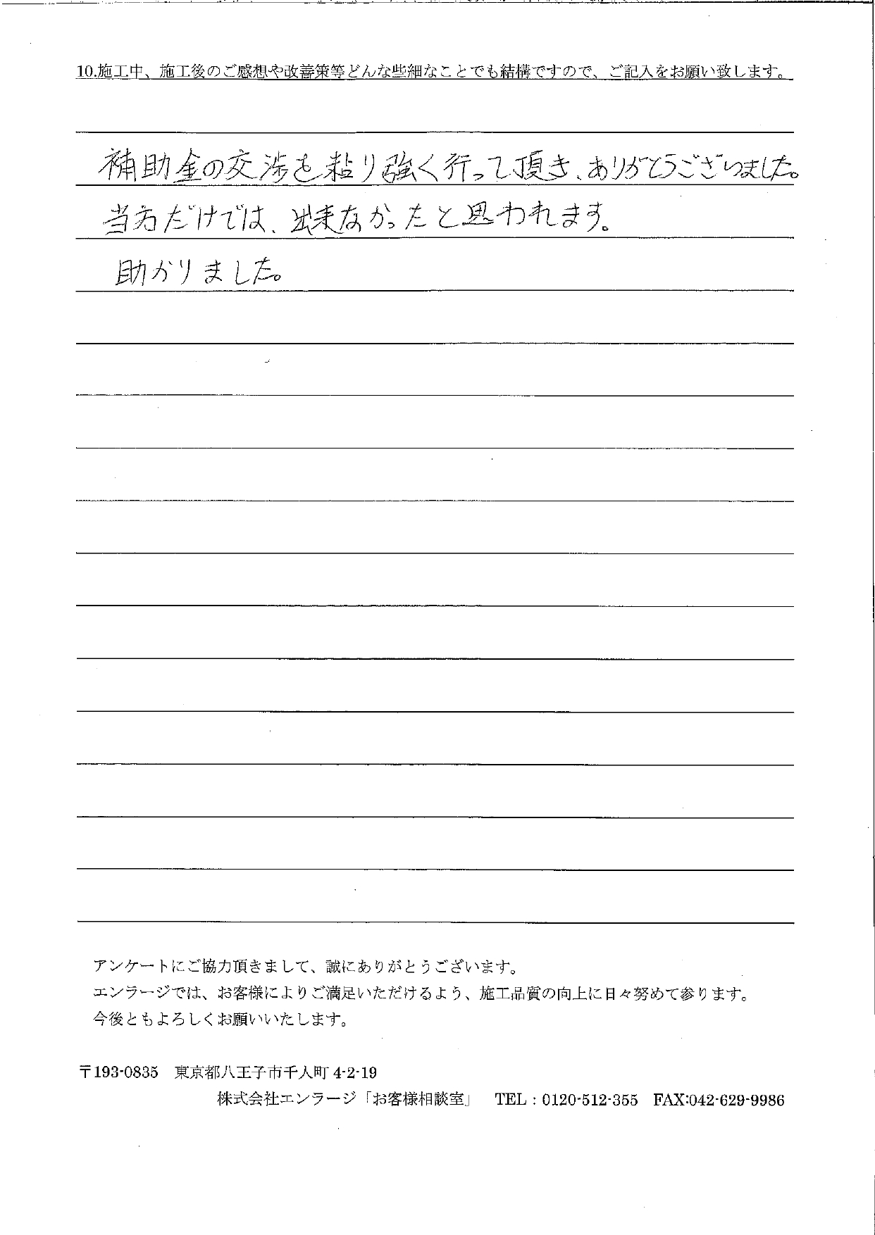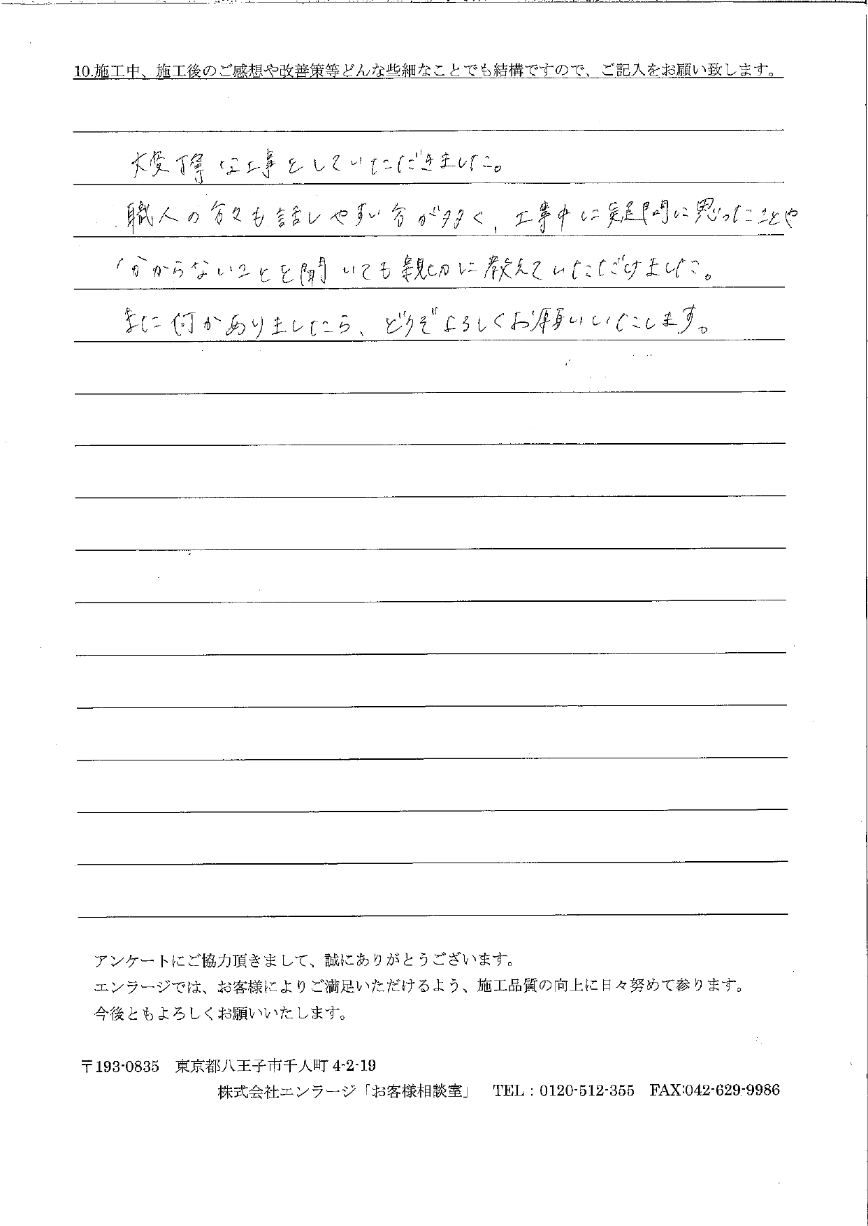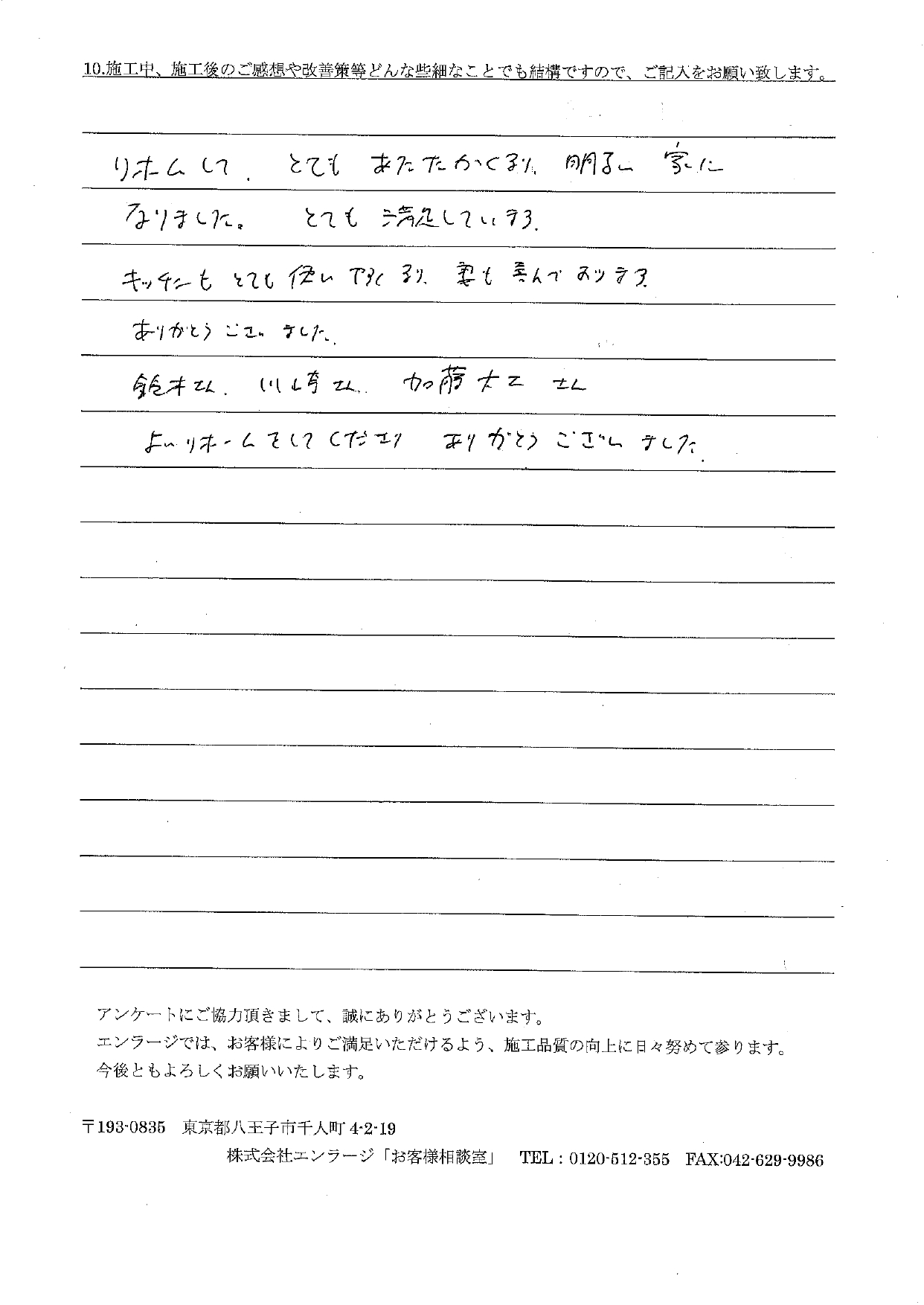 Y様 この度は耐震リフォーム工事をお任せ頂き誠にありがとうございました。ご在宅での工事で大変な事もあったかと思いますが、当社の職人さんや施工についてお褒めの言葉を頂きとても嬉しいです。今回の工事は外部から構造用合板を貼って外装を一新し、瓦屋根を軽い屋根材に葺き替えて耐震強度1.0以上を確保しました。万一の災害時にも安心してお住まい頂けるお家になったと思います。これからもお困りの事がございましたらいつでもご相談ください。今後共、末長いお付き合いをよろしくお願いいします。 八王子店 松村