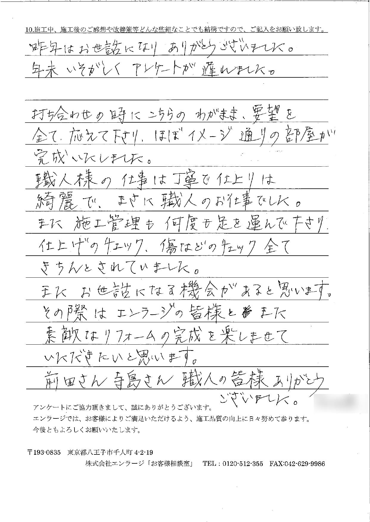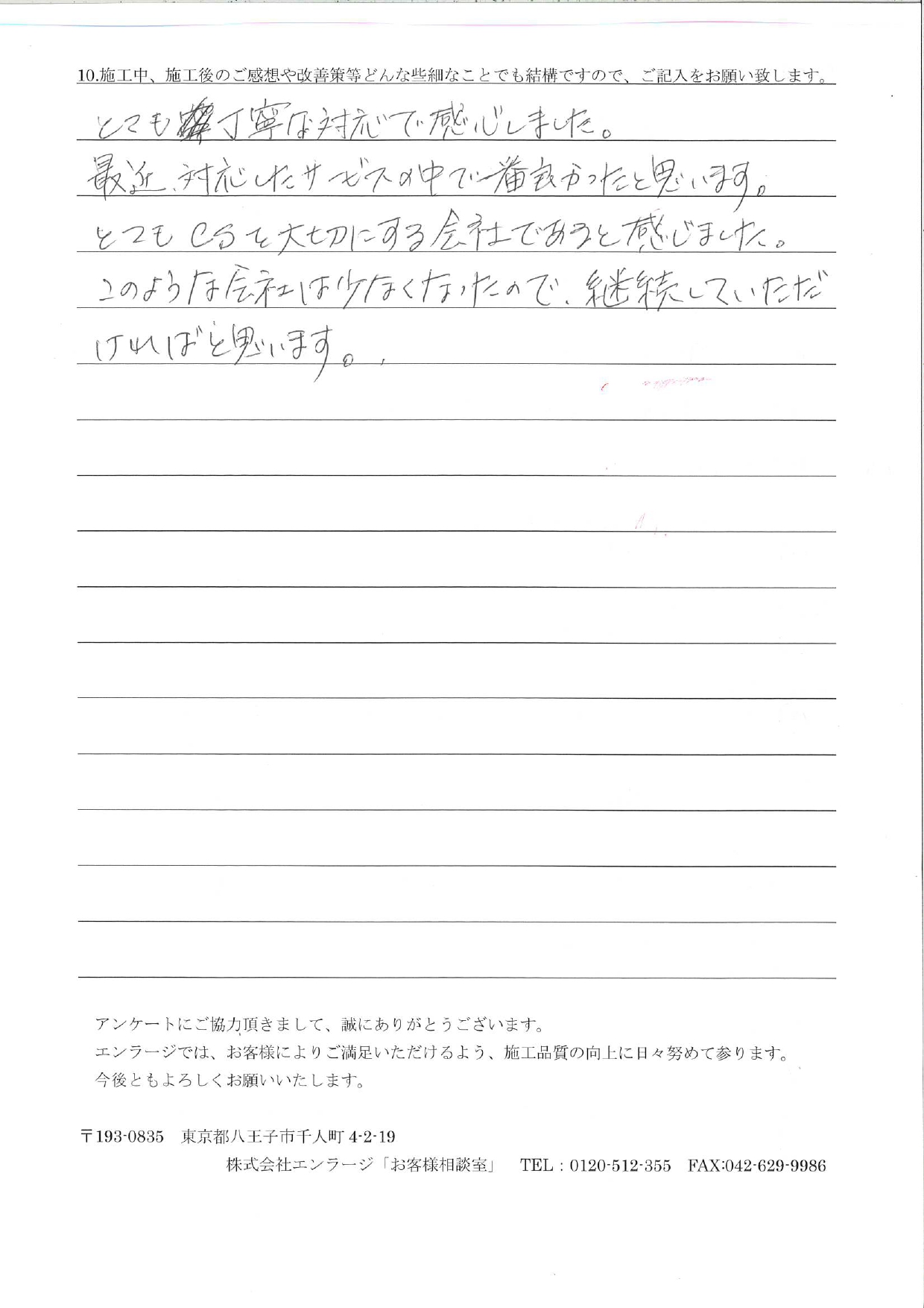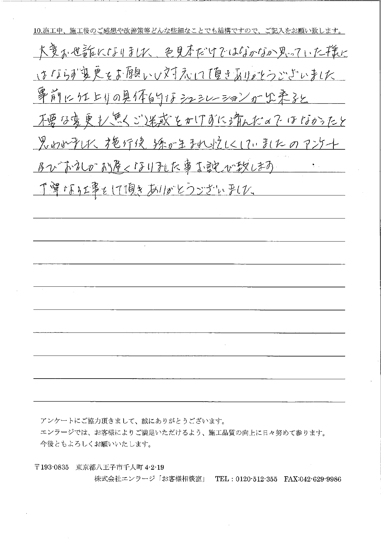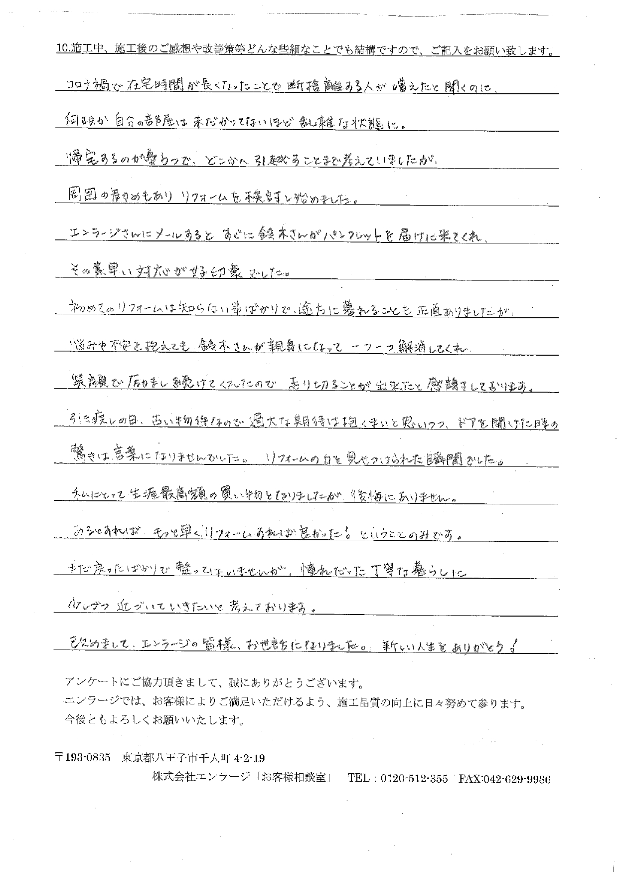 Y様 この度は耐震リフォーム工事をお任せ頂き誠にありがとうございました。ご在宅での工事で大変な事もあったかと思いますが、当社の職人さんや施工についてお褒めの言葉を頂きとても嬉しいです。今回の工事は外部から構造用合板を貼って外装を一新し、瓦屋根を軽い屋根材に葺き替えて耐震強度1.0以上を確保しました。万一の災害時にも安心してお住まい頂けるお家になったと思います。これからもお困りの事がございましたらいつでもご相談ください。今後共、末長いお付き合いをよろしくお願いいします。 八王子店 松村