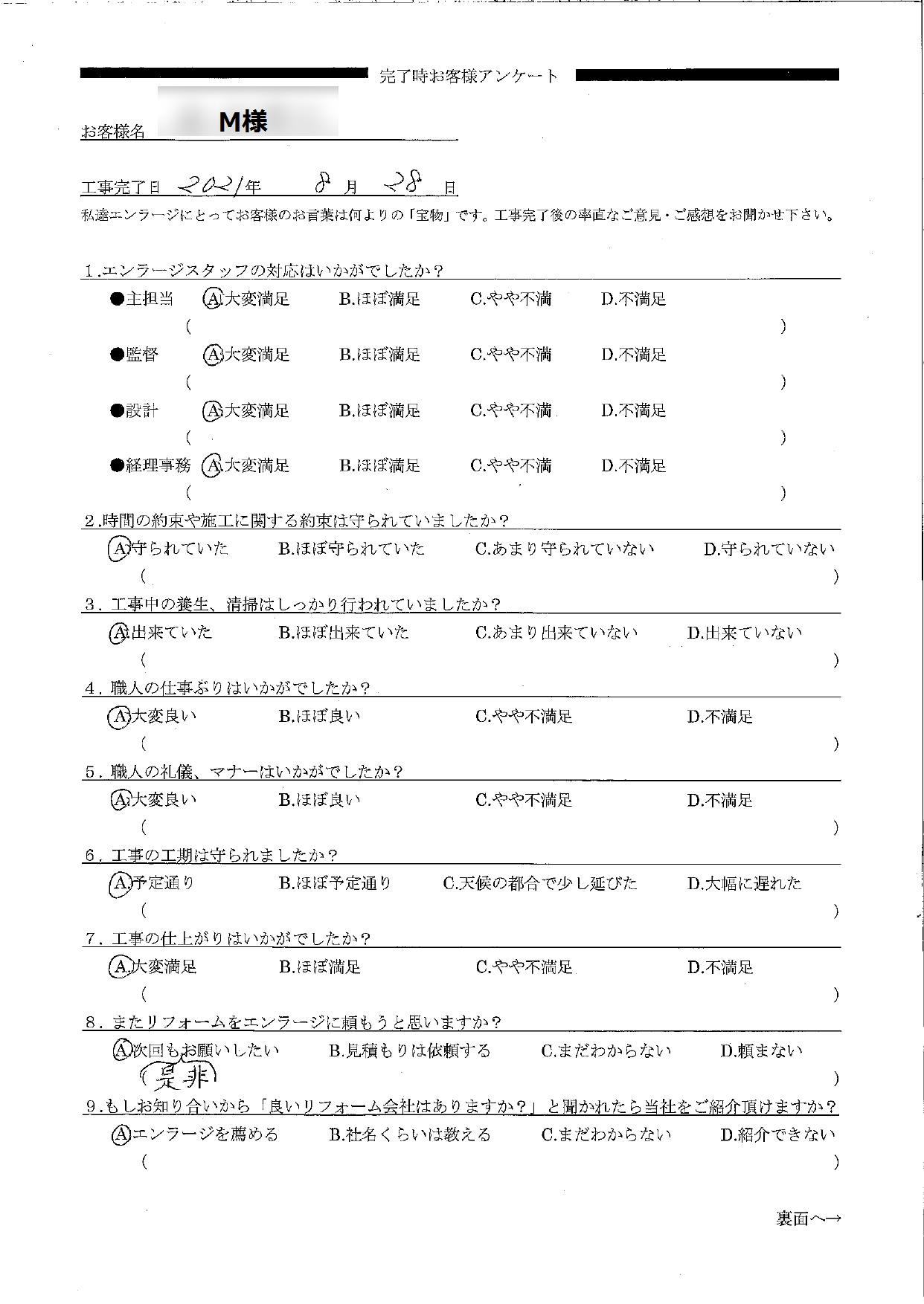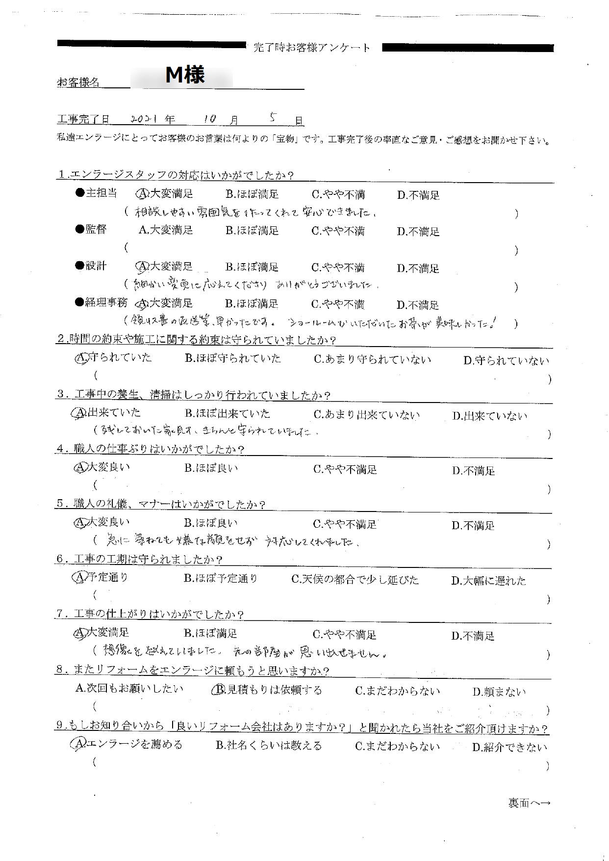 M様 この度は3回目の工事をお任せいただき、誠にありがとうございました。オールAのアンケートをいただき、設計担当の荻田・施工担当の寺島と共に安堵しております。Mさまは大切なお客様なので今回も絶対にお喜びいただけるよう、チームで誠心誠意尽くさせていただきました。特にシロアリのことを心配されていたのでしっかりと防蟻処理をさせていただき、お風呂も安心して快適にお使いいただけるよう工夫をさせていただきました。これで水廻り設備全て当社にお任せいただけたこと重ねてお礼申し上げます。なにかございましたら飛んでいきますので、お気兼ねなくご相談下さいね。いつでもお待ちしております。今後共、末永いお付き合いをよろしくお願いいたします。 プランナー 前田