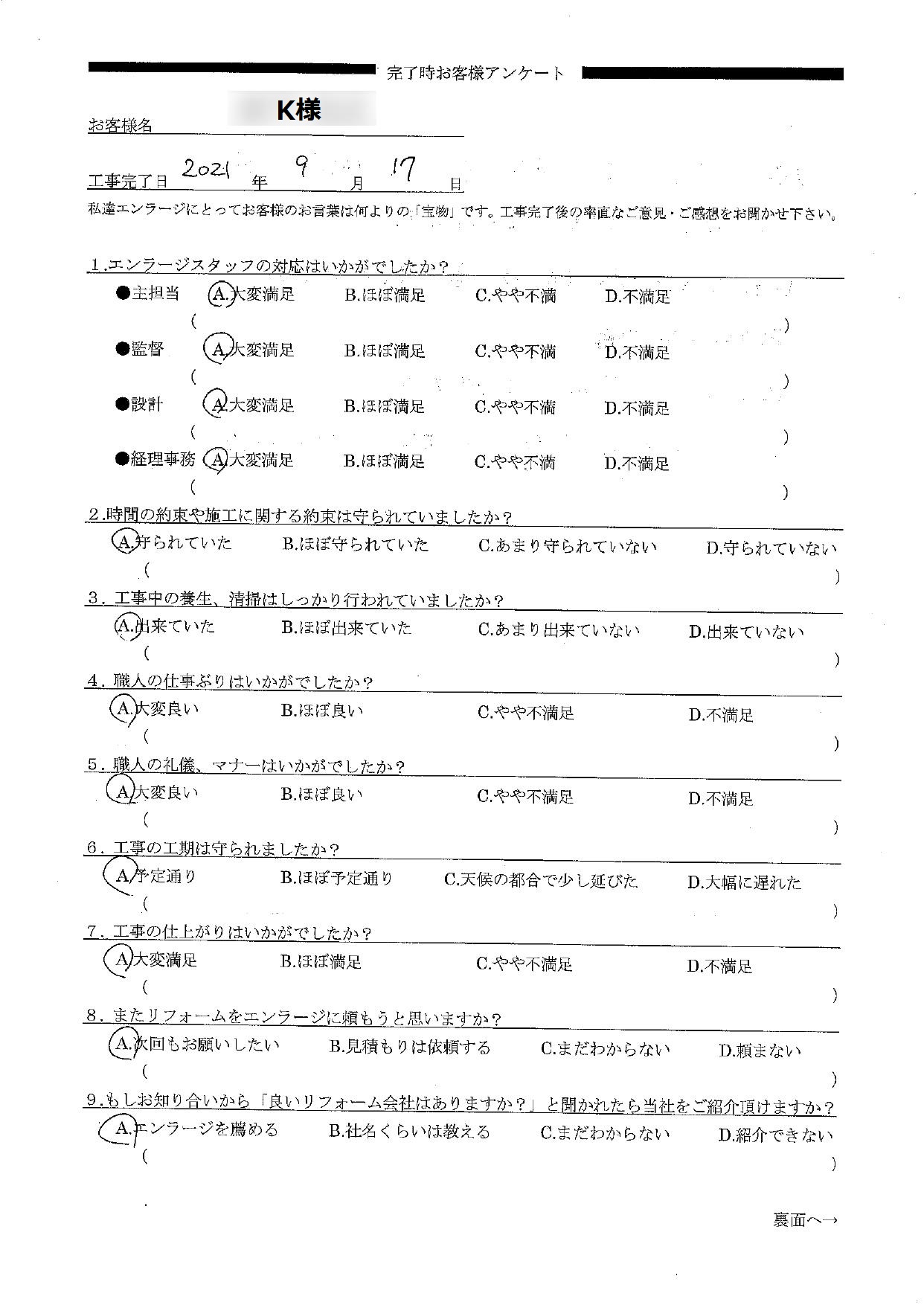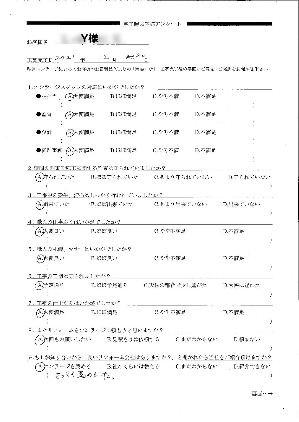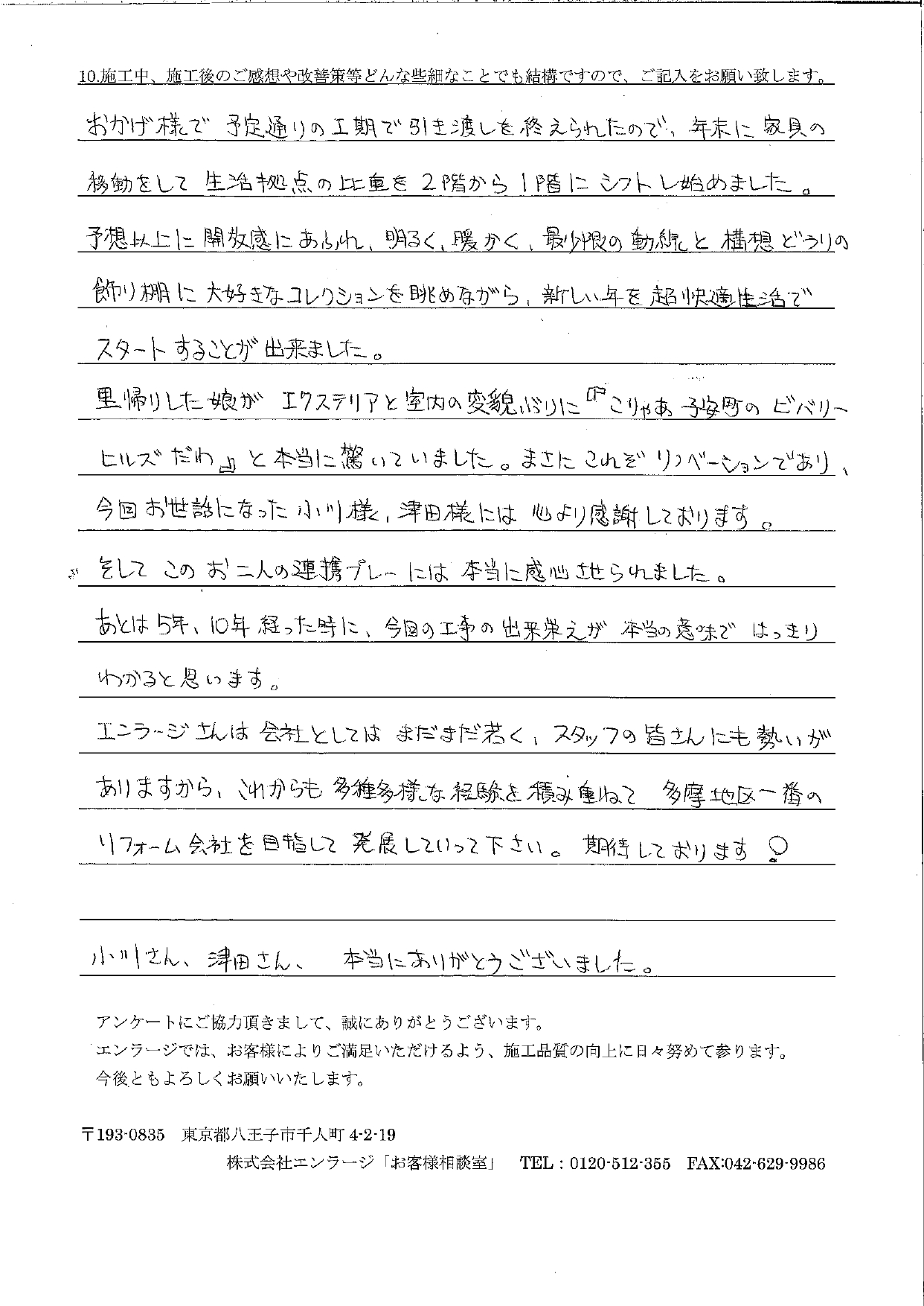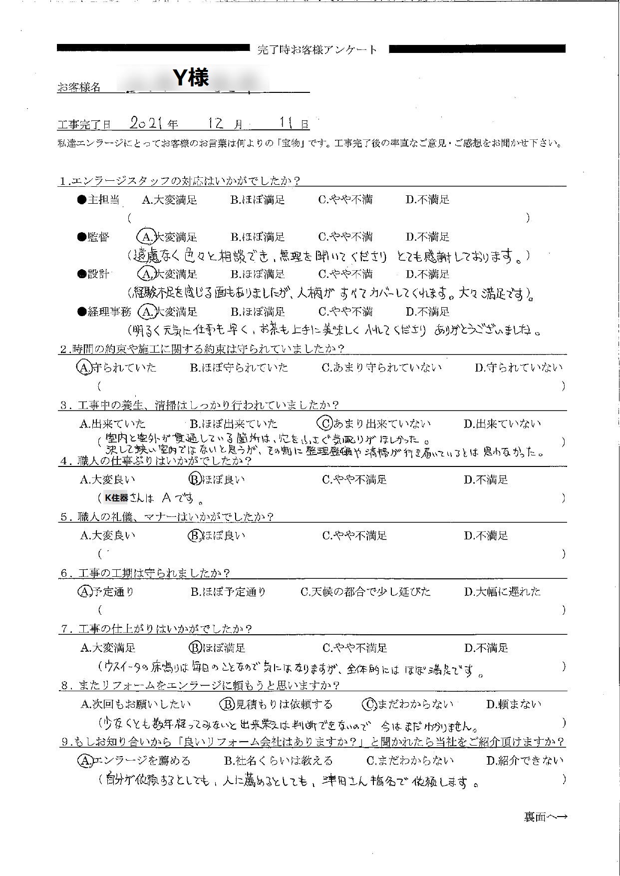 Y様 この度は大切なご自宅のリフォームをお任せいただきありがとうございました。白を基調とした内装や設備に、鮮やかなアクセントクロスが映えるとても素敵なLDKになりましたね!お引渡しの際には、工事で設置した飾り棚にご夫婦それぞれのコレクションをきれいに飾ってくださっていて、私も施工管理の小川もとても感動しました! 外構工事では私のミスでご迷惑をお掛けしたにも関らず「次回も津田さん指名でお願いします」とお書きいただき、本当に嬉しかったです。今後5年、10年とお暮し頂いて「エンラージで工事をして良かった!」と感じて頂けたら嬉しいです!これからも末永いお付き合いをお願い致します。北野支店プランナー 津田