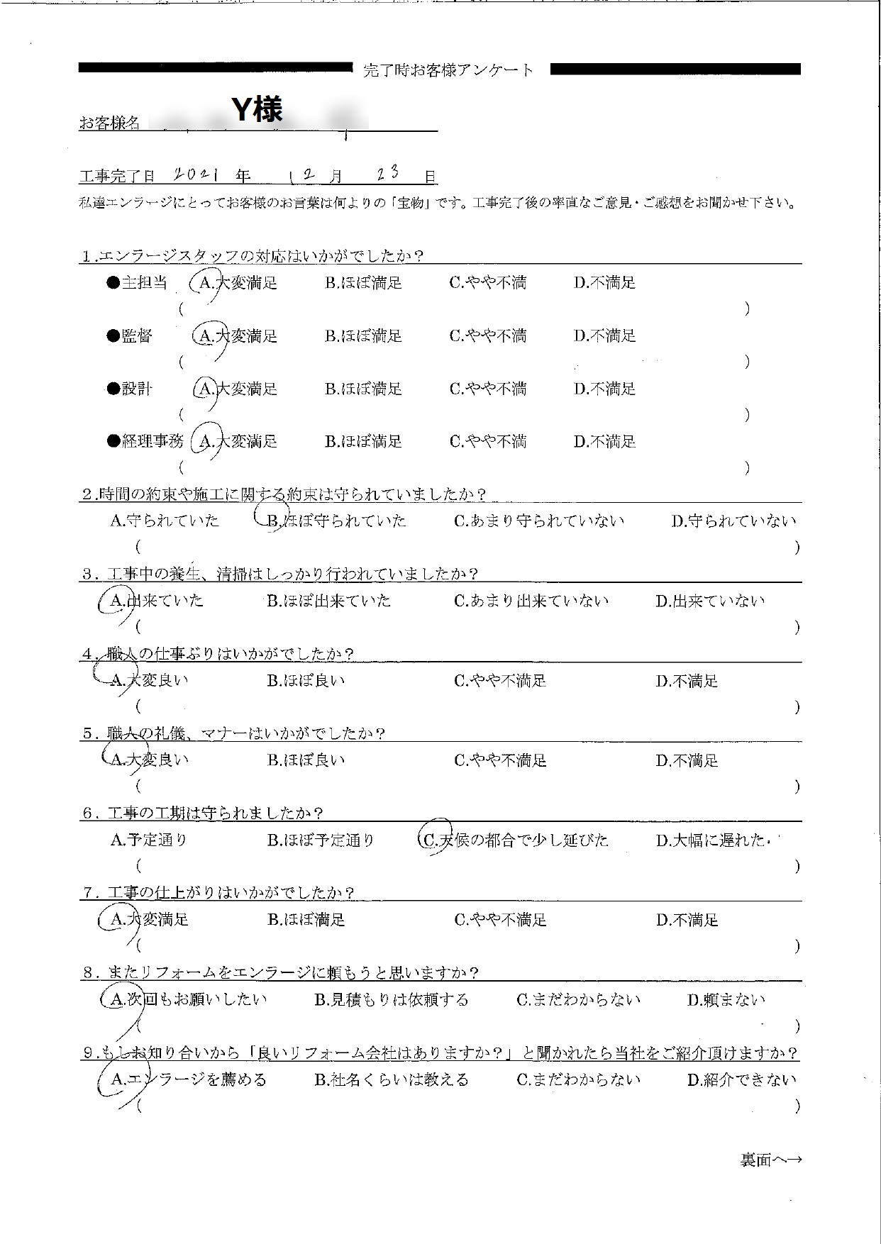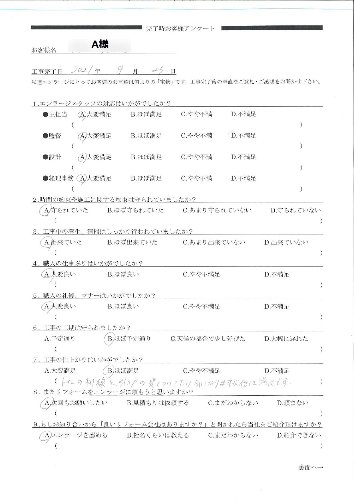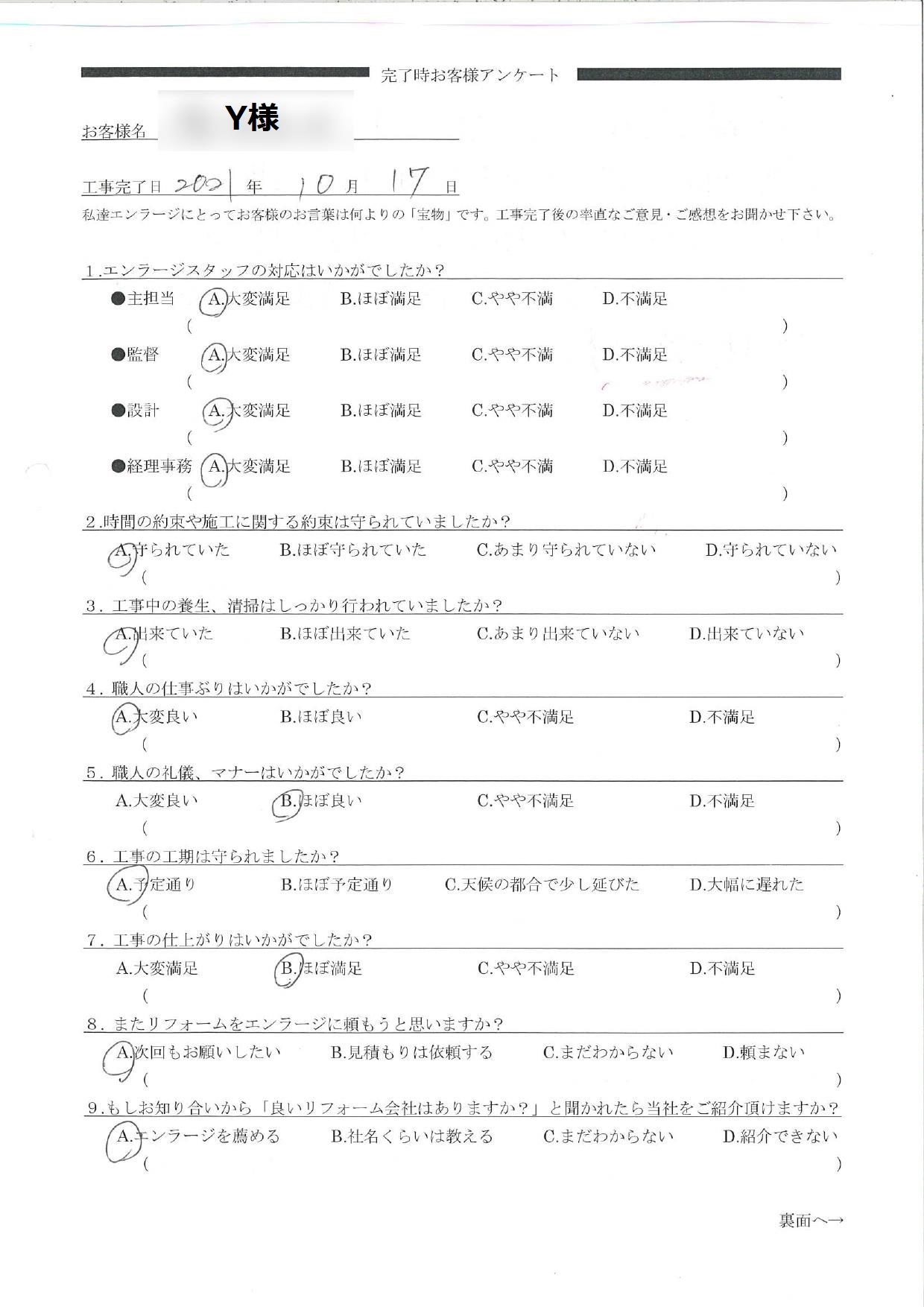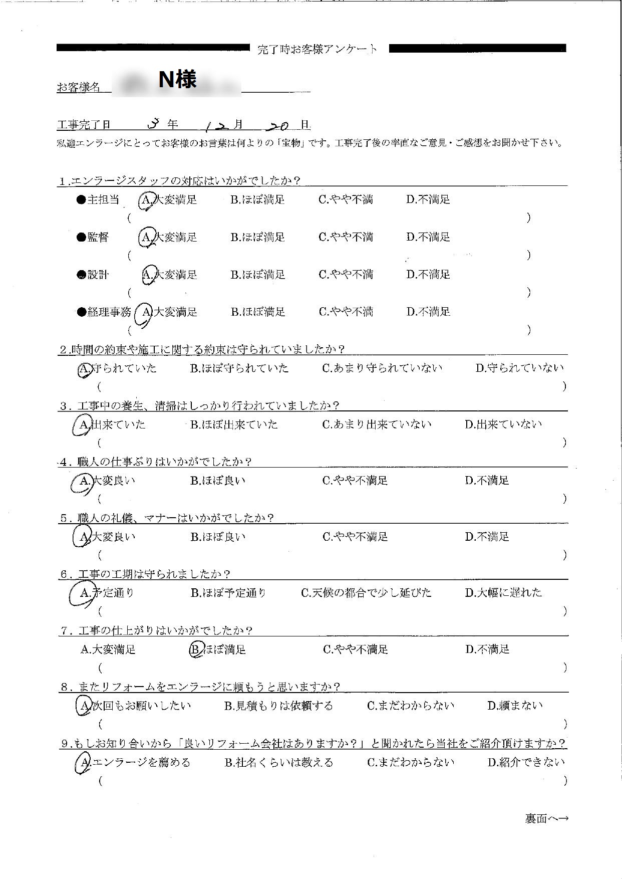 Y様 この度は大切なご自宅のリフォームをお任せいただきありがとうございました。白を基調とした内装や設備に、鮮やかなアクセントクロスが映えるとても素敵なLDKになりましたね!お引渡しの際には、工事で設置した飾り棚にご夫婦それぞれのコレクションをきれいに飾ってくださっていて、私も施工管理の小川もとても感動しました! 外構工事では私のミスでご迷惑をお掛けしたにも関らず「次回も津田さん指名でお願いします」とお書きいただき、本当に嬉しかったです。今後5年、10年とお暮し頂いて「エンラージで工事をして良かった!」と感じて頂けたら嬉しいです!これからも末永いお付き合いをお願い致します。北野支店プランナー 津田