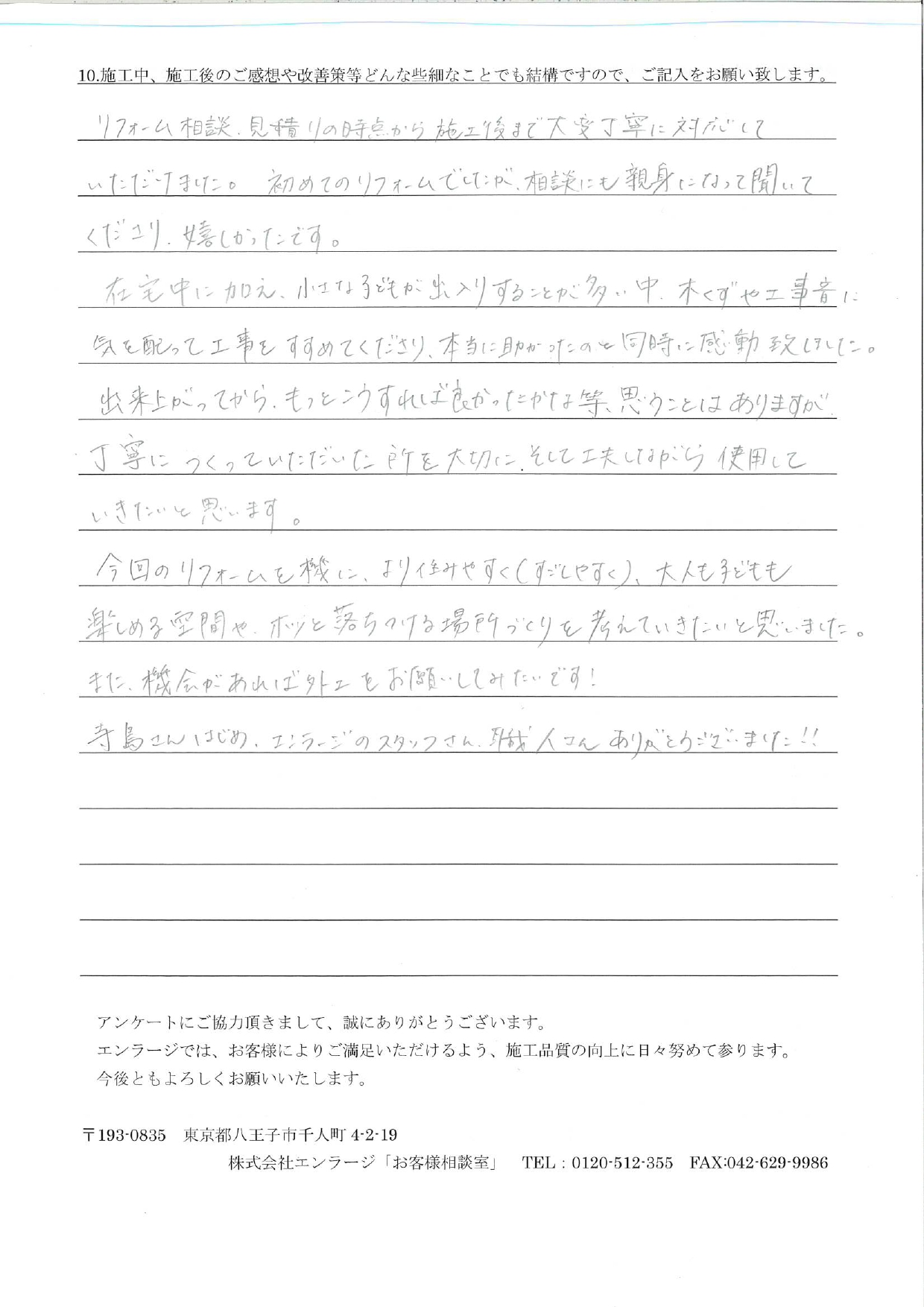 A様へ この度は内装のリフォーム工事をお任せ頂きありがとうございました。A様はご自宅で保育のお仕事をされているので、お子様の安全のためにリフォームしたいというご希望でした。施工中も保育を続けていらっしゃったので、お子様の安全には十分に配慮致しました。A様にお喜び頂けて、本当に嬉しいです。これからも宜しくお願い致します。 日野支店施工管理 寺島