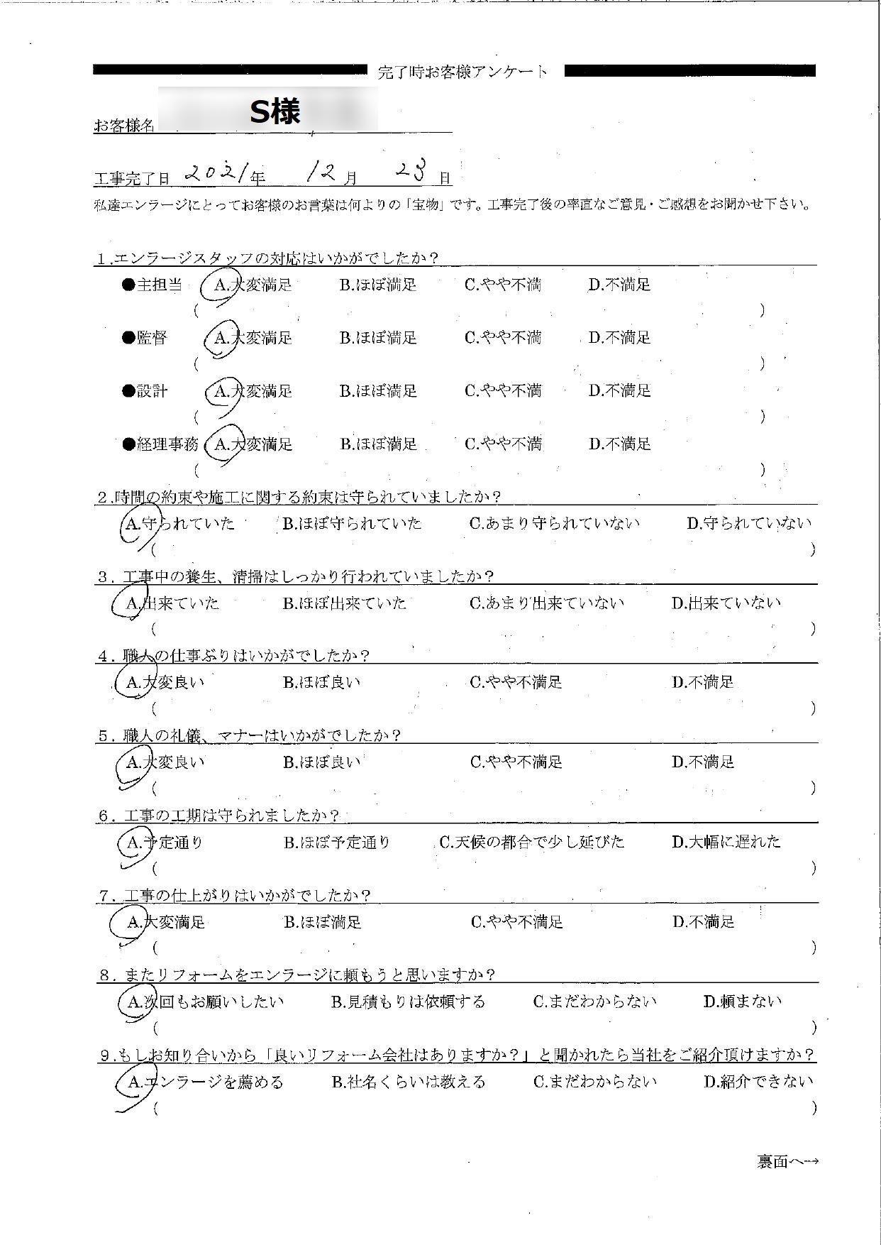 S様 前回の浴室・洗面交換工事に続き、早速のリピート工事をお任せいただき有難うございました!前回の工事をとてもお喜びいただけたのでより一層、私を含め施工管理・職人共 誠心誠意尽力いたしました。デザインや使い勝手など、こだわりが詰まった素敵な間取りになりましたね。施工中にはたくさんの配慮をいただき感謝申し上げます。S様だからこそ、関わったチーム全員が幸せな気持ちになりました。また一緒に素敵なリフォームができること心より楽しみにしております。これからもよろしくお願いいたします。 プランナー 前田