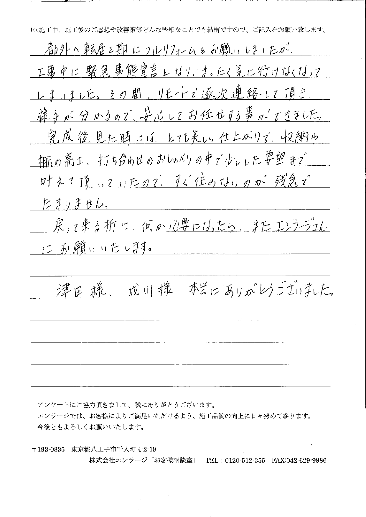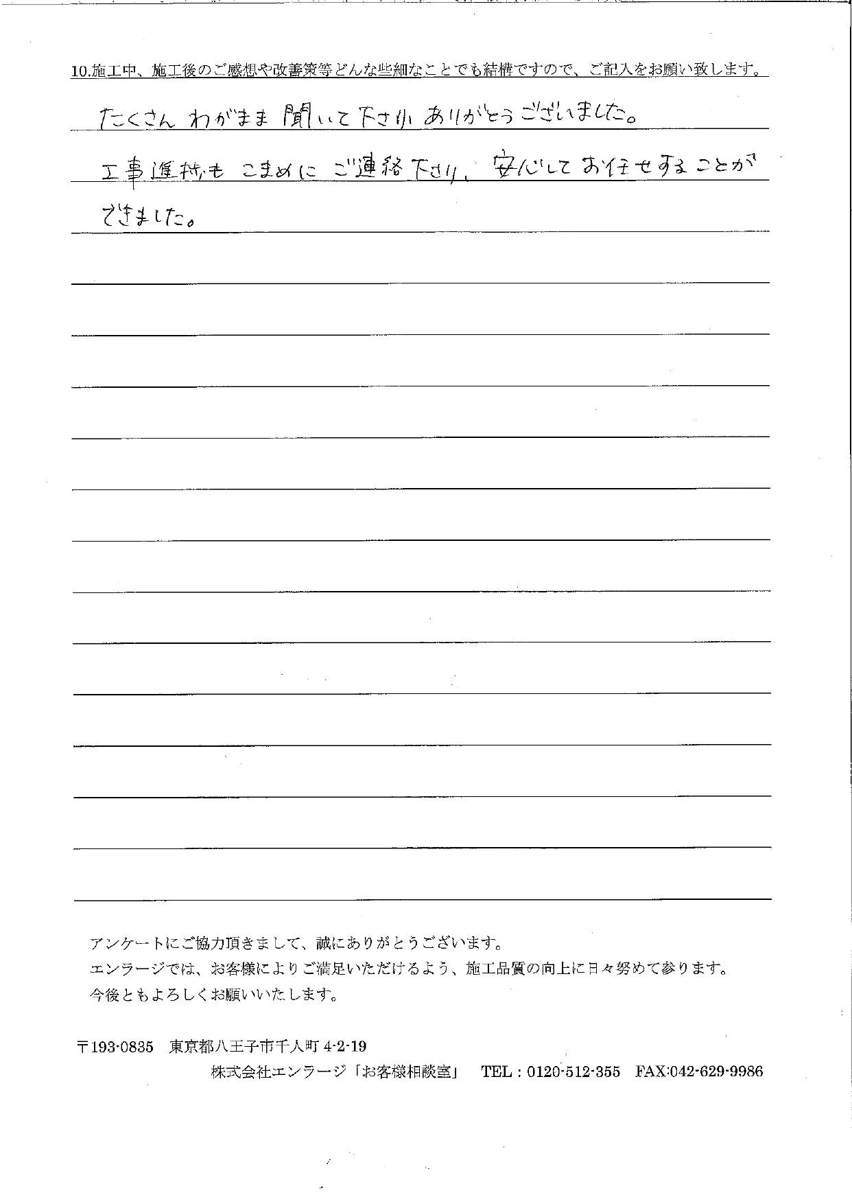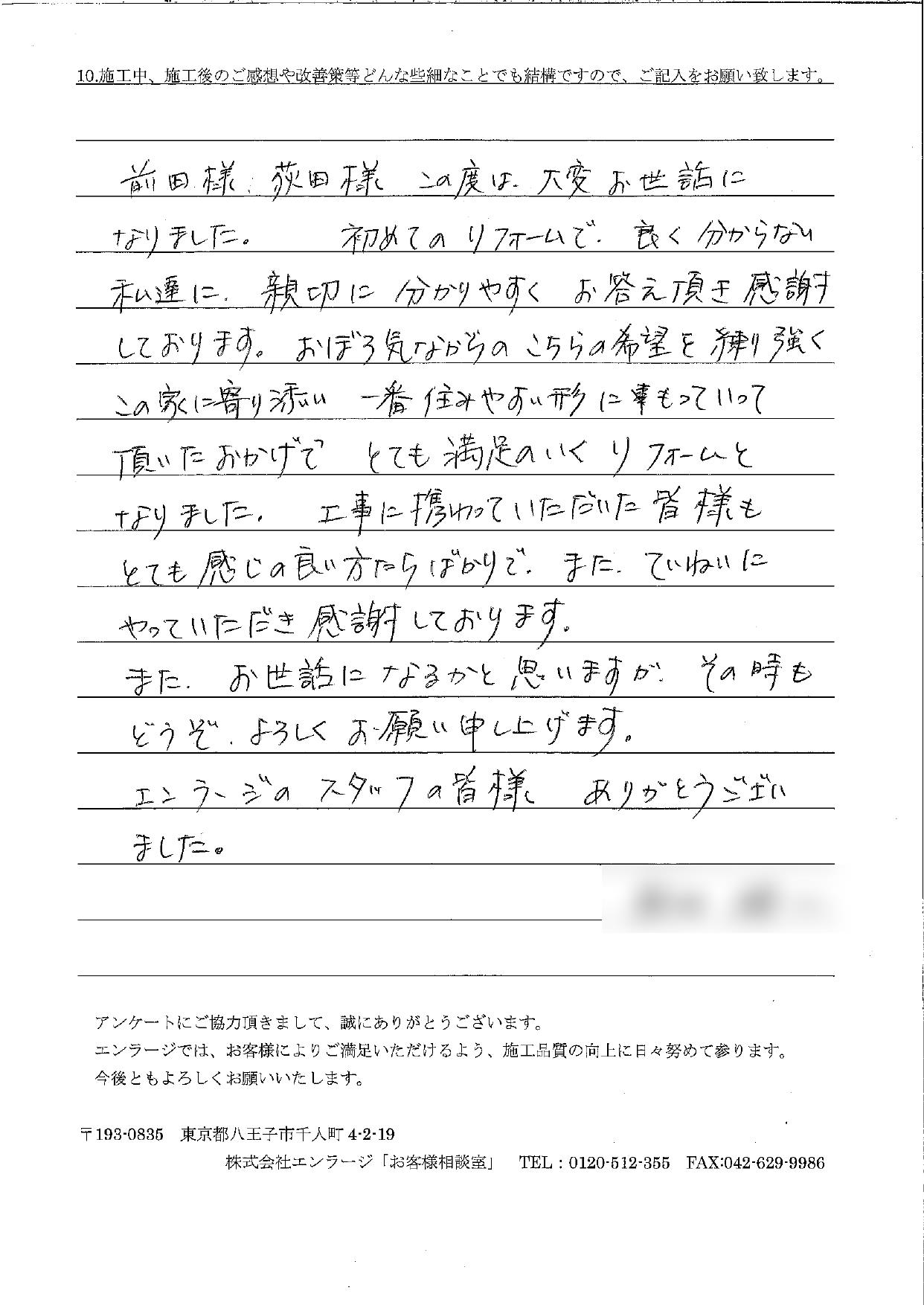 M様 この度はご自宅のマンションの全面リフォーム工事をお任せいただきありがとうございました。M様は昨年秋のリフォーム祭にご来場いただき、お見積り提出と同時にご契約いただけたほどご信頼をいただいておりました。ご期待に応えるため、現在はお仕事の都合で遠方にお住いのM様へ、工事の進捗を写真を添えてご報告をさせて頂きながら進めてまいりました。お引渡しの際は雰囲気のガラッと変わったご自宅をとても喜んで下さり、私もとても嬉しかったです。八王子に戻られた際はいつでもお気軽にショールームへ遊びに来てくださいね。 プランナー 津田