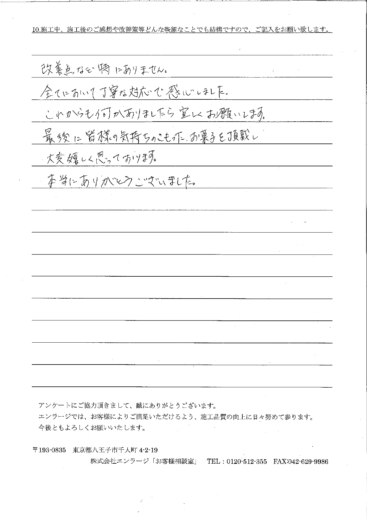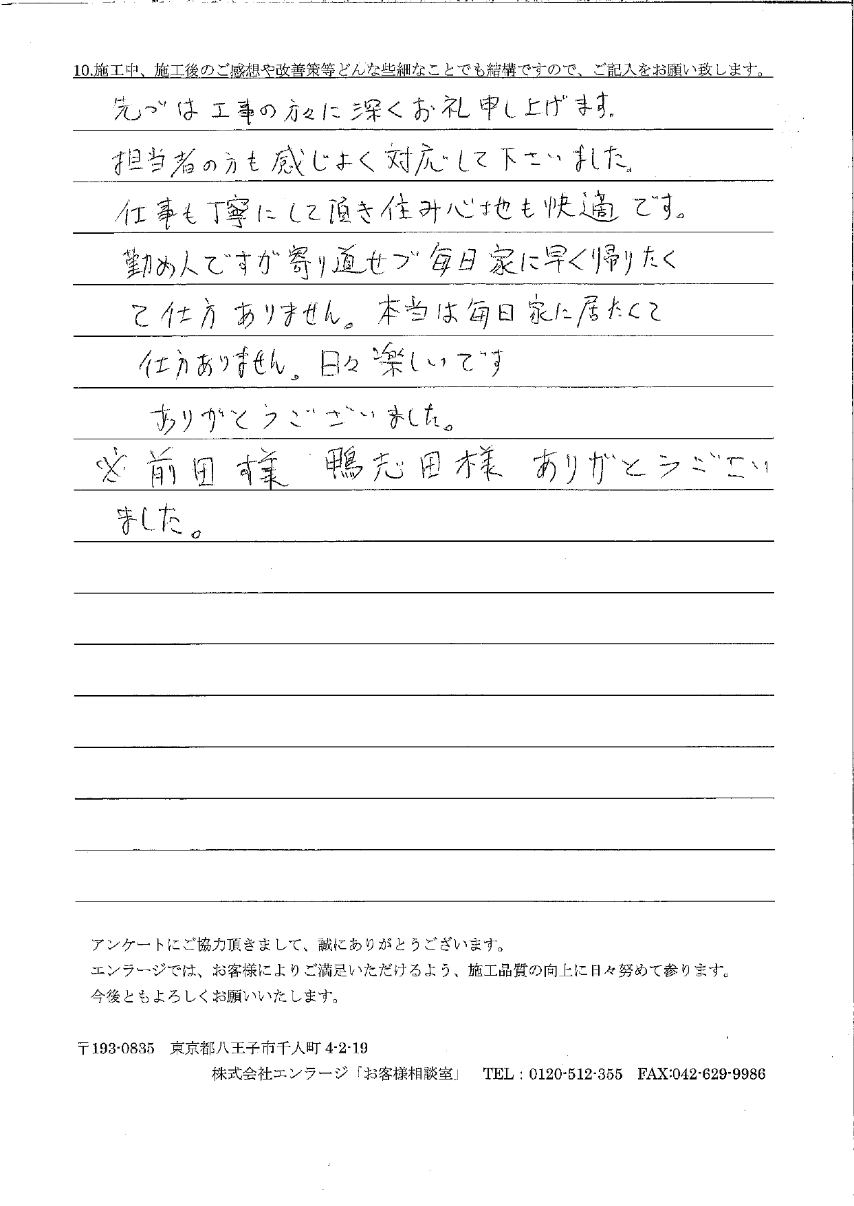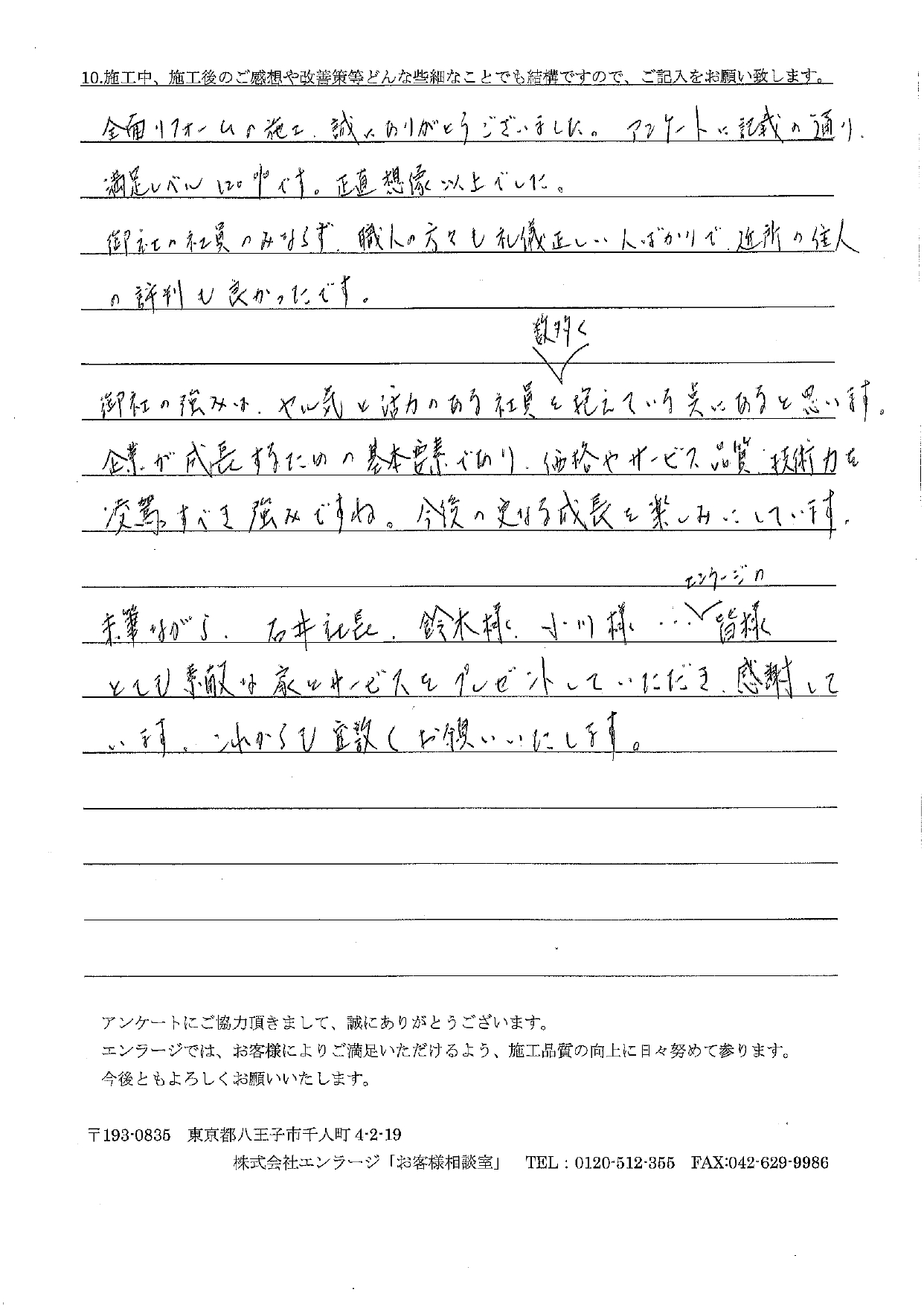 M様 この度はご自宅のマンションの全面リフォーム工事をお任せいただきありがとうございました。M様は昨年秋のリフォーム祭にご来場いただき、お見積り提出と同時にご契約いただけたほどご信頼をいただいておりました。ご期待に応えるため、現在はお仕事の都合で遠方にお住いのM様へ、工事の進捗を写真を添えてご報告をさせて頂きながら進めてまいりました。お引渡しの際は雰囲気のガラッと変わったご自宅をとても喜んで下さり、私もとても嬉しかったです。八王子に戻られた際はいつでもお気軽にショールームへ遊びに来てくださいね。 プランナー 津田