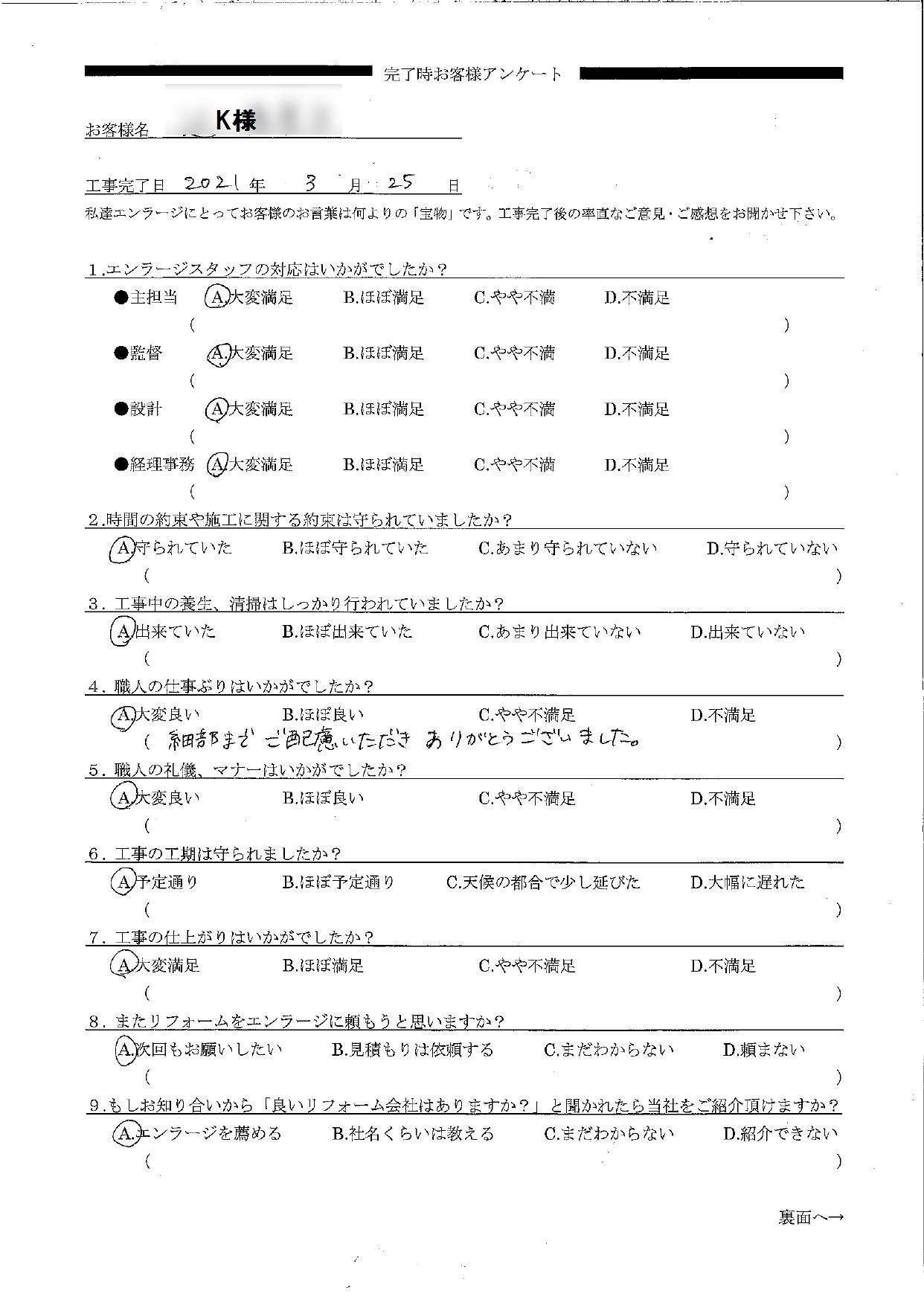 K様 この度はマンション全面リフォーム工事をお任せ頂き誠に有難うございました。また、アンケートにご協力頂きまして重ねて御礼申し上げます。K様や実際にお住いになられる妹様ご家族皆様は遠方にお住まいということで、なるべく工事の様子をお伝えできるようご連絡など工夫させていただきました。 安心して下さっていたとのお声を頂けてとても嬉しいです。また、妹様ご家族が過ごしやすいと感じるお家にできるよう設計の石井や監督の小川、職人さん達と力を合わせて工事をさせて頂きましたのでオールAの評価を頂くことができとても嬉しく思います。素敵なリノベーションに携わる事ができて私自身とても楽しく幸せな時間でした。また何かお困りの事がございましたらいつでもご連絡ください。これからもよろしくお願いいたします。プランナー 松村