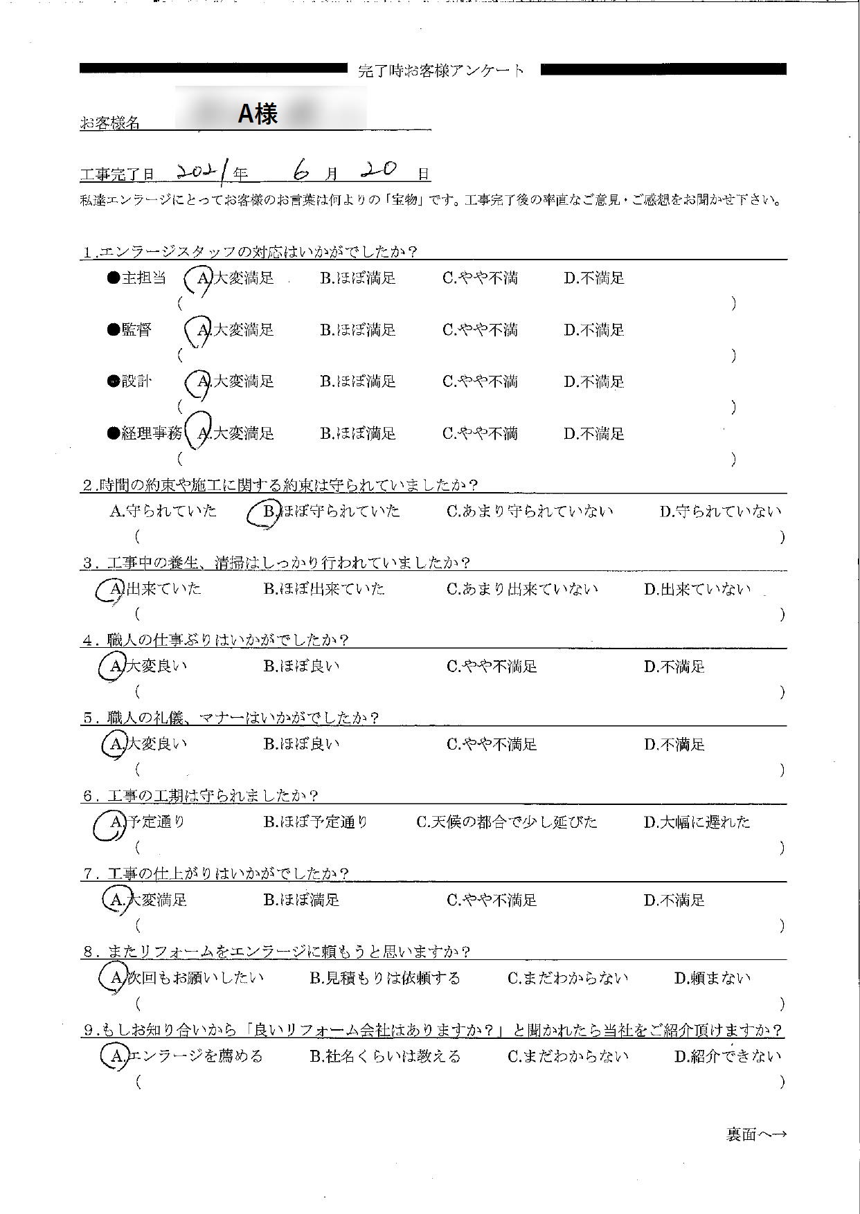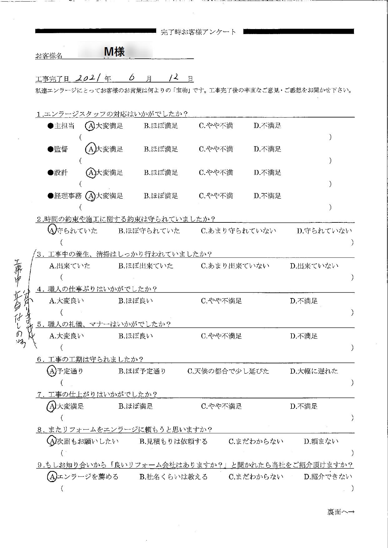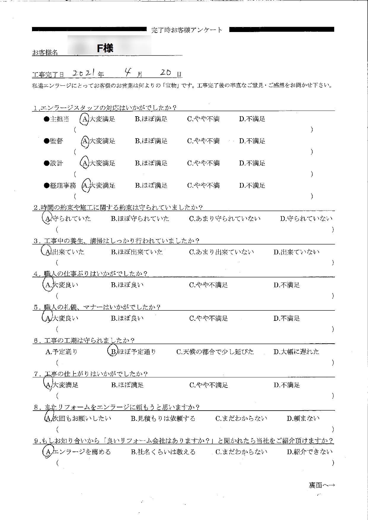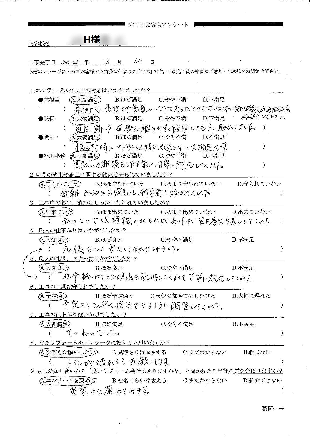 H様 この度はエンラージに浴室・洗面台交換工事をお任せいただきありがとうございました。年明けのコロナ禍真っ只中での打合せ・ショールーム見学・在宅工事等、可能な限りH様ご家族様にご負担・ご不便なく安心してお任せいただけるようスタッフ一同、精一杯務めさせていただきました。オールAのアンケートと温かいコメントを頂戴でき、大変嬉しく思っております。H様からのコメントを励みに今後も頑張っていきたいと思います。お忙しい中、アンケートにご協力いただき本当にありがとうございました。お近くまでお越しの際はぜひ、お茶をしに行く感覚でお気軽にお立ち寄りくださいませ。今後ともよろしくお願いいたします。 プランナー伊藤