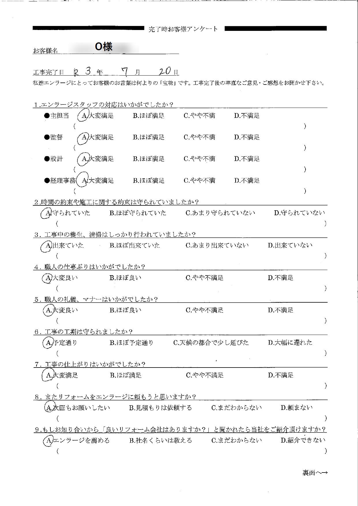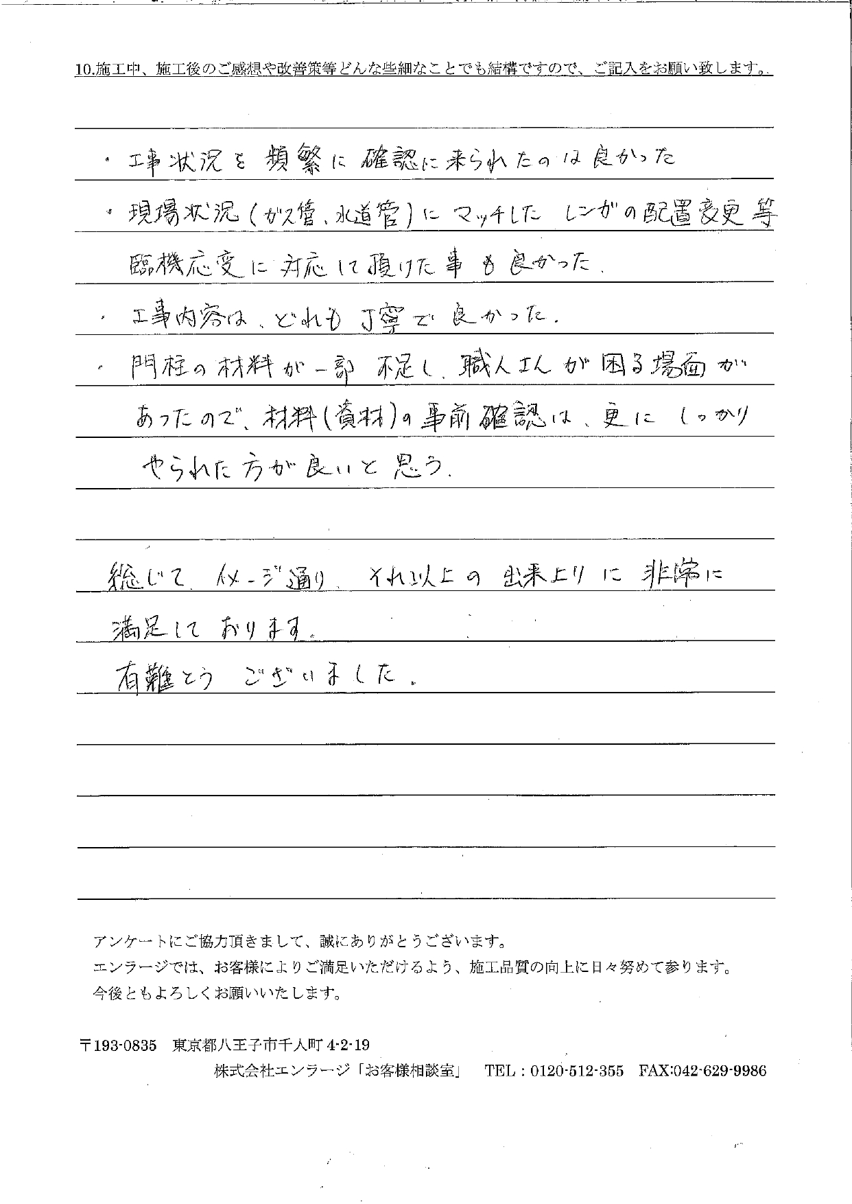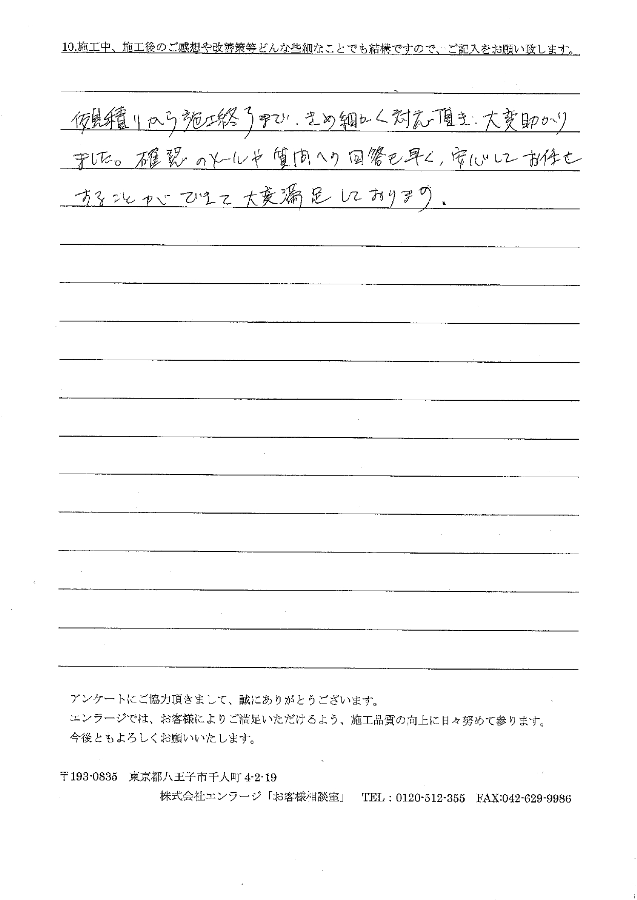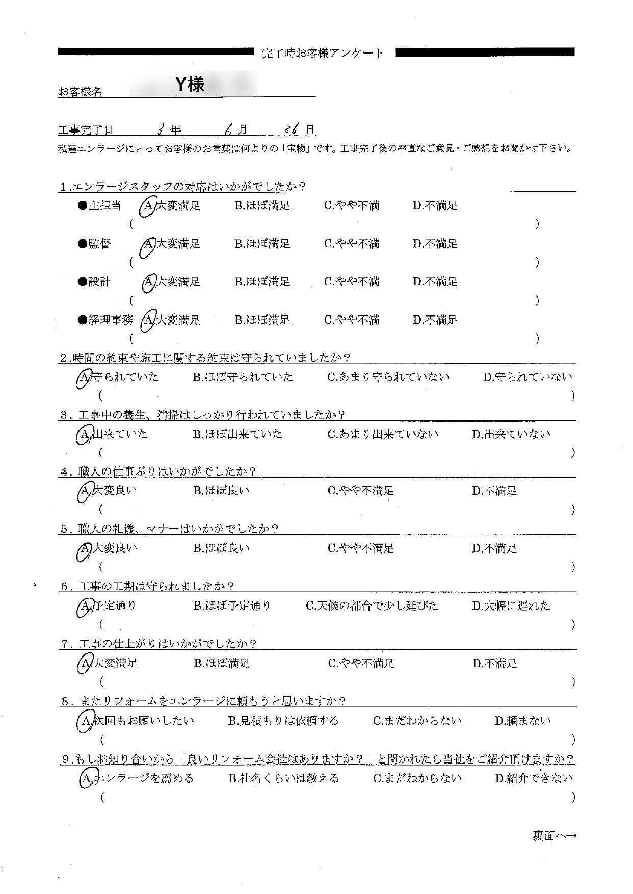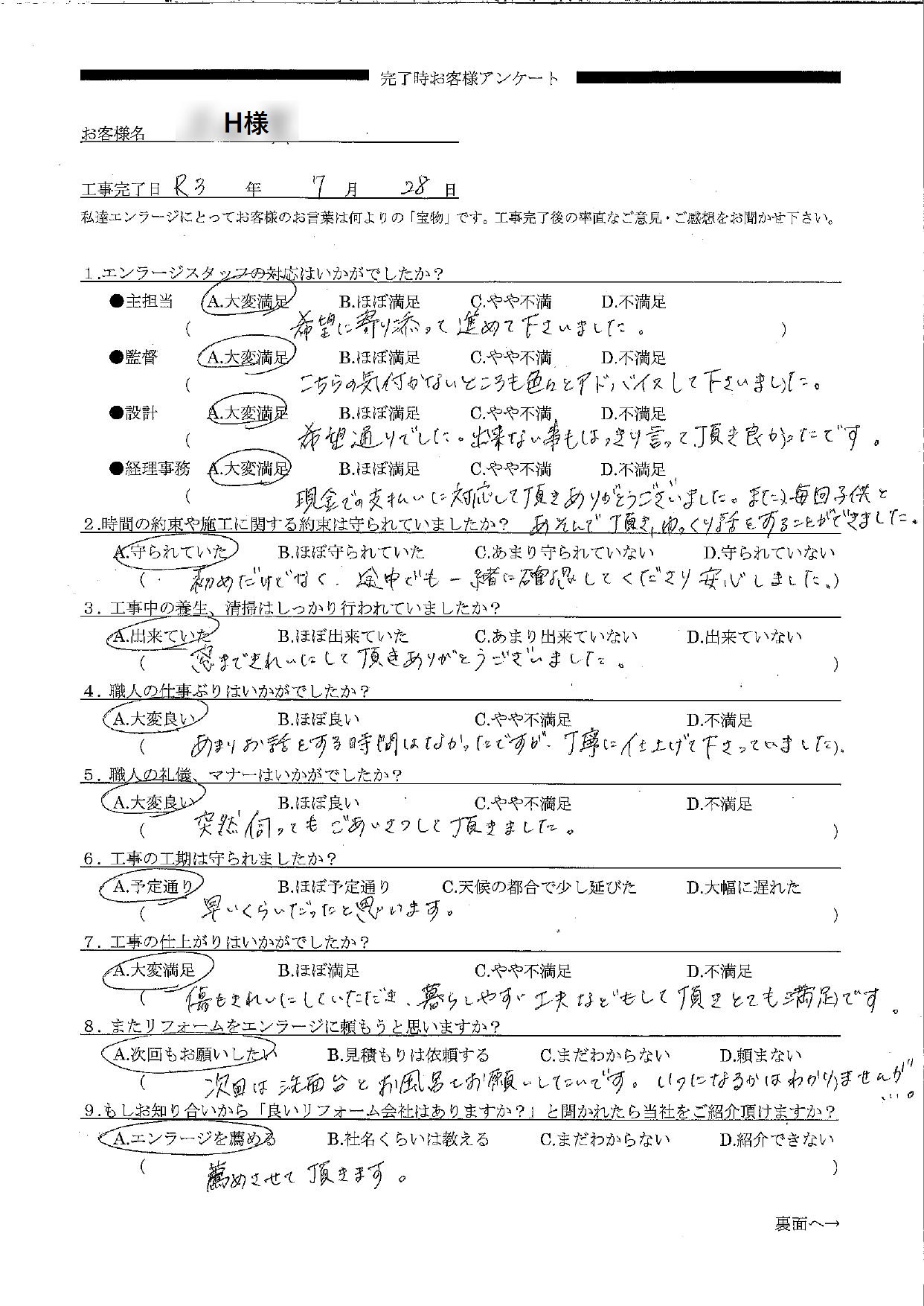 H様 この度はエンラージに浴室・洗面台交換工事をお任せいただきありがとうございました。年明けのコロナ禍真っ只中での打合せ・ショールーム見学・在宅工事等、可能な限りH様ご家族様にご負担・ご不便なく安心してお任せいただけるようスタッフ一同、精一杯務めさせていただきました。オールAのアンケートと温かいコメントを頂戴でき、大変嬉しく思っております。H様からのコメントを励みに今後も頑張っていきたいと思います。お忙しい中、アンケートにご協力いただき本当にありがとうございました。お近くまでお越しの際はぜひ、お茶をしに行く感覚でお気軽にお立ち寄りくださいませ。今後ともよろしくお願いいたします。 プランナー伊藤