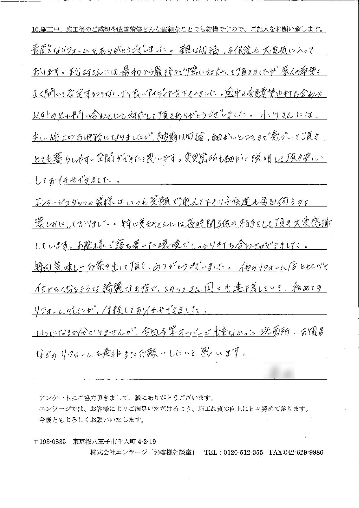 A様 この度はキッチン・浴室・洗面台・トイレの交換と内装工事を当社にお任せいただき、ありがとうございました。A様は当社のホームページをじっくり見てからのお問合せだったため、当初からとても好意的に接して頂けました。ほぼ全面のリフォーム工事で、お住まいになりながらの施工でしたので、ご不便も多かった事と思います。完成をとても喜んで下さり、私も心から嬉しかったです!またお気軽に日野支店にお立ち寄りください。いつでもお待ちしております。 プランナー 前田