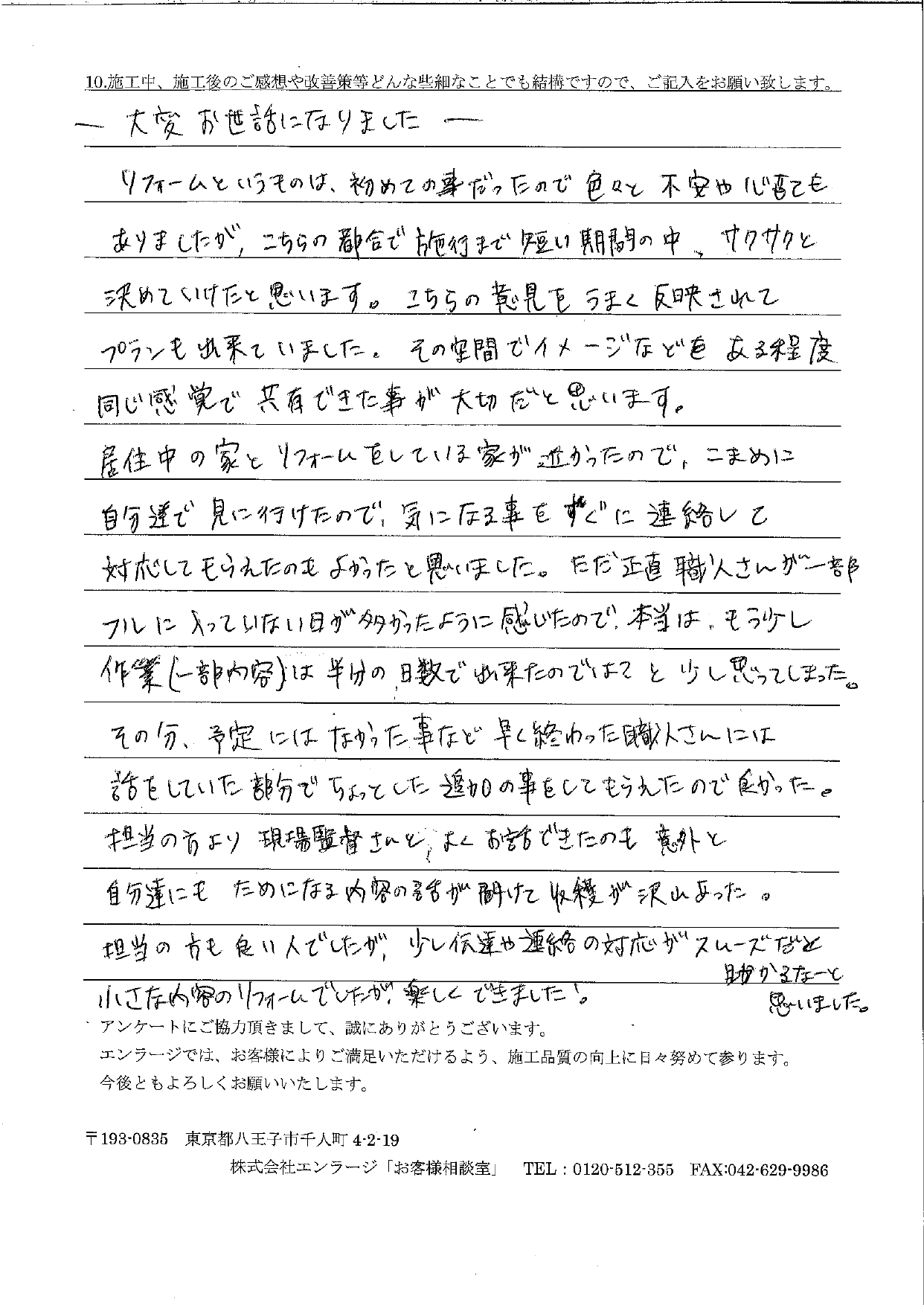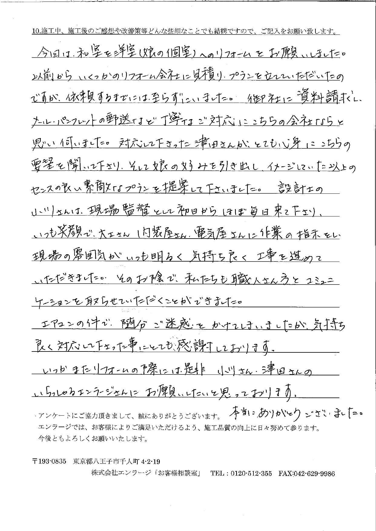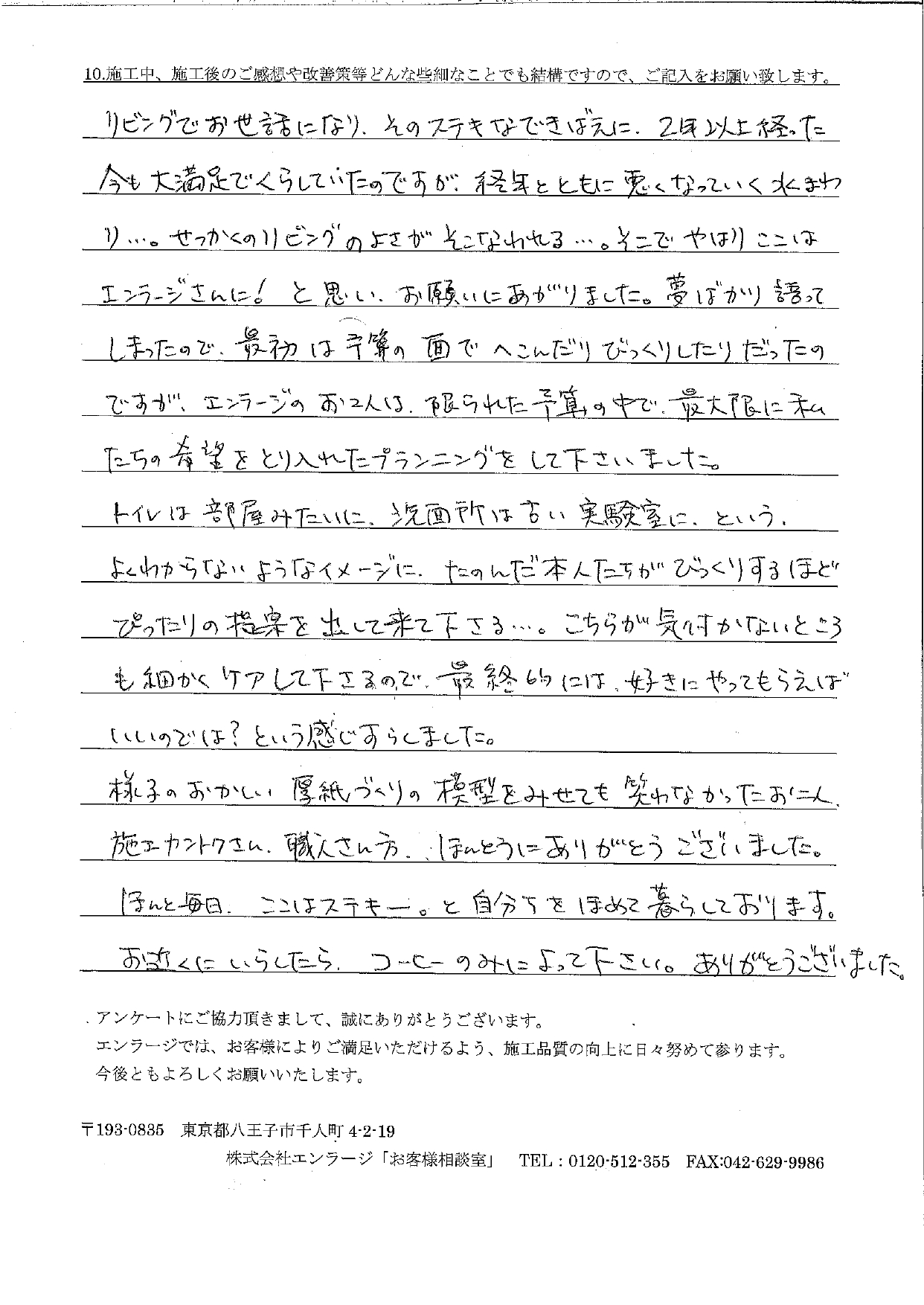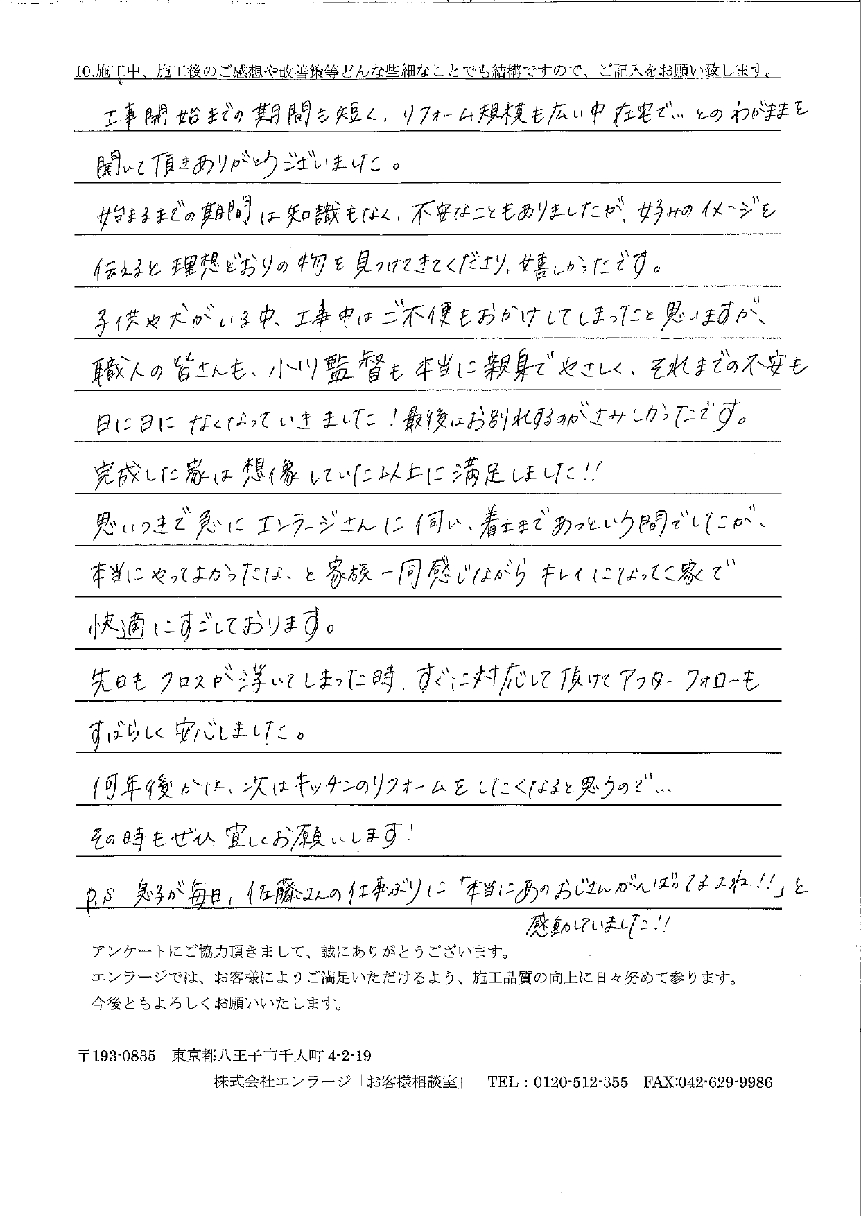 T様、この度は大切なご自宅の全面リフォームをお任せいただきありがとうございました。工事期間中、現場の事は『すべてお任せします。』とおっしゃっていただき、嬉しい気持ちと同時に強い責任感を感じました。完工時に『やっぱりエンラージさんにお任せしてよかった。』と言っていただけたことが大きな自信になりました。本当にありがとうございました。今後とも末永いお付き合いをよろしくお願い致します。プランナー鈴木