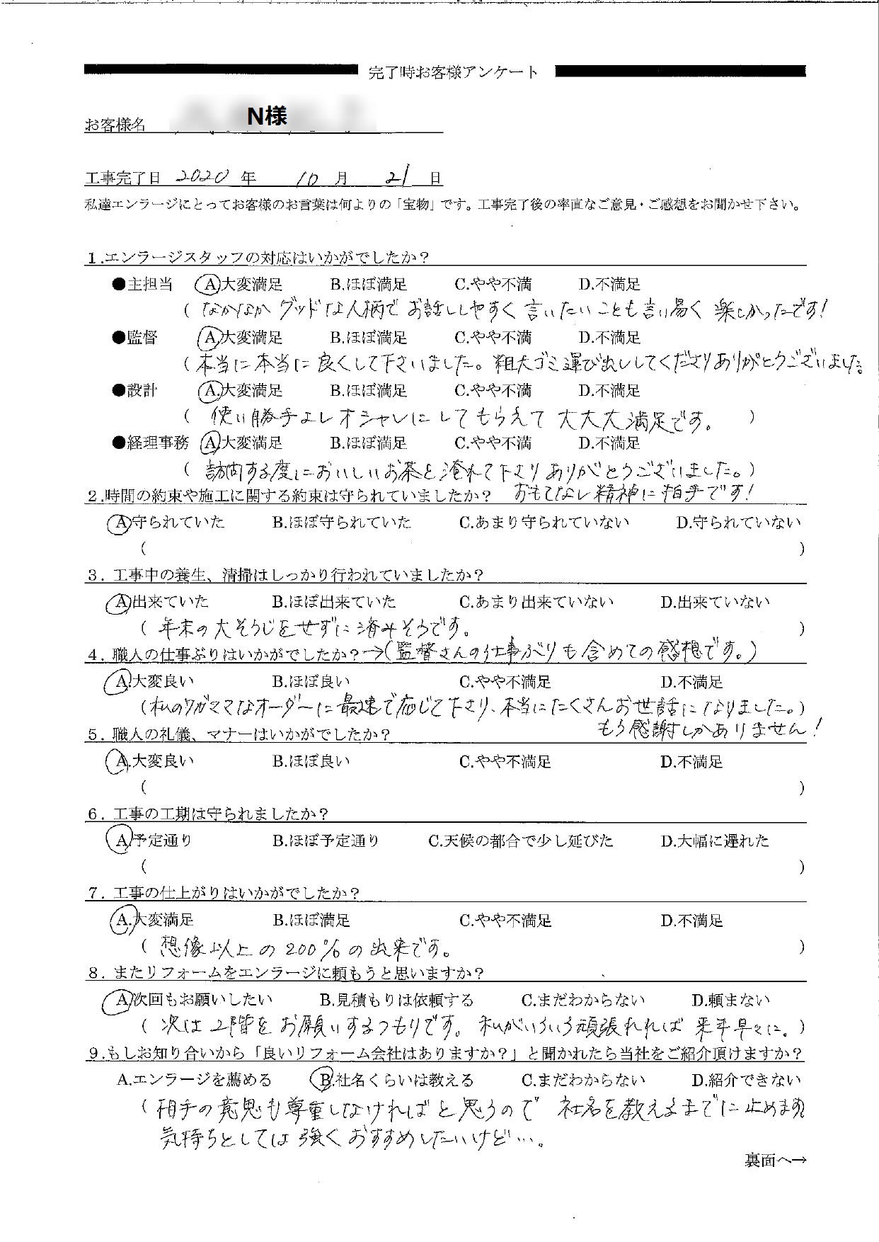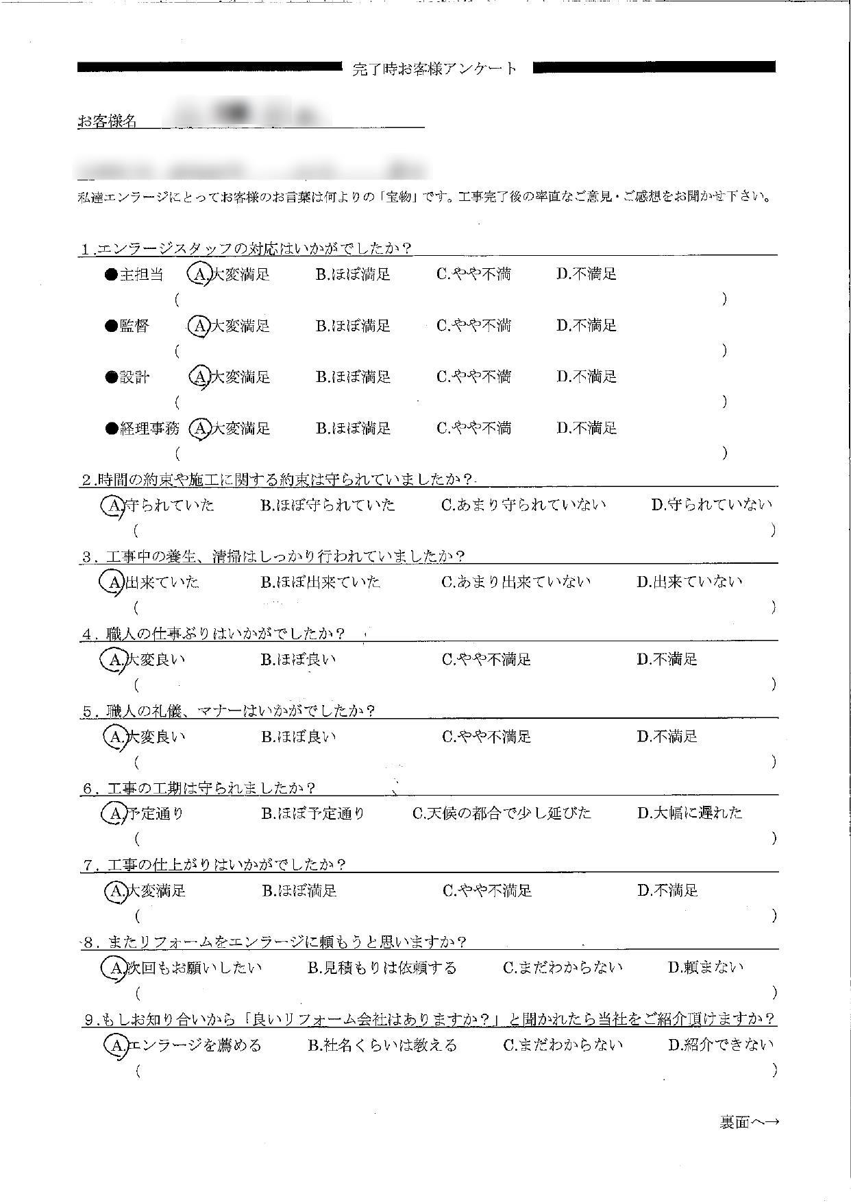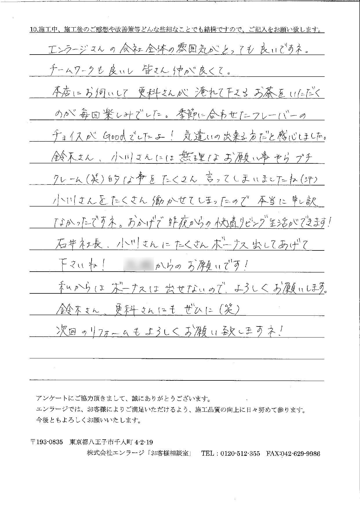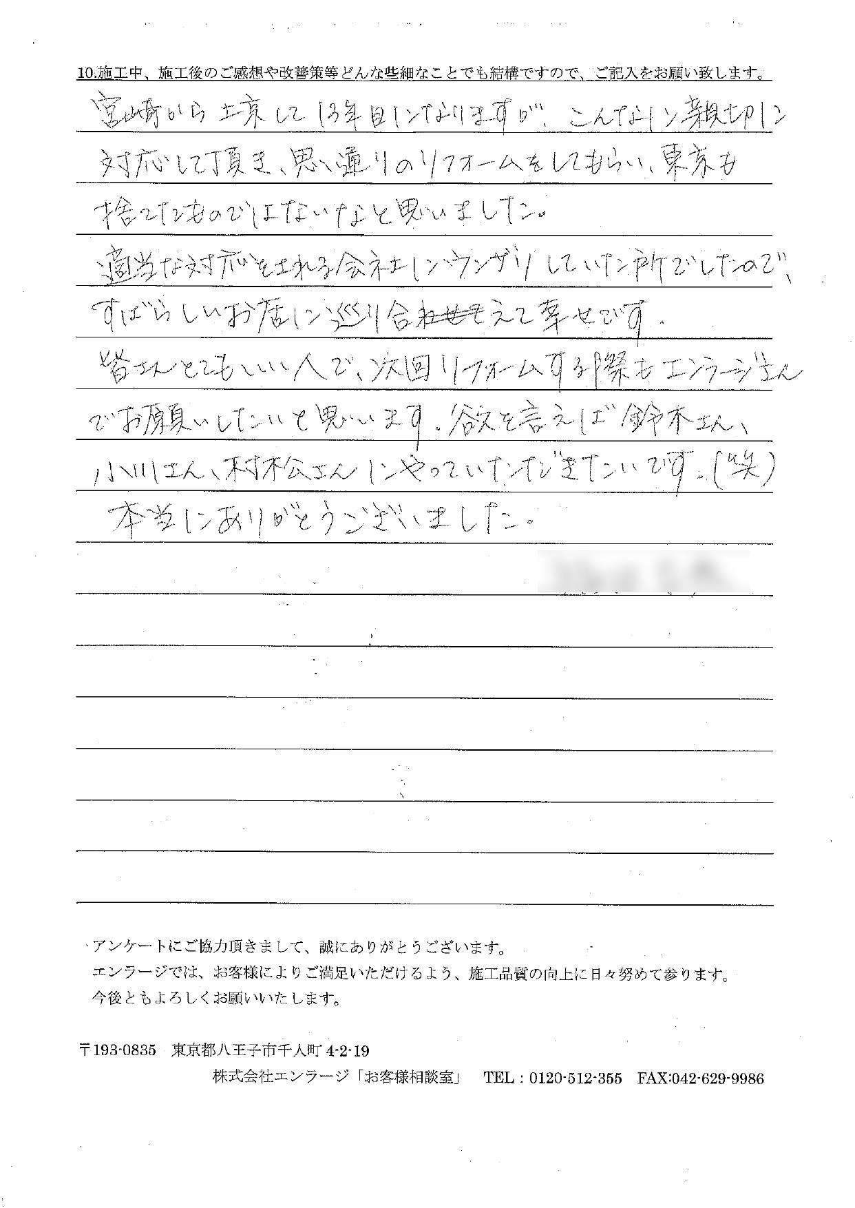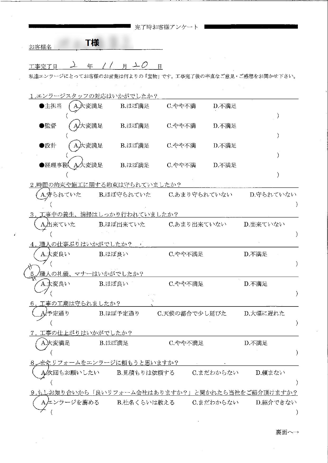 T様、この度は大切なご自宅の全面リフォームをお任せいただきありがとうございました。工事期間中、現場の事は『すべてお任せします。』とおっしゃっていただき、嬉しい気持ちと同時に強い責任感を感じました。完工時に『やっぱりエンラージさんにお任せしてよかった。』と言っていただけたことが大きな自信になりました。本当にありがとうございました。今後とも末永いお付き合いをよろしくお願い致します。プランナー鈴木
