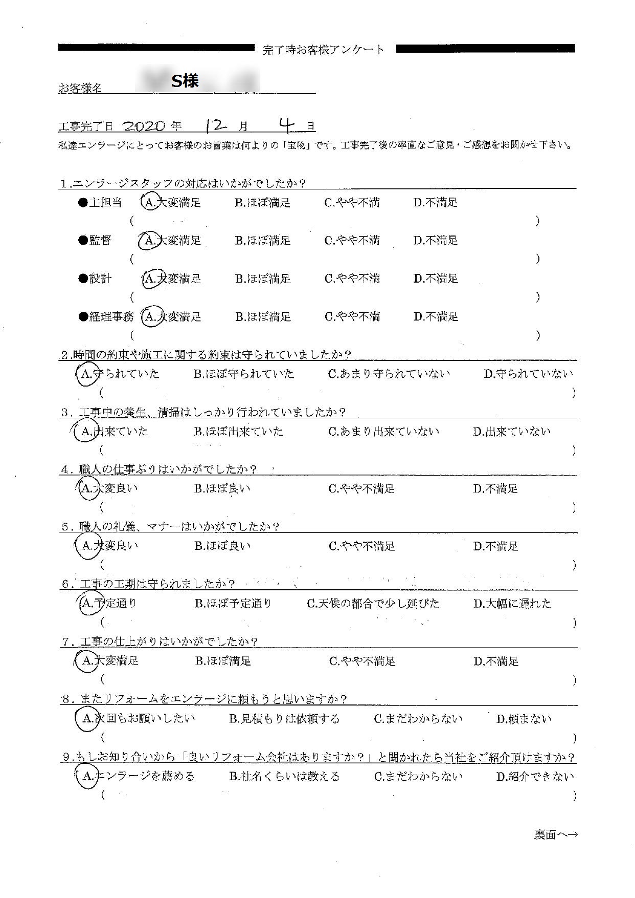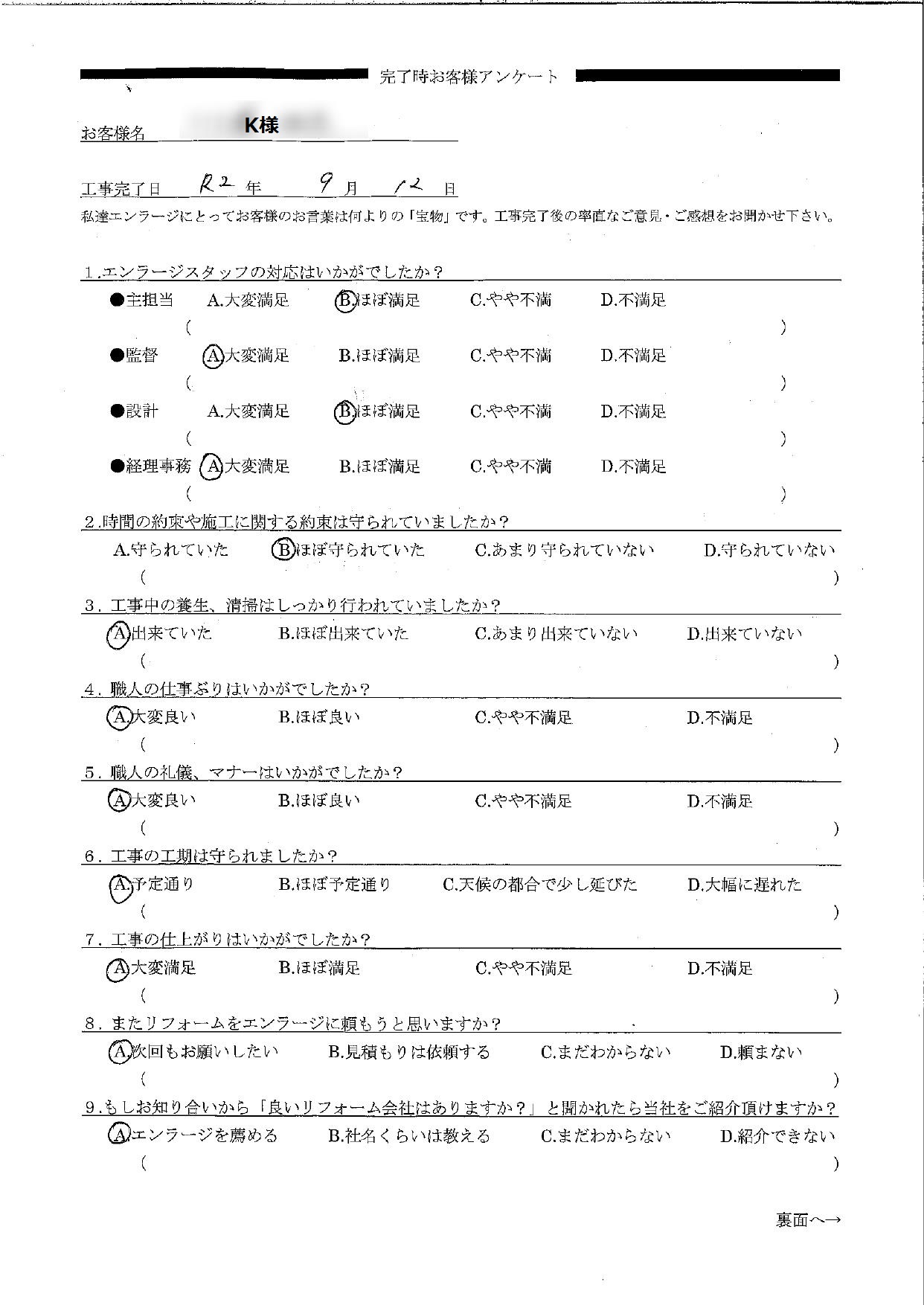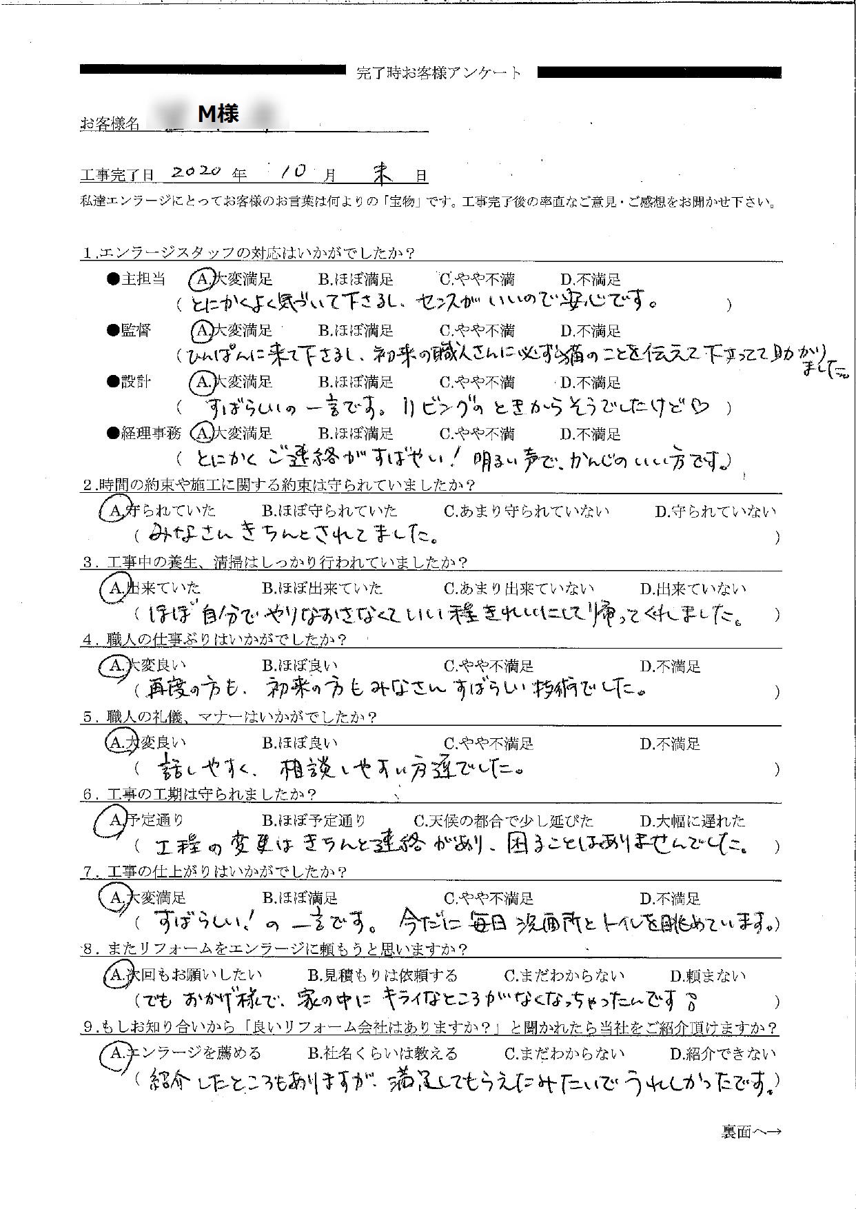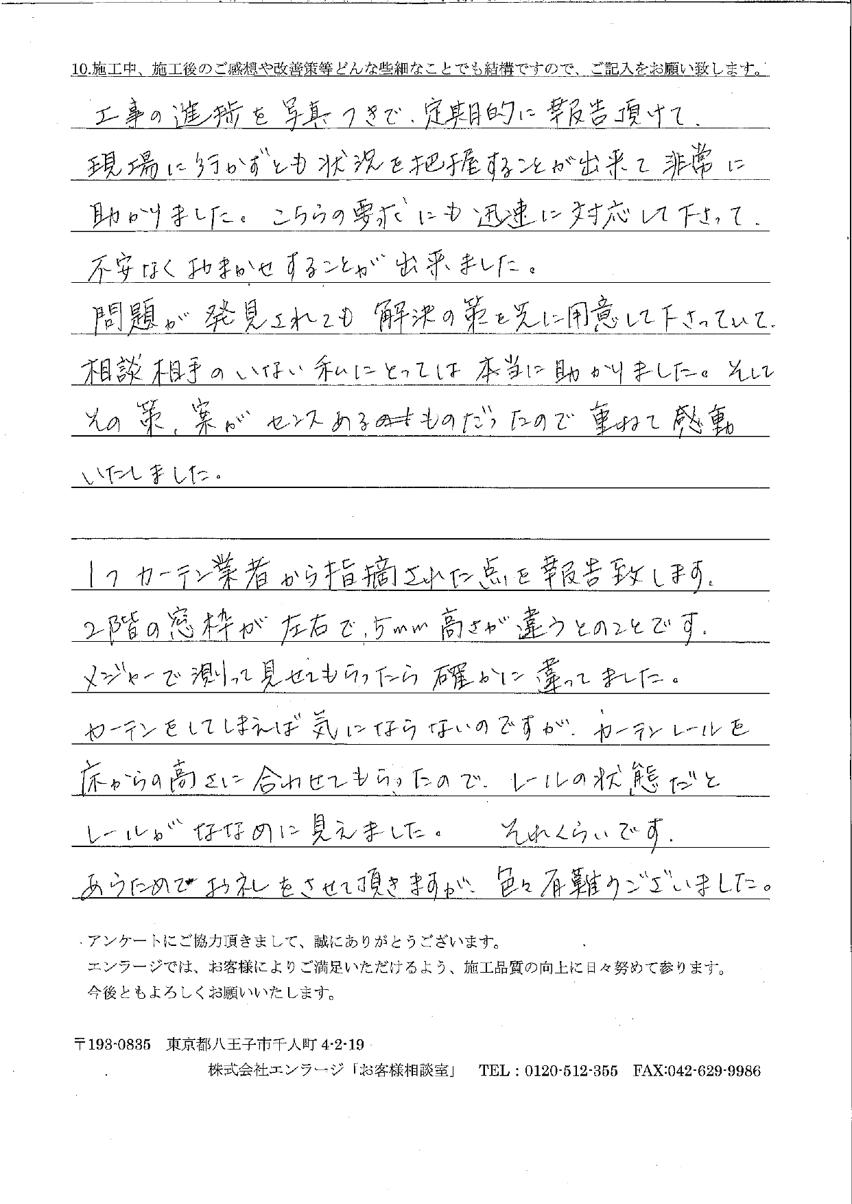 T様、この度は大切なご自宅の全面リフォームをお任せいただきありがとうございました。工事期間中、現場の事は『すべてお任せします。』とおっしゃっていただき、嬉しい気持ちと同時に強い責任感を感じました。完工時に『やっぱりエンラージさんにお任せしてよかった。』と言っていただけたことが大きな自信になりました。本当にありがとうございました。今後とも末永いお付き合いをよろしくお願い致します。プランナー鈴木